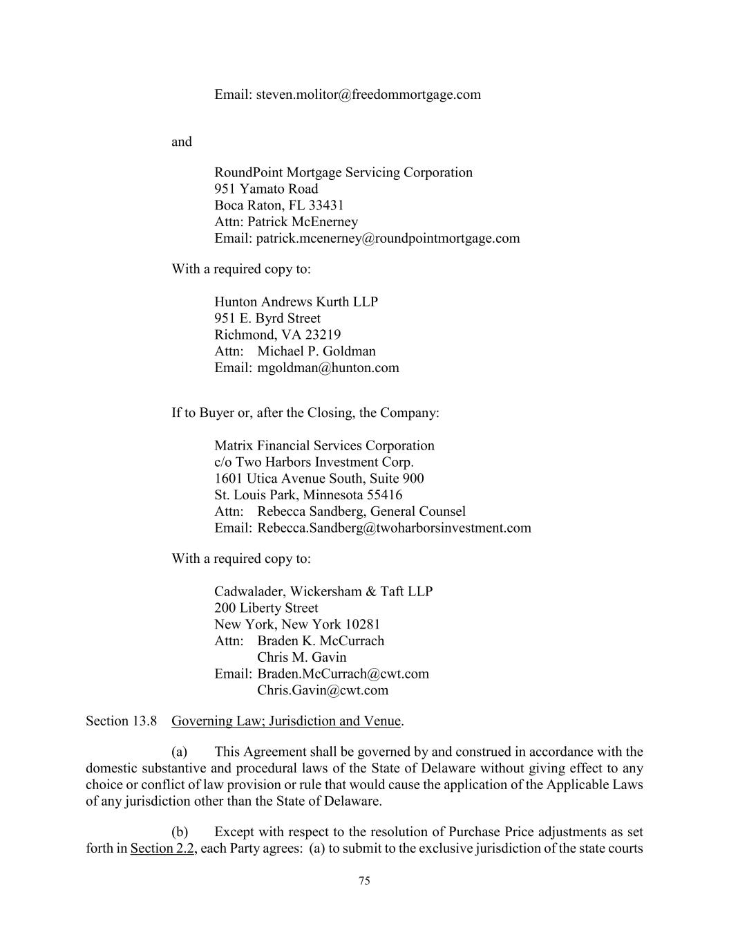 75 Email: steven.molitor@freedommortgage.com and RoundPoint Mortgage Servicing Corporation 951 Yamato Road Boca Raton, FL 33431 Attn: Patrick McEnerney Email: patrick.mcenerney@roundpointmortgage.com With a required copy to: Hunton Andrews Kurth LLP 951 E. Byrd Street Richmond, VA 23219 Attn: Michael P. Goldman Email: mgoldman@hunton.com If to Buyer or, after the Closing, the Company: Matrix Financial Services Corporation c/o Two Harbors Investment Corp. 1601 Utica Avenue South, Suite 900 St. Louis Park, Minnesota 55416 Attn: Rebecca Sandberg, General Counsel Email: Rebecca.Sandberg@twoharborsinvestment.com With a required copy to: Cadwalader, Wickersham & Taft LLP 200 Liberty Street New York, New York 10281 Attn: Braden K. McCurrach Chris M. Gavin Email: Braden.McCurrach@cwt.com Chris.Gavin@cwt.com Section 13.8 Governing Law; Jurisdiction and Venue. (a) This Agreement shall be governed by and construed in accordance with the domestic substantive and procedural laws of the State of Delaware without giving effect to any choice or conflict of law provision or rule that would cause the application of the Applicable Laws of any jurisdiction other than the State of Delaware. (b) Except with respect to the resolution of Purchase Price adjustments as set forth in Section 2.2, each Party agrees: (a) to submit to the exclusive jurisdiction of the state courts