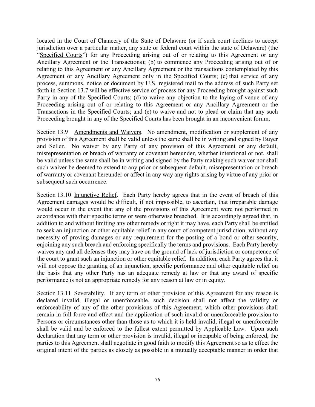 76 located in the Court of Chancery of the State of Delaware (or if such court declines to accept jurisdiction over a particular matter, any state or federal court within the state of Delaware) (the “Specified Courts”) for any Proceeding arising out of or relating to this Agreement or any Ancillary Agreement or the Transactions); (b) to commence any Proceeding arising out of or relating to this Agreement or any Ancillary Agreement or the transactions contemplated by this Agreement or any Ancillary Agreement only in the Specified Courts; (c) that service of any process, summons, notice or document by U.S. registered mail to the address of such Party set forth in Section 13.7 will be effective service of process for any Proceeding brought against such Party in any of the Specified Courts; (d) to waive any objection to the laying of venue of any Proceeding arising out of or relating to this Agreement or any Ancillary Agreement or the Transactions in the Specified Courts; and (e) to waive and not to plead or claim that any such Proceeding brought in any of the Specified Courts has been brought in an inconvenient forum. Section 13.9 Amendments and Waivers. No amendment, modification or supplement of any provision of this Agreement shall be valid unless the same shall be in writing and signed by Buyer and Seller. No waiver by any Party of any provision of this Agreement or any default, misrepresentation or breach of warranty or covenant hereunder, whether intentional or not, shall be valid unless the same shall be in writing and signed by the Party making such waiver nor shall such waiver be deemed to extend to any prior or subsequent default, misrepresentation or breach of warranty or covenant hereunder or affect in any way any rights arising by virtue of any prior or subsequent such occurrence. Section 13.10 Injunctive Relief. Each Party hereby agrees that in the event of breach of this Agreement damages would be difficult, if not impossible, to ascertain, that irreparable damage would occur in the event that any of the provisions of this Agreement were not performed in accordance with their specific terms or were otherwise breached. It is accordingly agreed that, in addition to and without limiting any other remedy or right it may have, each Party shall be entitled to seek an injunction or other equitable relief in any court of competent jurisdiction, without any necessity of proving damages or any requirement for the posting of a bond or other security, enjoining any such breach and enforcing specifically the terms and provisions. Each Party hereby waives any and all defenses they may have on the ground of lack of jurisdiction or competence of the court to grant such an injunction or other equitable relief. In addition, each Party agrees that it will not oppose the granting of an injunction, specific performance and other equitable relief on the basis that any other Party has an adequate remedy at law or that any award of specific performance is not an appropriate remedy for any reason at law or in equity. Section 13.11 Severability. If any term or other provision of this Agreement for any reason is declared invalid, illegal or unenforceable, such decision shall not affect the validity or enforceability of any of the other provisions of this Agreement, which other provisions shall remain in full force and effect and the application of such invalid or unenforceable provision to Persons or circumstances other than those as to which it is held invalid, illegal or unenforceable shall be valid and be enforced to the fullest extent permitted by Applicable Law. Upon such declaration that any term or other provision is invalid, illegal or incapable of being enforced, the parties to this Agreement shall negotiate in good faith to modify this Agreement so as to effect the original intent of the parties as closely as possible in a mutually acceptable manner in order that