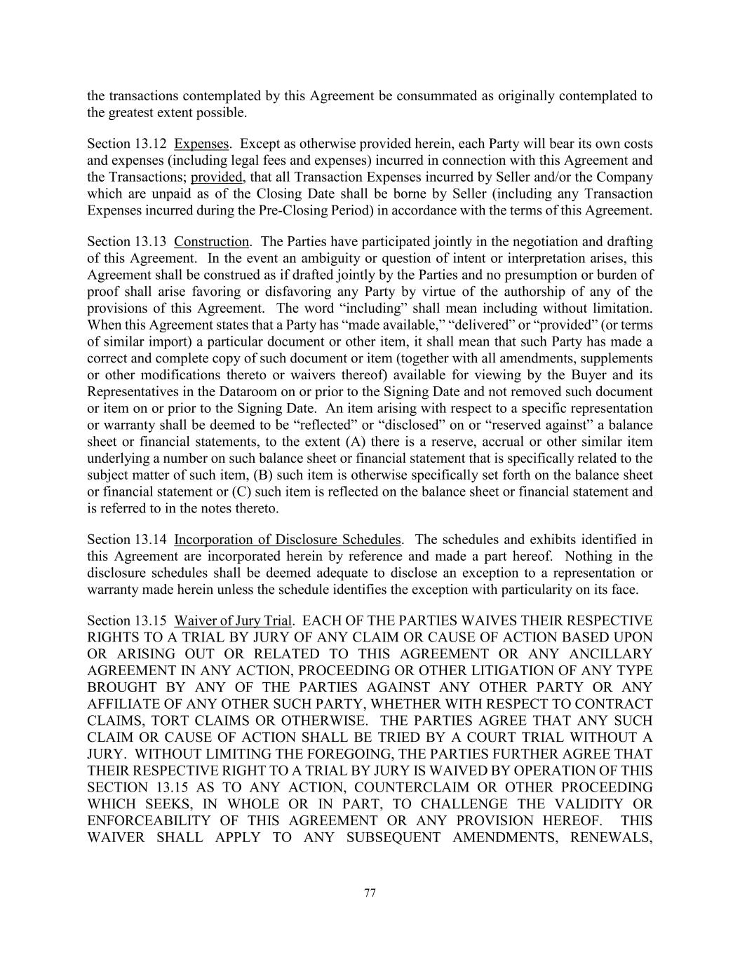 77 the transactions contemplated by this Agreement be consummated as originally contemplated to the greatest extent possible. Section 13.12 Expenses. Except as otherwise provided herein, each Party will bear its own costs and expenses (including legal fees and expenses) incurred in connection with this Agreement and the Transactions; provided, that all Transaction Expenses incurred by Seller and/or the Company which are unpaid as of the Closing Date shall be borne by Seller (including any Transaction Expenses incurred during the Pre-Closing Period) in accordance with the terms of this Agreement. Section 13.13 Construction. The Parties have participated jointly in the negotiation and drafting of this Agreement. In the event an ambiguity or question of intent or interpretation arises, this Agreement shall be construed as if drafted jointly by the Parties and no presumption or burden of proof shall arise favoring or disfavoring any Party by virtue of the authorship of any of the provisions of this Agreement. The word “including” shall mean including without limitation. When this Agreement states that a Party has “made available,” “delivered” or “provided” (or terms of similar import) a particular document or other item, it shall mean that such Party has made a correct and complete copy of such document or item (together with all amendments, supplements or other modifications thereto or waivers thereof) available for viewing by the Buyer and its Representatives in the Dataroom on or prior to the Signing Date and not removed such document or item on or prior to the Signing Date. An item arising with respect to a specific representation or warranty shall be deemed to be “reflected” or “disclosed” on or “reserved against” a balance sheet or financial statements, to the extent (A) there is a reserve, accrual or other similar item underlying a number on such balance sheet or financial statement that is specifically related to the subject matter of such item, (B) such item is otherwise specifically set forth on the balance sheet or financial statement or (C) such item is reflected on the balance sheet or financial statement and is referred to in the notes thereto. Section 13.14 Incorporation of Disclosure Schedules. The schedules and exhibits identified in this Agreement are incorporated herein by reference and made a part hereof. Nothing in the disclosure schedules shall be deemed adequate to disclose an exception to a representation or warranty made herein unless the schedule identifies the exception with particularity on its face. Section 13.15 Waiver of Jury Trial. EACH OF THE PARTIES WAIVES THEIR RESPECTIVE RIGHTS TO A TRIAL BY JURY OF ANY CLAIM OR CAUSE OF ACTION BASED UPON OR ARISING OUT OR RELATED TO THIS AGREEMENT OR ANY ANCILLARY AGREEMENT IN ANY ACTION, PROCEEDING OR OTHER LITIGATION OF ANY TYPE BROUGHT BY ANY OF THE PARTIES AGAINST ANY OTHER PARTY OR ANY AFFILIATE OF ANY OTHER SUCH PARTY, WHETHER WITH RESPECT TO CONTRACT CLAIMS, TORT CLAIMS OR OTHERWISE. THE PARTIES AGREE THAT ANY SUCH CLAIM OR CAUSE OF ACTION SHALL BE TRIED BY A COURT TRIAL WITHOUT A JURY. WITHOUT LIMITING THE FOREGOING, THE PARTIES FURTHER AGREE THAT THEIR RESPECTIVE RIGHT TO A TRIAL BY JURY IS WAIVED BY OPERATION OF THIS SECTION 13.15 AS TO ANY ACTION, COUNTERCLAIM OR OTHER PROCEEDING WHICH SEEKS, IN WHOLE OR IN PART, TO CHALLENGE THE VALIDITY OR ENFORCEABILITY OF THIS AGREEMENT OR ANY PROVISION HEREOF. THIS WAIVER SHALL APPLY TO ANY SUBSEQUENT AMENDMENTS, RENEWALS,