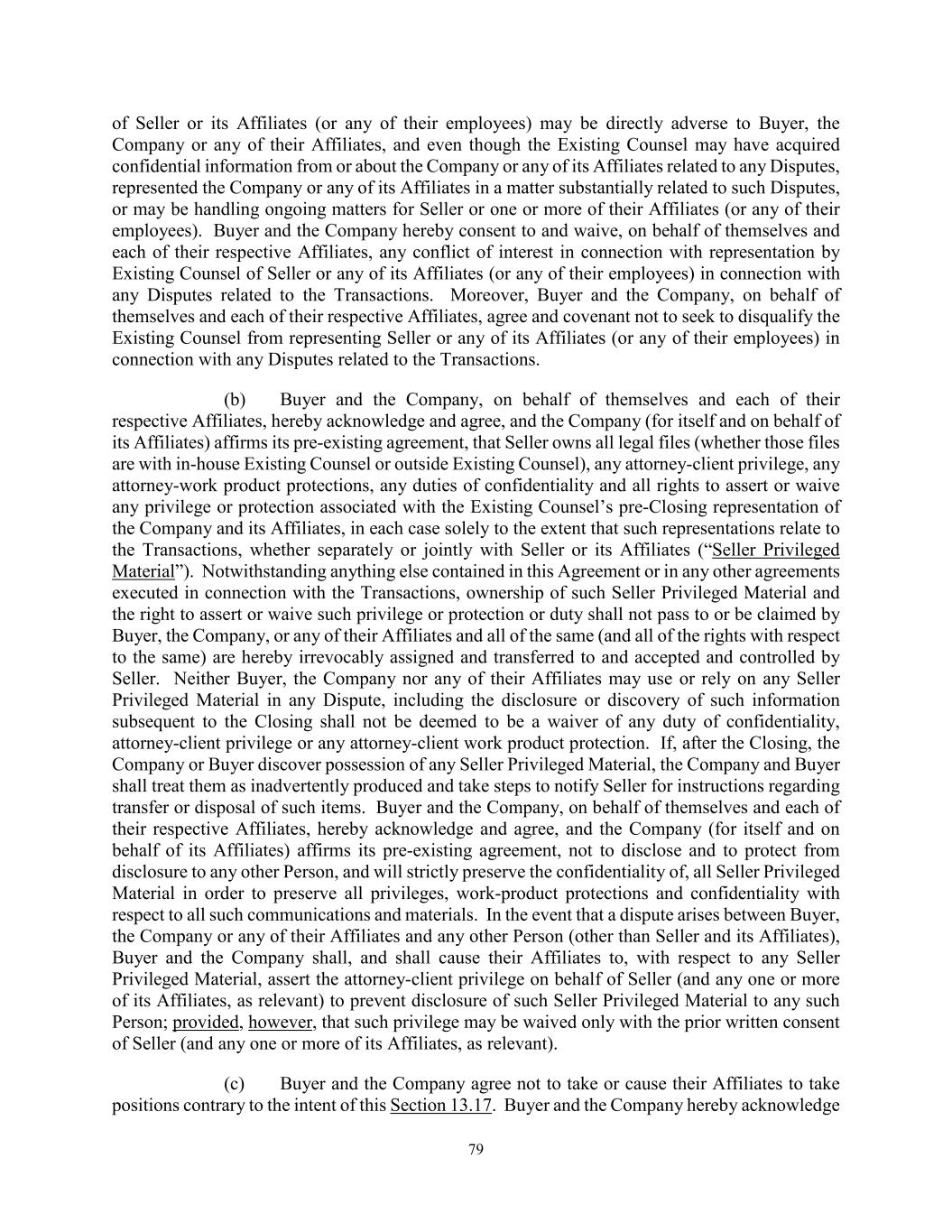 79 of Seller or its Affiliates (or any of their employees) may be directly adverse to Buyer, the Company or any of their Affiliates, and even though the Existing Counsel may have acquired confidential information from or about the Company or any of its Affiliates related to any Disputes, represented the Company or any of its Affiliates in a matter substantially related to such Disputes, or may be handling ongoing matters for Seller or one or more of their Affiliates (or any of their employees). Buyer and the Company hereby consent to and waive, on behalf of themselves and each of their respective Affiliates, any conflict of interest in connection with representation by Existing Counsel of Seller or any of its Affiliates (or any of their employees) in connection with any Disputes related to the Transactions. Moreover, Buyer and the Company, on behalf of themselves and each of their respective Affiliates, agree and covenant not to seek to disqualify the Existing Counsel from representing Seller or any of its Affiliates (or any of their employees) in connection with any Disputes related to the Transactions. (b) Buyer and the Company, on behalf of themselves and each of their respective Affiliates, hereby acknowledge and agree, and the Company (for itself and on behalf of its Affiliates) affirms its pre-existing agreement, that Seller owns all legal files (whether those files are with in-house Existing Counsel or outside Existing Counsel), any attorney-client privilege, any attorney-work product protections, any duties of confidentiality and all rights to assert or waive any privilege or protection associated with the Existing Counsel’s pre-Closing representation of the Company and its Affiliates, in each case solely to the extent that such representations relate to the Transactions, whether separately or jointly with Seller or its Affiliates (“Seller Privileged Material”). Notwithstanding anything else contained in this Agreement or in any other agreements executed in connection with the Transactions, ownership of such Seller Privileged Material and the right to assert or waive such privilege or protection or duty shall not pass to or be claimed by Buyer, the Company, or any of their Affiliates and all of the same (and all of the rights with respect to the same) are hereby irrevocably assigned and transferred to and accepted and controlled by Seller. Neither Buyer, the Company nor any of their Affiliates may use or rely on any Seller Privileged Material in any Dispute, including the disclosure or discovery of such information subsequent to the Closing shall not be deemed to be a waiver of any duty of confidentiality, attorney-client privilege or any attorney-client work product protection. If, after the Closing, the Company or Buyer discover possession of any Seller Privileged Material, the Company and Buyer shall treat them as inadvertently produced and take steps to notify Seller for instructions regarding transfer or disposal of such items. Buyer and the Company, on behalf of themselves and each of their respective Affiliates, hereby acknowledge and agree, and the Company (for itself and on behalf of its Affiliates) affirms its pre-existing agreement, not to disclose and to protect from disclosure to any other Person, and will strictly preserve the confidentiality of, all Seller Privileged Material in order to preserve all privileges, work-product protections and confidentiality with respect to all such communications and materials. In the event that a dispute arises between Buyer, the Company or any of their Affiliates and any other Person (other than Seller and its Affiliates), Buyer and the Company shall, and shall cause their Affiliates to, with respect to any Seller Privileged Material, assert the attorney-client privilege on behalf of Seller (and any one or more of its Affiliates, as relevant) to prevent disclosure of such Seller Privileged Material to any such Person; provided, however, that such privilege may be waived only with the prior written consent of Seller (and any one or more of its Affiliates, as relevant). (c) Buyer and the Company agree not to take or cause their Affiliates to take positions contrary to the intent of this Section 13.17. Buyer and the Company hereby acknowledge