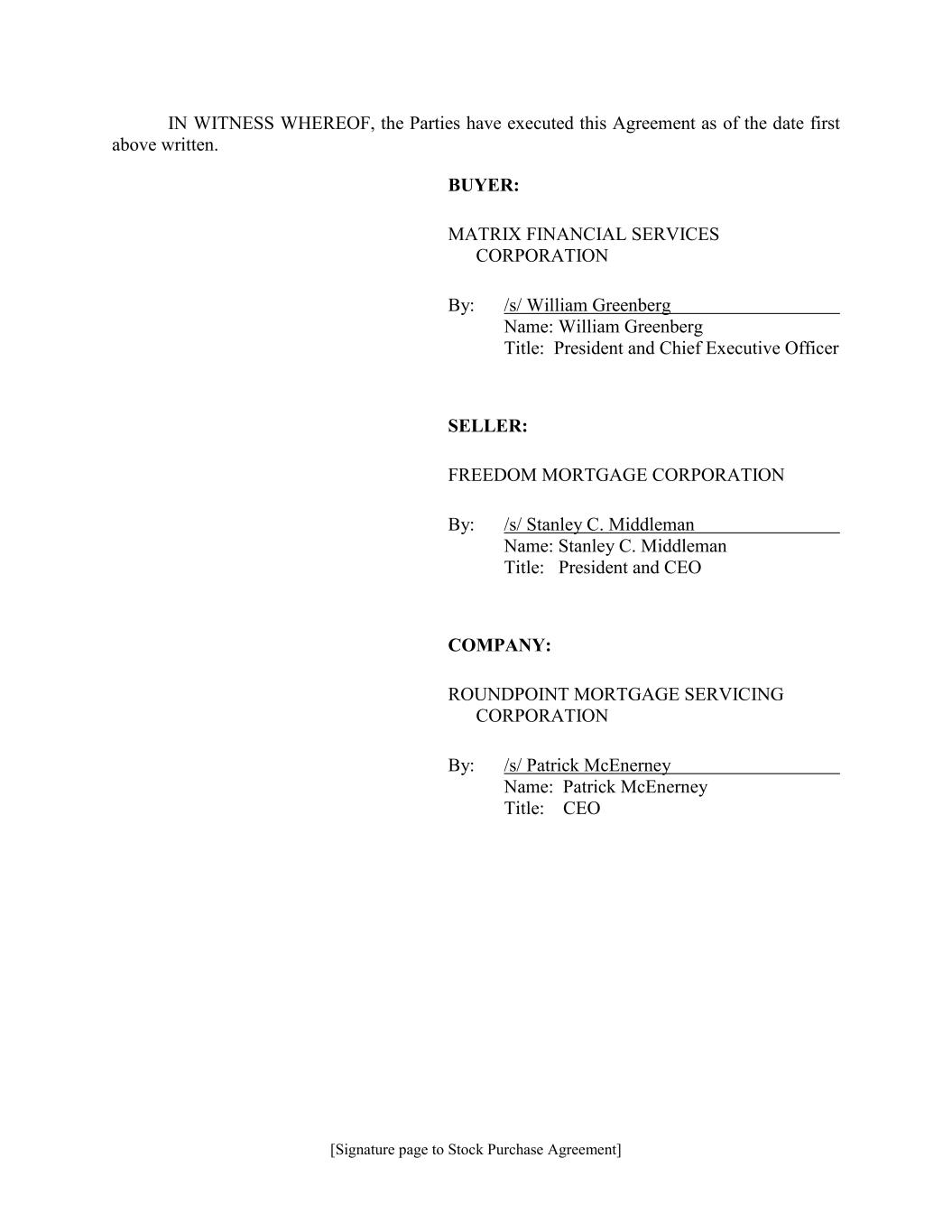 [Signature page to Stock Purchase Agreement] IN WITNESS WHEREOF, the Parties have executed this Agreement as of the date first above written. BUYER: MATRIX FINANCIAL SERVICES CORPORATION By: /s/ William Greenberg Name: William Greenberg Title: President and Chief Executive Officer SELLER: FREEDOM MORTGAGE CORPORATION By: /s/ Stanley C. Middleman Name: Stanley C. Middleman Title: President and CEO COMPANY: ROUNDPOINT MORTGAGE SERVICING CORPORATION By: /s/ Patrick McEnerney Name: Patrick McEnerney Title: CEO