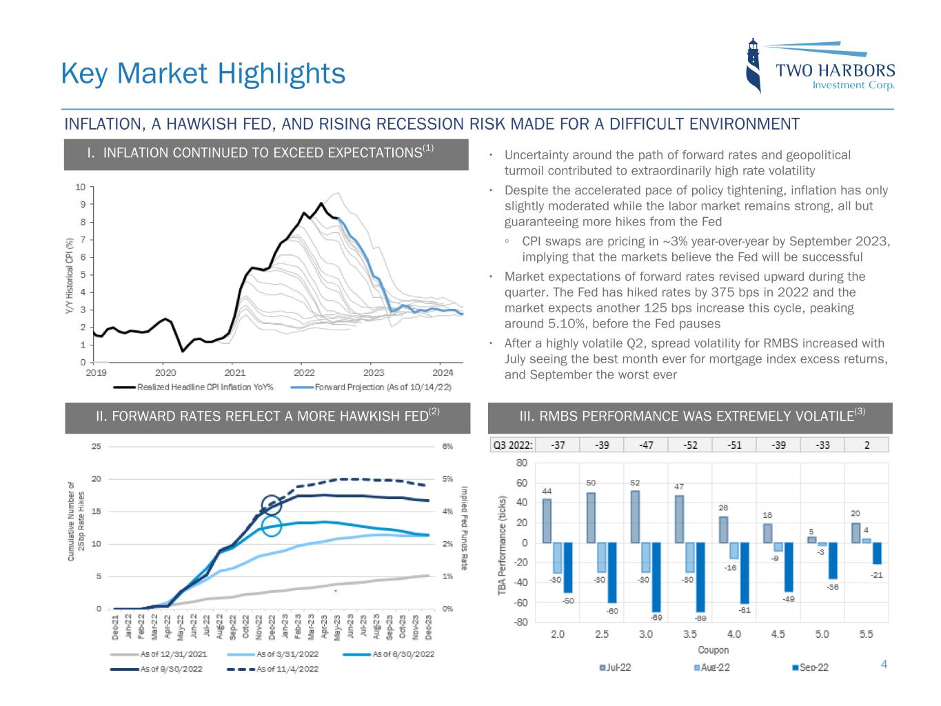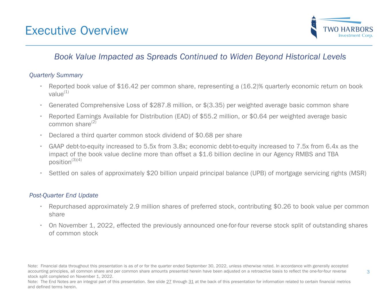 Safe Harbor Statement 2 FORWARD-LOOKING STATEMENTS This presentation includes “forward-looking statements” within the meaning of the safe harbor provisions of the United States Private Securities Litigation Reform Act of 1995. Actual results may differ from expectations, estimates and projections and, consequently, readers should not rely on these forward-looking statements as predictions of future events. Words such as “expect,” “target,” “assume,” “estimate,” “project,” “budget,” “forecast,” “anticipate,” “intend,” “plan,” “may,” “will,” “could,” “should,” “believe,” “predicts,” “potential,” “continue,” and similar expressions are intended to identify such forward-looking statements. These forward-looking statements involve significant risks and uncertainties that could cause actual results to differ materially from expected results, including, among other things, those described in our Annual Report on Form 10-K for the year ended December 31, 2021, and any subsequent Quarterly Reports on Form 10-Q, under the caption “Risk Factors.” Factors that could cause actual results to differ include, but are not limited to: the state of credit markets and general economic conditions; the ongoing impact of the COVID-19 pandemic, and the actions taken by federal and state governmental authorities and GSEs in response, on the U.S. economy, financial markets and our target assets; changes in interest rates and the market value of our assets; changes in prepayment rates of mortgages underlying our target assets; the rates of default or decreased recovery on the mortgages underlying our target assets; declines in home prices; our ability to establish, adjust and maintain appropriate hedges for the risks in our portfolio; the availability and cost of our target assets; the availability and cost of financing; changes in the competitive landscape within our industry; our ability to effectively execute and to realize the benefits of strategic transactions and initiatives we have pursued or may in the future pursue; our ability to recognize the benefits of our pending acquisition of RoundPoint Mortgage Servicing Corporation; our decision to terminate our management agreement with PRCM Advisers LLC and the ongoing litigation related to such termination; our ability to manage various operational risks and costs associated with our business; interruptions in or impairments to our communications and information technology systems; our ability to acquire mortgage servicing rights (MSR) and successfully operate our seller-servicer subsidiary and oversee our subservicers; the impact of any deficiencies in the servicing or foreclosure practices of third parties and related delays in the foreclosure process; our exposure to legal and regulatory claims; legislative and regulatory actions affecting our business; the impact of new or modified government mortgage refinance or principal reduction programs; our ability to maintain our REIT qualification; and limitations imposed on our business due to our REIT status and our exempt status under the Investment Company Act of 1940. Readers are cautioned not to place undue reliance upon any forward-looking statements, which speak only as of the date made. Two Harbors does not undertake or accept any obligation to release publicly any updates or revisions to any forward-looking statement to reflect any change in its expectations or any change in events, conditions or circumstances on which any such statement is based. Additional information concerning these and other risk factors is contained in Two Harbors’ most recent filings with the Securities and Exchange Commission (SEC). All subsequent written and oral forward-looking statements concerning Two Harbors or matters attributable to Two Harbors or any person acting on its behalf are expressly qualified in their entirety by the cautionary statements above. This presentation may include industry and market data obtained through research, surveys, and studies conducted by third parties and industry publications. We have not independently verified any such market and industry data from third-party sources. This presentation is provided for discussion purposes only and may not be relied upon as legal or investment advice, nor is it intended to be inclusive of all the risks and uncertainties that should be considered. This presentation does not constitute an offer to purchase or sell any securities, nor shall it be construed to be indicative of the terms of an offer that the parties or their respective affiliates would accept. Readers are advised that the financial information in this presentation is based on company data available at the time of this presentation and, in certain circumstances, may not have been audited by the company’s independent auditors.