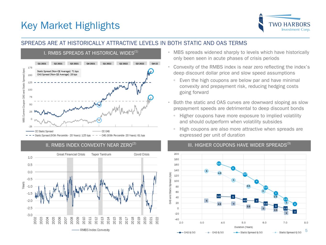 Key Market Highlights 4 II. FORWARD RATES REFLECT A MORE HAWKISH FED(2) I. INFLATION CONTINUED TO EXCEED EXPECTATIONS(1) III. RMBS PERFORMANCE WAS EXTREMELY VOLATILE(3) INFLATION, A HAWKISH FED, AND RISING RECESSION RISK MADE FOR A DIFFICULT ENVIRONMENT • Uncertainty around the path of forward rates and geopolitical turmoil contributed to extraordinarily high rate volatility • Despite the accelerated pace of policy tightening, inflation has only slightly moderated while the labor market remains strong, all but guaranteeing more hikes from the Fed ◦ CPI swaps are pricing in ~3% year-over-year by September 2023, implying that the markets believe the Fed will be successful • Market expectations of forward rates revised upward during the quarter. The Fed has hiked rates by 375 bps in 2022 and the market expects another 125 bps increase this cycle, peaking around 5.10%, before the Fed pauses • After a highly volatile Q2, spread volatility for RMBS increased with July seeing the best month ever for mortgage index excess returns, and September the worst ever