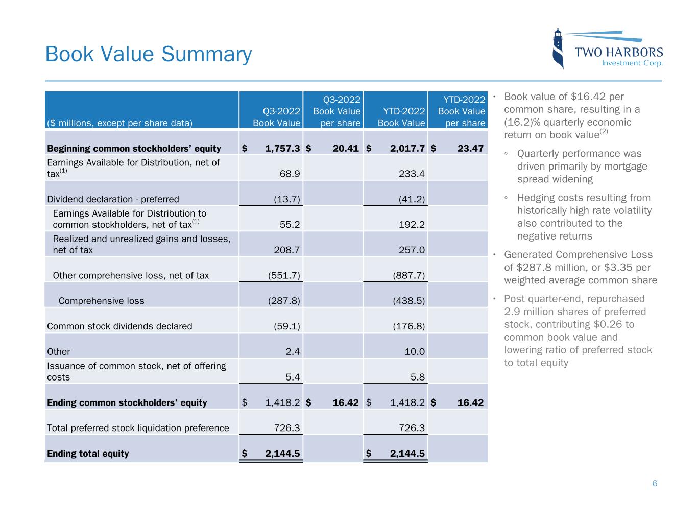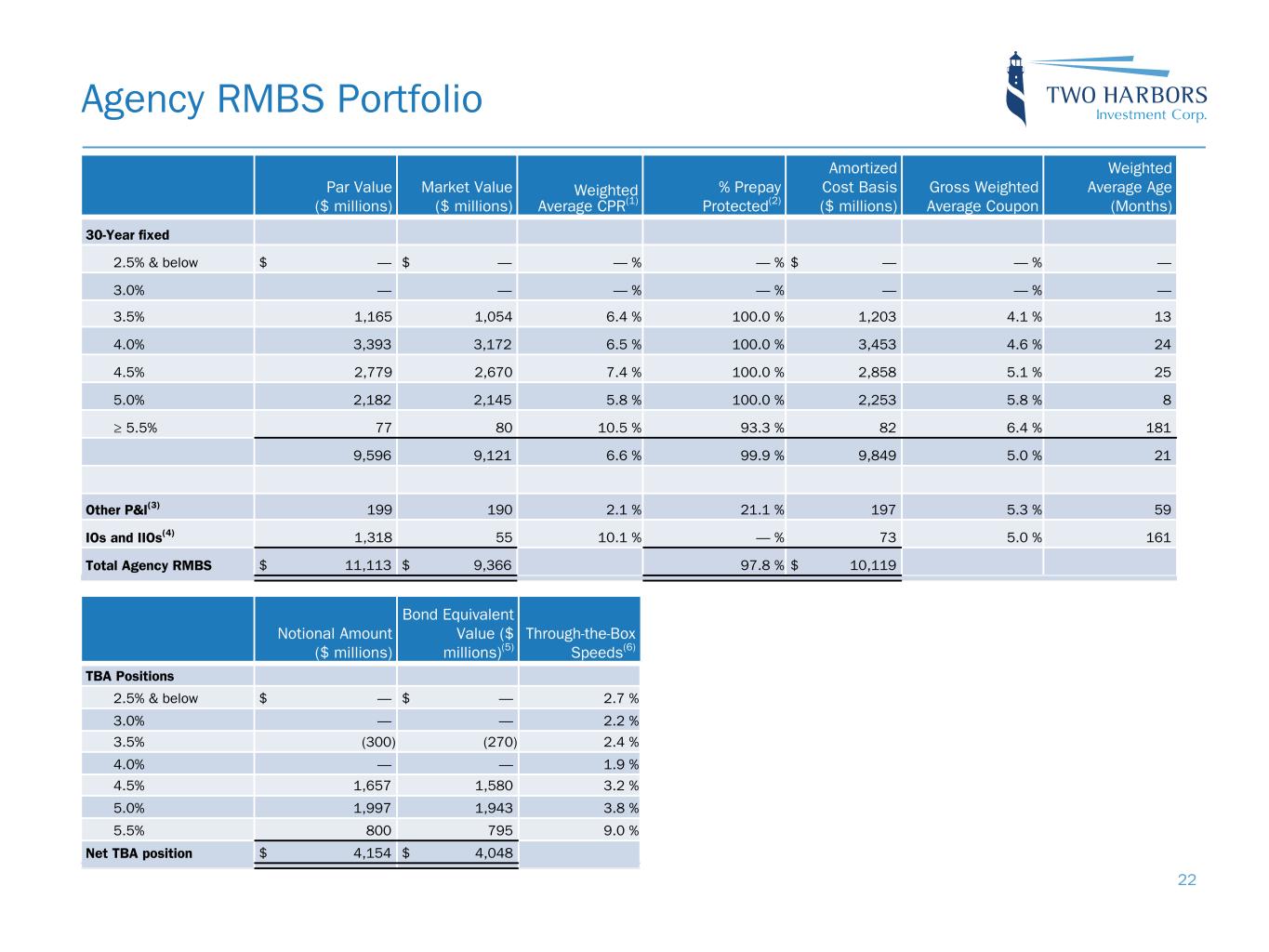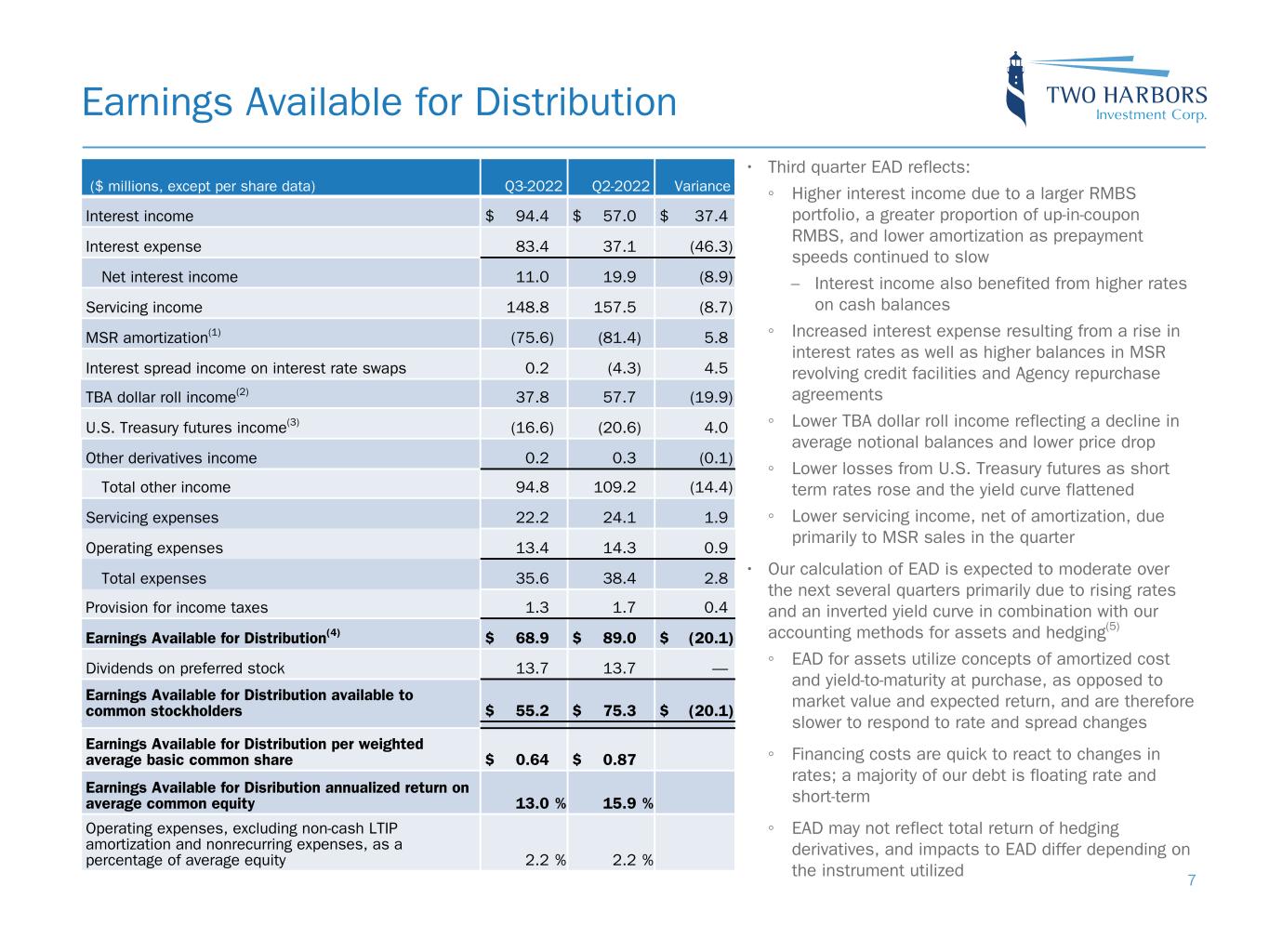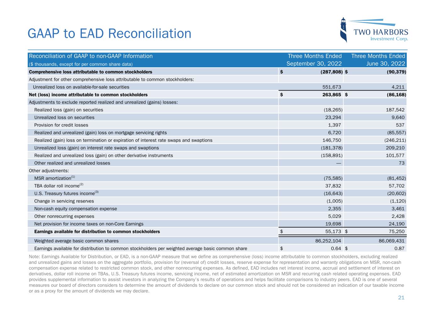 GAAP to EAD Reconciliation Reconciliation of GAAP to non-GAAP Information Three Months Ended Three Months Ended ($ thousands, except for per common share data) September 30, 2022 June 30, 2022 Comprehensive loss attributable to common stockholders $ (287,808) $ (90,379) Adjustment for other comprehensive loss attributable to common stockholders: Unrealized loss on available-for-sale securities 551,673 4,211 Net (loss) income attributable to common stockholders $ 263,865 $ (86,168) Adjustments to exclude reported realized and unrealized (gains) losses: Realized loss (gain) on securities (18,265) 187,542 Unrealized loss on securities 23,294 9,640 Provision for credit losses 1,397 537 Realized and unrealized (gain) loss on mortgage servicing rights 6,720 (85,557) Realized (gain) loss on termination or expiration of interest rate swaps and swaptions 146,750 (246,211) Unrealized loss (gain) on interest rate swaps and swaptions (181,378) 209,210 Realized and unrealized loss (gain) on other derivative instruments (158,891) 101,577 Other realized and unrealized losses — 73 Other adjustments: MSR amortization(1) (75,585) (81,452) TBA dollar roll income(2) 37,832 57,702 U.S. Treasury futures income(3) (16,643) (20,602) Change in servicing reserves (1,005) (1,120) Non-cash equity compensation expense 2,355 3,461 Other nonrecurring expenses 5,029 2,428 Net provision for income taxes on non-Core Earnings 19,698 24,190 Earnings available for distribution to common stockholders $ 55,173 $ 75,250 Weighted average basic common shares 86,252,104 86,069,431 Earnings available for distribution to common stockholders per weighted average basic common share $ 0.64 $ 0.87 21 Note: Earnings Available for Distribution, or EAD, is a non-GAAP measure that we define as comprehensive (loss) income attributable to common stockholders, excluding realized and unrealized gains and losses on the aggregate portfolio, provision for (reversal of) credit losses, reserve expense for representation and warranty obligations on MSR, non-cash compensation expense related to restricted common stock, and other nonrecurring expenses. As defined, EAD includes net interest income, accrual and settlement of interest on derivatives, dollar roll income on TBAs, U.S. Treasury futures income, servicing income, net of estimated amortization on MSR and recurring cash related operating expenses. EAD provides supplemental information to assist investors in analyzing the Company’s results of operations and helps facilitate comparisons to industry peers. EAD is one of several measures our board of directors considers to determine the amount of dividends to declare on our common stock and should not be considered an indication of our taxable income or as a proxy for the amount of dividends we may declare.