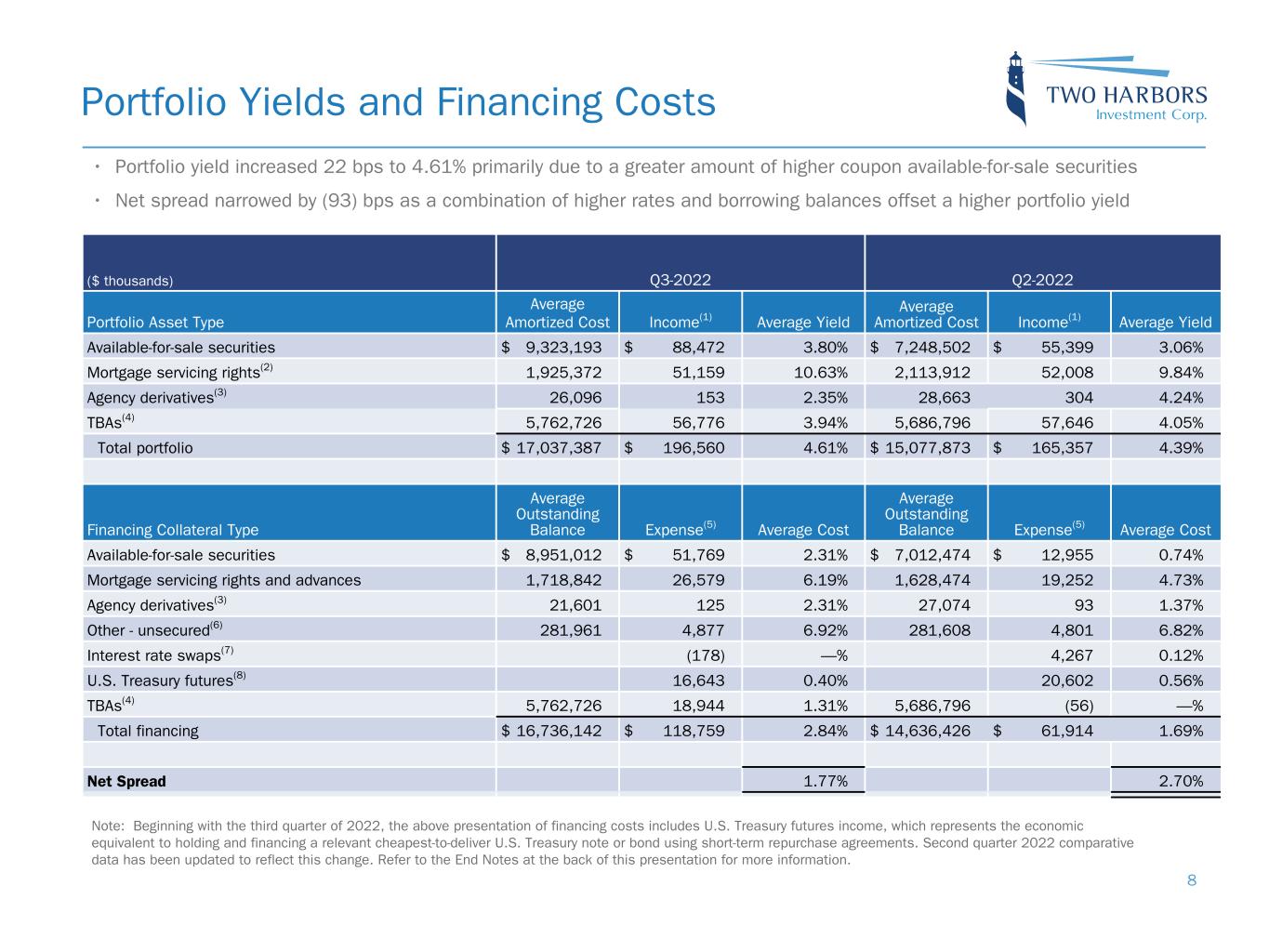 ($ millions, except per share data) Q3-2022 Q2-2022 Variance Interest income $ 94.4 $ 57.0 $ 37.4 Interest expense 83.4 37.1 (46.3) Net interest income 11.0 19.9 (8.9) Servicing income 148.8 157.5 (8.7) MSR amortization(1) (75.6) (81.4) 5.8 Interest spread income on interest rate swaps 0.2 (4.3) 4.5 TBA dollar roll income(2) 37.8 57.7 (19.9) U.S. Treasury futures income(3) (16.6) (20.6) 4.0 Other derivatives income 0.2 0.3 (0.1) Total other income 94.8 109.2 (14.4) Servicing expenses 22.2 24.1 1.9 Operating expenses 13.4 14.3 0.9 Total expenses 35.6 38.4 2.8 Provision for income taxes 1.3 1.7 0.4 Earnings Available for Distribution(4) $ 68.9 $ 89.0 $ (20.1) Dividends on preferred stock 13.7 13.7 — Earnings Available for Distribution available to common stockholders $ 55.2 $ 75.3 $ (20.1) Earnings Available for Distribution per weighted average basic common share $ 0.64 $ 0.87 Earnings Available for Disribution annualized return on average common equity 13.0 % 15.9 % Operating expenses, excluding non-cash LTIP amortization and nonrecurring expenses, as a percentage of average equity 2.2 % 2.2 % Earnings Available for Distribution 7 • Third quarter EAD reflects: ◦ Higher interest income due to a larger RMBS portfolio, a greater proportion of up-in-coupon RMBS, and lower amortization as prepayment speeds continued to slow – Interest income also benefited from higher rates on cash balances ◦ Increased interest expense resulting from a rise in interest rates as well as higher balances in MSR revolving credit facilities and Agency repurchase agreements ◦ Lower TBA dollar roll income reflecting a decline in average notional balances and lower price drop ◦ Lower losses from U.S. Treasury futures as short term rates rose and the yield curve flattened ◦ Lower servicing income, net of amortization, due primarily to MSR sales in the quarter • Our calculation of EAD is expected to moderate over the next several quarters primarily due to rising rates and an inverted yield curve in combination with our accounting methods for assets and hedging(5) ◦ EAD for assets utilize concepts of amortized cost and yield-to-maturity at purchase, as opposed to market value and expected return, and are therefore slower to respond to rate and spread changes ◦ Financing costs are quick to react to changes in rates; a majority of our debt is floating rate and short-term ◦ EAD may not reflect total return of hedging derivatives, and impacts to EAD differ depending on the instrument utilized