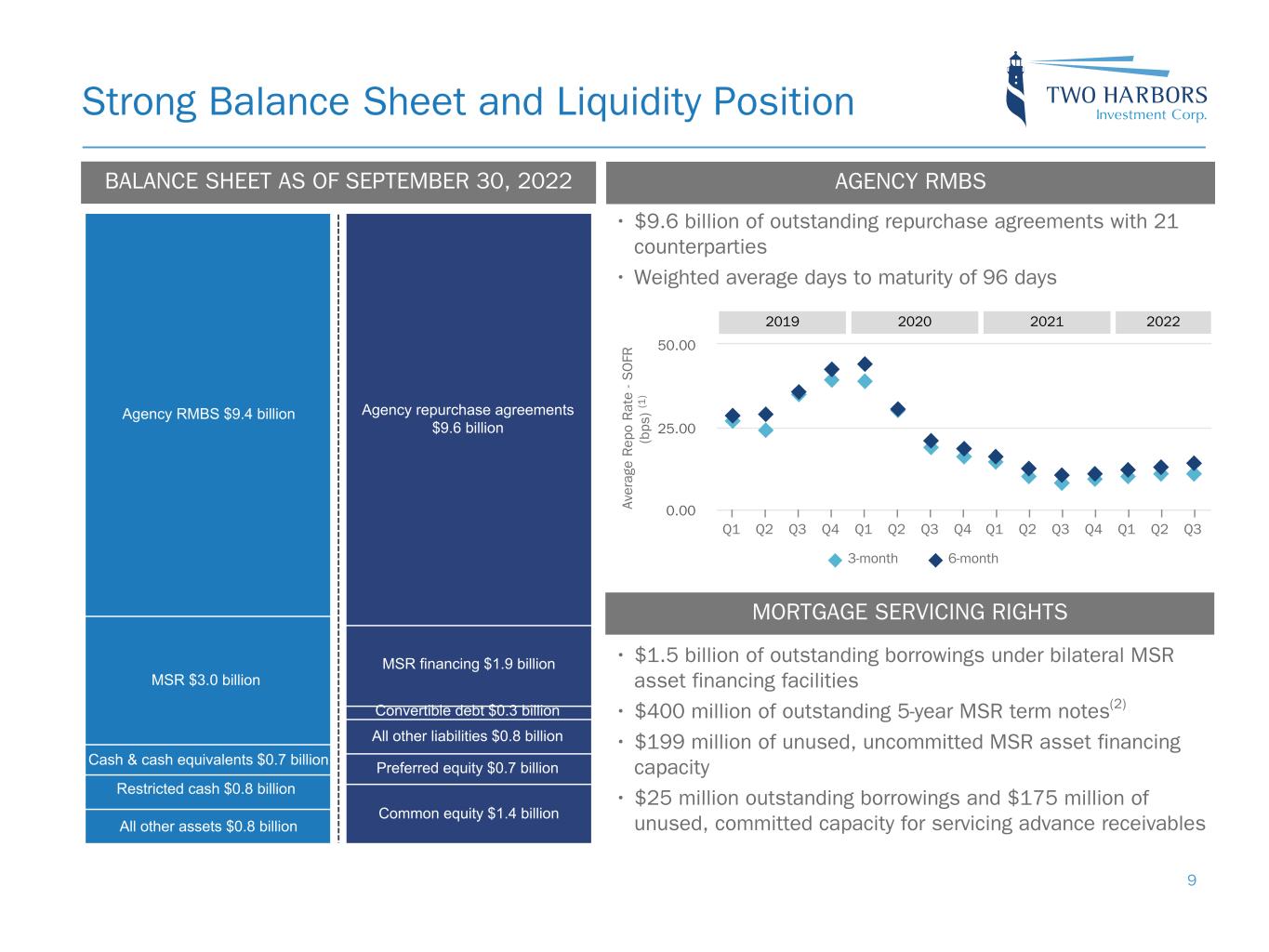 Portfolio Yields and Financing Costs 8 • Portfolio yield increased 22 bps to 4.61% primarily due to a greater amount of higher coupon available-for-sale securities • Net spread narrowed by (93) bps as a combination of higher rates and borrowing balances offset a higher portfolio yield ($ thousands) Q3-2022 Q2-2022 Portfolio Asset Type Average Amortized Cost Income(1) Average Yield Average Amortized Cost Income(1) Average Yield Available-for-sale securities $ 9,323,193 $ 88,472 3.80% $ 7,248,502 $ 55,399 3.06% Mortgage servicing rights(2) 1,925,372 51,159 10.63% 2,113,912 52,008 9.84% Agency derivatives(3) 26,096 153 2.35 % 28,663 304 4.24 % TBAs(4) 5,762,726 56,776 3.94 % 5,686,796 57,646 4.05 % Total portfolio $ 17,037,387 $ 196,560 4.61 % $ 15,077,873 $ 165,357 4.39 % Financing Collateral Type Average Outstanding Balance Expense(5) Average Cost Average Outstanding Balance Expense(5) Average Cost Available-for-sale securities $ 8,951,012 $ 51,769 2.31% $ 7,012,474 $ 12,955 0.74% Mortgage servicing rights and advances 1,718,842 26,579 6.19 % 1,628,474 19,252 4.73 % Agency derivatives(3) 21,601 125 2.31 % 27,074 93 1.37 % Other - unsecured(6) 281,961 4,877 6.92 % 281,608 4,801 6.82 % Interest rate swaps(7) (178) — % 4,267 0.12 % U.S. Treasury futures(8) 16,643 0.40 % 20,602 0.56 % TBAs(4) 5,762,726 18,944 1.31 % 5,686,796 (56) — % Total financing $ 16,736,142 $ 118,759 2.84 % $ 14,636,426 $ 61,914 1.69 % Net Spread 1.77 % 2.70 % Note: Beginning with the third quarter of 2022, the above presentation of financing costs includes U.S. Treasury futures income, which represents the economic equivalent to holding and financing a relevant cheapest-to-deliver U.S. Treasury note or bond using short-term repurchase agreements. Second quarter 2022 comparative data has been updated to reflect this change. Refer to the End Notes at the back of this presentation for more information.