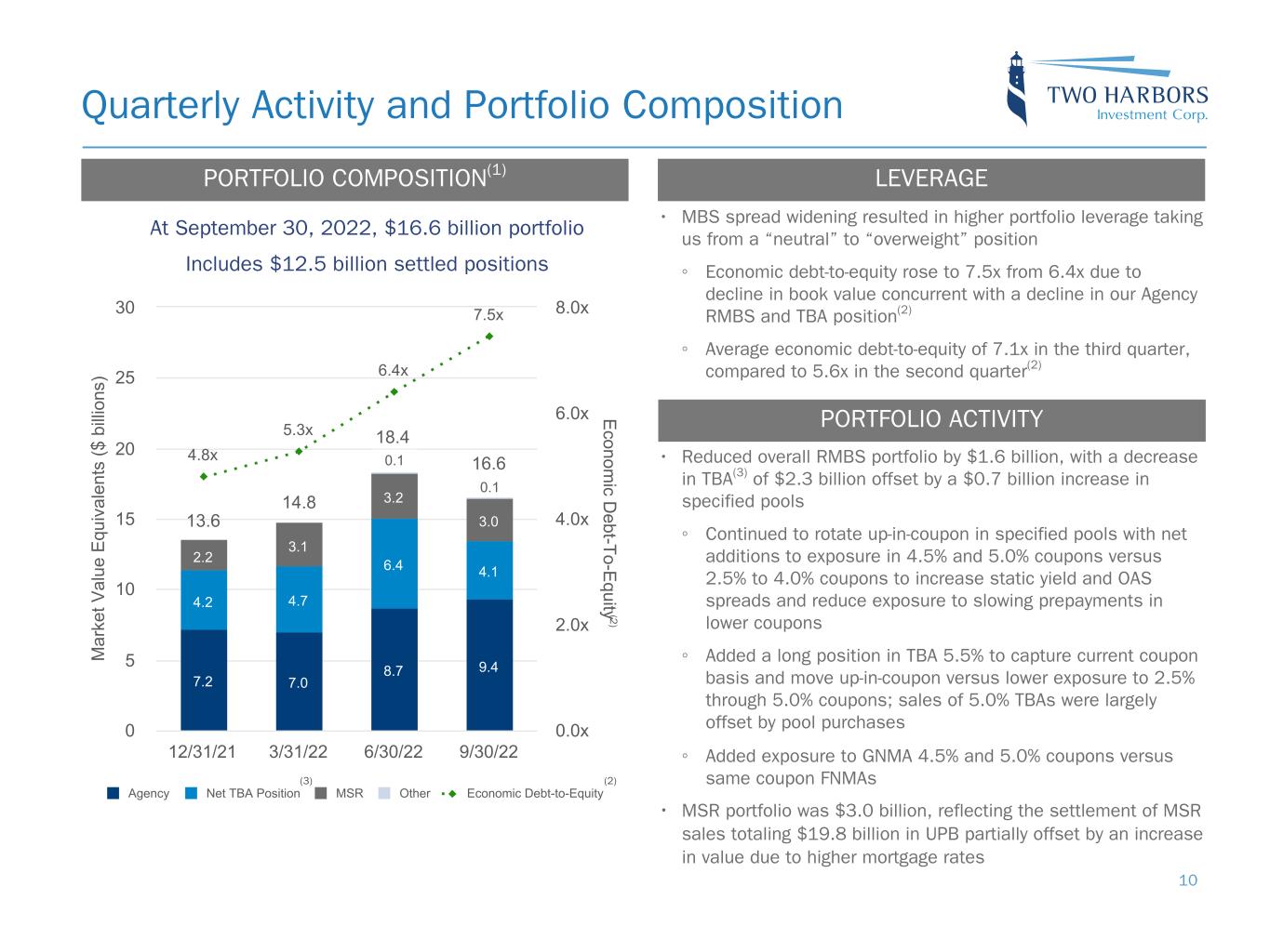 • $1.5 billion of outstanding borrowings under bilateral MSR asset financing facilities • $400 million of outstanding 5-year MSR term notes(2) • $199 million of unused, uncommitted MSR asset financing capacity • $25 million outstanding borrowings and $175 million of unused, committed capacity for servicing advance receivables Strong Balance Sheet and Liquidity Position 9 MORTGAGE SERVICING RIGHTS AGENCY RMBSBALANCE SHEET AS OF SEPTEMBER 30, 2022 • $9.6 billion of outstanding repurchase agreements with 21 counterparties • Weighted average days to maturity of 96 days Av er ag e R ep o R at e - S O FR (b ps ) 3-month 6-month Q1 Q2 Q3 Q4 Q1 Q2 Q3 Q4 Q1 Q2 Q3 Q4 Q1 Q2 Q3 0.00 25.00 50.00 2019 2020 2021 2022 (1 ) Agency RMBS $9.4 billion MSR $3.0 billion Cash & cash equivalents $0.7 billion Restricted cash $0.8 billion All other assets $0.8 billion Agency repurchase agreements $9.6 billion MSR financing $1.9 billion All other liabilities $0.8 billion Preferred equity $0.7 billion Common equity $1.4 billion Convertible debt $0.3 billion