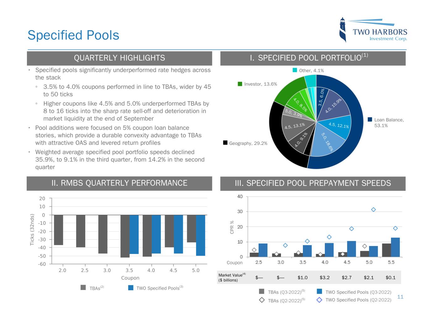 Quarterly Activity and Portfolio Composition 10 At September 30, 2022, $16.6 billion portfolio Includes $12.5 billion settled positions PORTFOLIO COMPOSITION(1) LEVERAGE M ar ke t V al ue E qu iv al en ts ($ b ill io ns ) E conom ic D ebt-To-E quity 7.2 7.0 8.7 9.4 4.2 4.7 6.4 4.1 2.2 3.1 3.2 3.0 4.8x 5.3x 6.4x 7.5x Agency Net TBA Position MSR Other Economic Debt-to-Equity 12/31/21 3/31/22 6/30/22 9/30/22 0 5 10 15 20 25 30 0.0x 2.0x 4.0x 6.0x 8.0x (2) (2 ) (3) • MBS spread widening resulted in higher portfolio leverage taking us from a “neutral” to “overweight” position ◦ Economic debt-to-equity rose to 7.5x from 6.4x due to decline in book value concurrent with a decline in our Agency RMBS and TBA position(2) ◦ Average economic debt-to-equity of 7.1x in the third quarter, compared to 5.6x in the second quarter(2) • Reduced overall RMBS portfolio by $1.6 billion, with a decrease in TBA(3) of $2.3 billion offset by a $0.7 billion increase in specified pools ◦ Continued to rotate up-in-coupon in specified pools with net additions to exposure in 4.5% and 5.0% coupons versus 2.5% to 4.0% coupons to increase static yield and OAS spreads and reduce exposure to slowing prepayments in lower coupons ◦ Added a long position in TBA 5.5% to capture current coupon basis and move up-in-coupon versus lower exposure to 2.5% through 5.0% coupons; sales of 5.0% TBAs were largely offset by pool purchases ◦ Added exposure to GNMA 4.5% and 5.0% coupons versus same coupon FNMAs • MSR portfolio was $3.0 billion, reflecting the settlement of MSR sales totaling $19.8 billion in UPB partially offset by an increase in value due to higher mortgage rates PORTFOLIO ACTIVITY 0.1 16.60.1 18.4 13.6 14.8