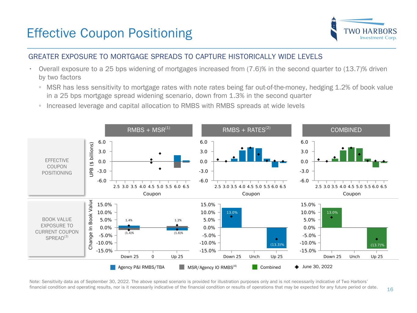 14 Return Potential and Outlook HISTORICALLY WIDE MORTGAGE SPREADS OFFER ATTRACTIVE OPPORTUNITIES BUT RISKS REMAIN PROSPECTIVE MARKET RETURNS • Market return estimates reflect static assumptions using quarter-end spreads and market data • Hedged MSR offer a gross return potential in the low-to-mid-teens • RMBS spreads stand at near-record wide levels on many metrics and offer gross return potential in the mid-to-high teens PROSPECTIVE TWO HARBORS RETURNS • After including the effects of expenses, our convertible notes and preferred equity, prospective static return estimates are 13.0% - 16.8% on common equity • Changes in market prices will certainly cause realized returns to differ from these static estimates, perhaps meaningfully so if the recently delivered volatility in rates and spreads continues into the fourth quarter PROSPECTIVE MARKET RETURNS As of Sep-30-2022 INVESTED CAPITAL ALLOCATED(1) PORTFOLIO MARKET VALUE ($ millions) STATIC MARKET RETURN ESTIMATE(2) RMBS + MSR MSR 3,022 TBA(3) 1,649 Hedged MSR 55% 4,671 12% - 14% RMBS + RATES Pools 9,121 TBA(3) 2,399 Other Securities 369 Hedged Securities 45% 11,889 16% - 18% PROSPECTIVE TWO HARBORS RETURNS As of Sep-30-2022 INVESTED CAPITAL ($ millions) STATIC TWO HARBORS RETURN ESTIMATE(4) Total Portfolio Before Expense 14% - 16% Expenses(5) (3.4)% - (3.2)% Total Portfolio After Expenses 10.6% - 12.8% INVESTED CAPITAL Convertible Notes 288 6.1% Preferred Equity 726 7.6% Common Equity 1,418 13.0 % - 16.8% PROSPECTIVE QUARTERLY RETURN PER BASIC COMMON SHARE(6): $0.53 - $0.69 Note: This slide presents estimates for illustrative purposes only, using TWO’s base case assumptions (e.g., spreads, prepayment speeds, financing costs and expenses), and does not contemplate market-driven value changes, active portfolio management, or future impacts from the acquisition of RoundPoint. Actual results may differ materially.