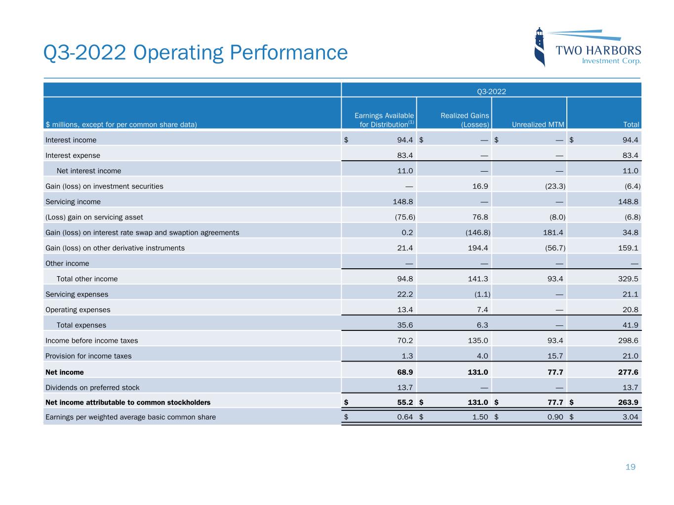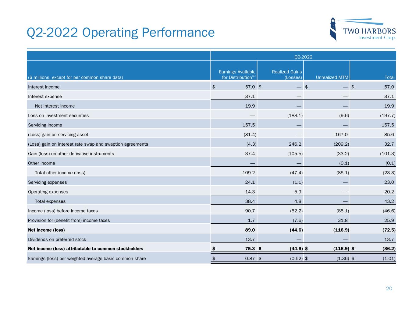 Q3-2022 Operating Performance Q3-2022 $ millions, except for per common share data) Earnings Available for Distribution(1) Realized Gains (Losses) Unrealized MTM Total Interest income $ 94.4 $ — $ — $ 94.4 Interest expense 83.4 — — 83.4 Net interest income 11.0 — — 11.0 Gain (loss) on investment securities — 16.9 (23.3) (6.4) Servicing income 148.8 — — 148.8 (Loss) gain on servicing asset (75.6) 76.8 (8.0) (6.8) Gain (loss) on interest rate swap and swaption agreements 0.2 (146.8) 181.4 34.8 Gain (loss) on other derivative instruments 21.4 194.4 (56.7) 159.1 Other income — — — — Total other income 94.8 141.3 93.4 329.5 Servicing expenses 22.2 (1.1) — 21.1 Operating expenses 13.4 7.4 — 20.8 Total expenses 35.6 6.3 — 41.9 Income before income taxes 70.2 135.0 93.4 298.6 Provision for income taxes 1.3 4.0 15.7 21.0 Net income 68.9 131.0 77.7 277.6 Dividends on preferred stock 13.7 — — 13.7 Net income attributable to common stockholders $ 55.2 $ 131.0 $ 77.7 $ 263.9 Earnings per weighted average basic common share $ 0.64 $ 1.50 $ 0.90 $ 3.04 19