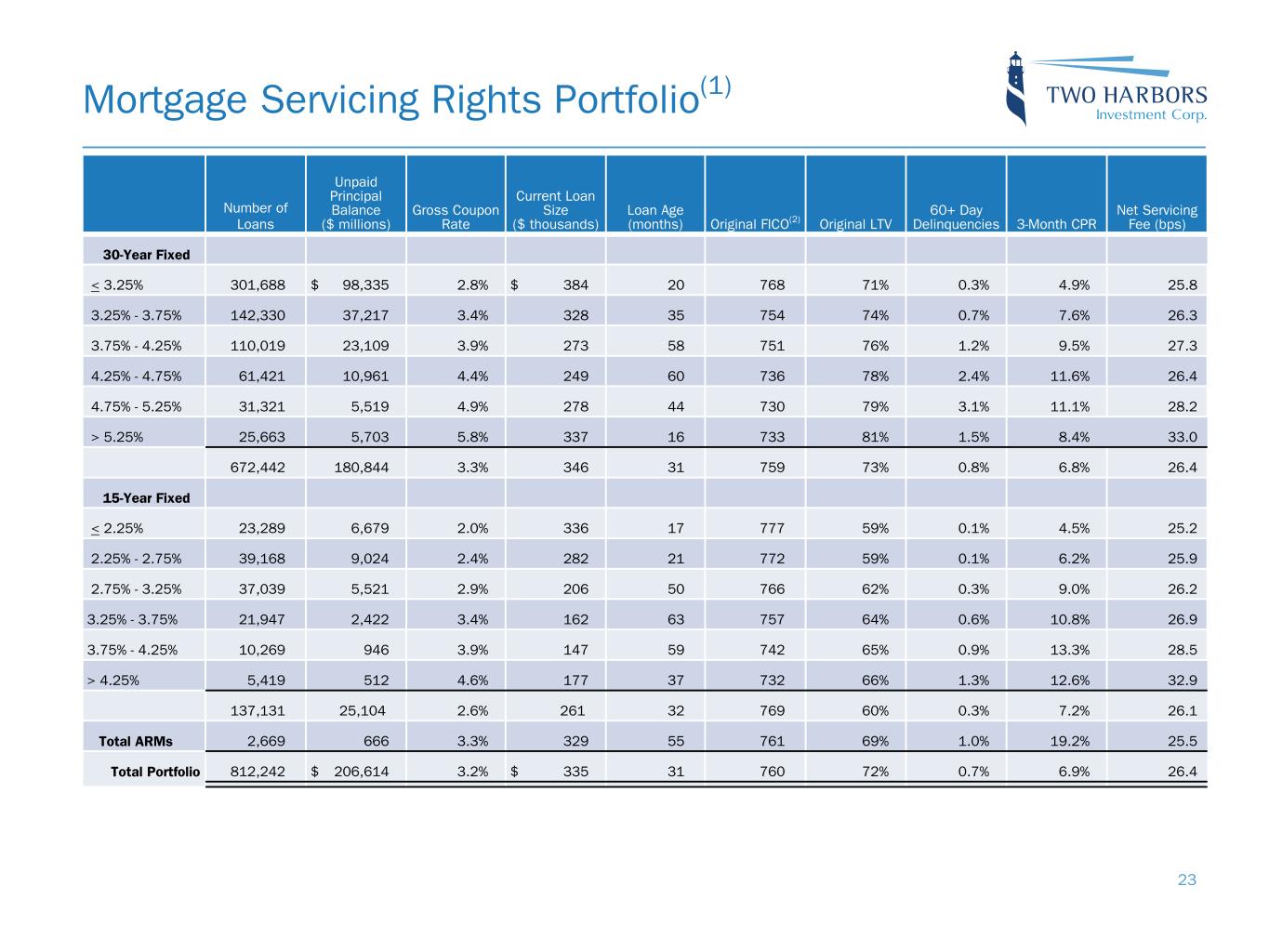 Agency RMBS Portfolio 22 Par Value ($ millions) Market Value ($ millions) Weighted Average CPR(1) % Prepay Protected(2) Amortized Cost Basis ($ millions) Gross Weighted Average Coupon Weighted Average Age (Months) 30-Year fixed 2.5% & below $ — $ — — % — % $ — — % — 3.0% — — — % — % — — % — 3.5% 1,165 1,054 6.4 % 100.0 % 1,203 4.1 % 13 4.0% 3,393 3,172 6.5 % 100.0 % 3,453 4.6 % 24 4.5% 2,779 2,670 7.4 % 100.0 % 2,858 5.1 % 25 5.0% 2,182 2,145 5.8 % 100.0 % 2,253 5.8 % 8 ≥ 5.5% 77 80 10.5 % 93.3 % 82 6.4 % 181 9,596 9,121 6.6 % 99.9 % 9,849 5.0 % 21 Other P&I(3) 199 190 2.1 % 21.1 % 197 5.3 % 59 IOs and IIOs(4) 1,318 55 10.1 % — % 73 5.0 % 161 Total Agency RMBS $ 11,113 $ 9,366 97.8 % $ 10,119 Notional Amount ($ millions) Bond Equivalent Value ($ millions)(5) Through-the-Box Speeds(6) TBA Positions 2.5% & below $ — $ — 2.7 % 3.0% — — 2.2 % 3.5% (300) (270) 2.4 % 4.0% — — 1.9 % 4.5% 1,657 1,580 3.2 % 5.0% 1,997 1,943 3.8 % 5.5% 800 795 9.0 % Net TBA position $ 4,154 $ 4,048