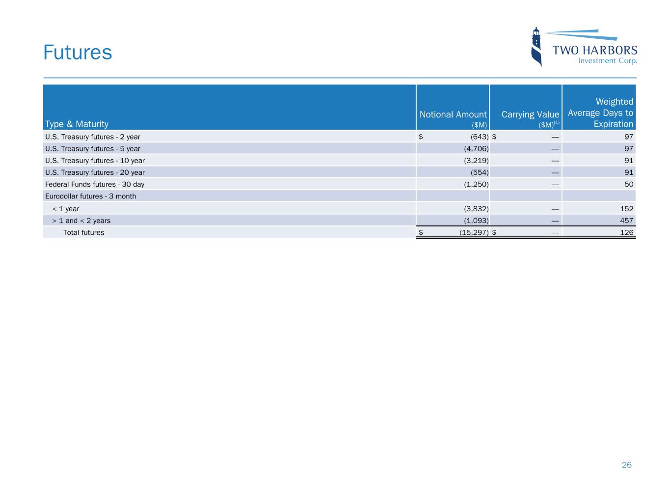 Type & Maturity Notional Amount ($M) Carrying Value ($M)(1) Weighted Average Days to Expiration U.S. Treasury futures - 2 year $ (643) $ — 97 U.S. Treasury futures - 5 year (4,706) — 97 U.S. Treasury futures - 10 year (3,219) — 91 U.S. Treasury futures - 20 year (554) — 91 Federal Funds futures - 30 day (1,250) — 50 Eurodollar futures - 3 month < 1 year (3,832) — 152 > 1 and < 2 years (1,093) — 457 Total futures $ (15,297) $ — 126 Futures 26