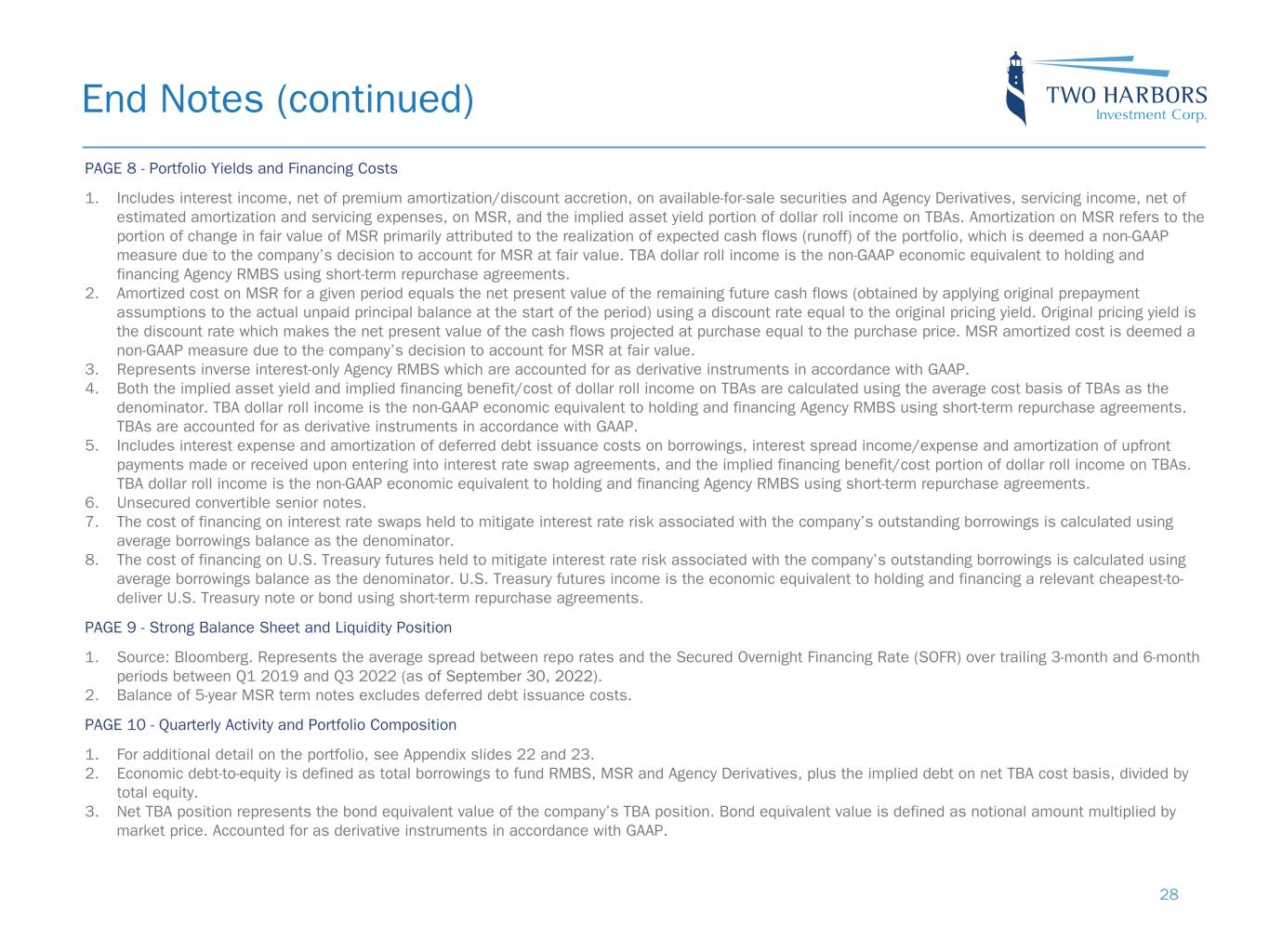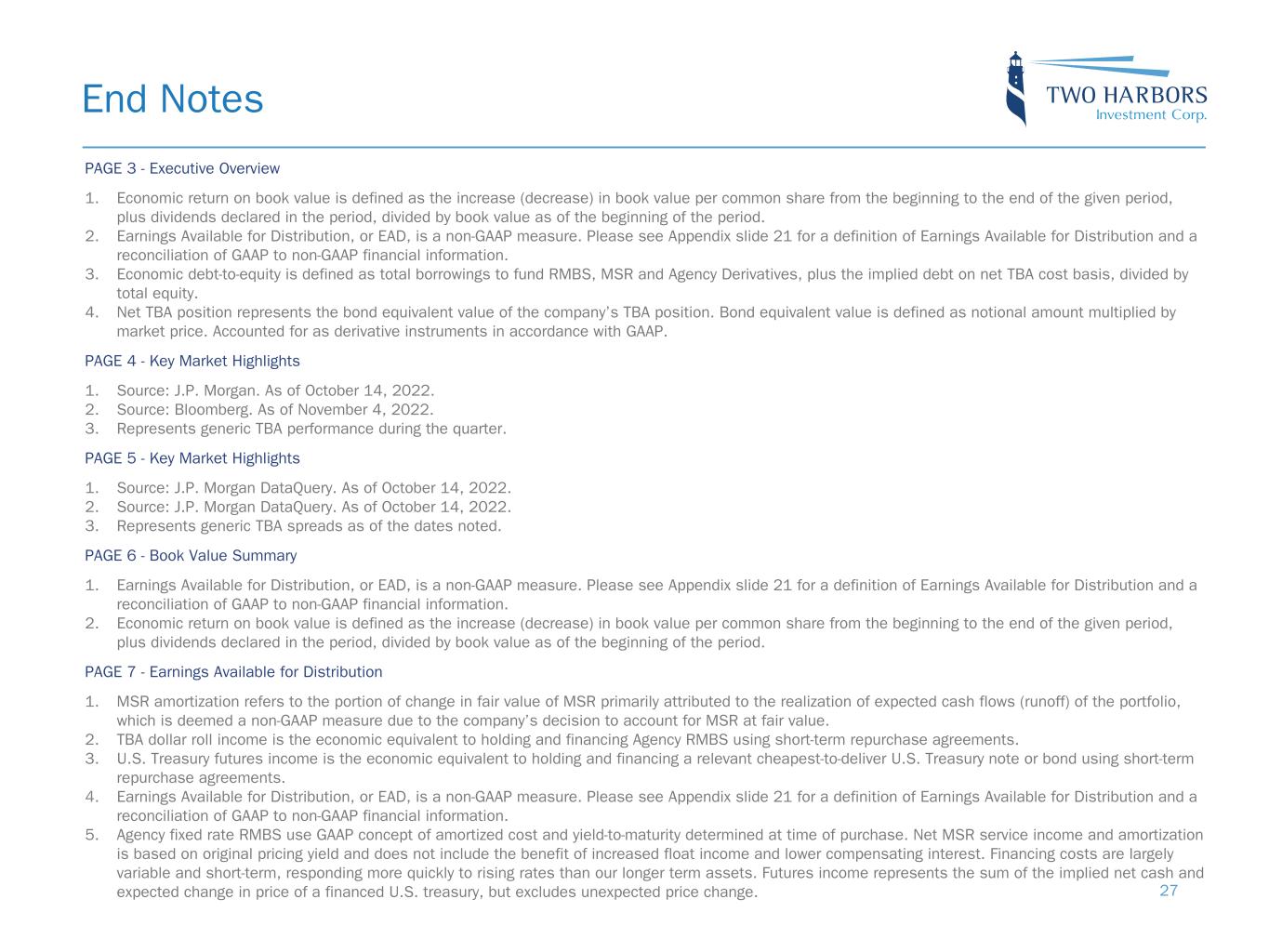 PAGE 3 - Executive Overview 1. Economic return on book value is defined as the increase (decrease) in book value per common share from the beginning to the end of the given period, plus dividends declared in the period, divided by book value as of the beginning of the period. 2. Earnings Available for Distribution, or EAD, is a non-GAAP measure. Please see Appendix slide 21 for a definition of Earnings Available for Distribution and a reconciliation of GAAP to non-GAAP financial information. 3. Economic debt-to-equity is defined as total borrowings to fund RMBS, MSR and Agency Derivatives, plus the implied debt on net TBA cost basis, divided by total equity. 4. Net TBA position represents the bond equivalent value of the company’s TBA position. Bond equivalent value is defined as notional amount multiplied by market price. Accounted for as derivative instruments in accordance with GAAP. PAGE 4 - Key Market Highlights 1. Source: J.P. Morgan. As of October 14, 2022. 2. Source: Bloomberg. As of November 4, 2022. 3. Represents generic TBA performance during the quarter. PAGE 5 - Key Market Highlights 1. Source: J.P. Morgan DataQuery. As of October 14, 2022. 2. Source: J.P. Morgan DataQuery. As of October 14, 2022. 3. Represents generic TBA spreads as of the dates noted. PAGE 6 - Book Value Summary 1. Earnings Available for Distribution, or EAD, is a non-GAAP measure. Please see Appendix slide 21 for a definition of Earnings Available for Distribution and a reconciliation of GAAP to non-GAAP financial information. 2. Economic return on book value is defined as the increase (decrease) in book value per common share from the beginning to the end of the given period, plus dividends declared in the period, divided by book value as of the beginning of the period. PAGE 7 - Earnings Available for Distribution 1. MSR amortization refers to the portion of change in fair value of MSR primarily attributed to the realization of expected cash flows (runoff) of the portfolio, which is deemed a non-GAAP measure due to the company’s decision to account for MSR at fair value. 2. TBA dollar roll income is the economic equivalent to holding and financing Agency RMBS using short-term repurchase agreements. 3. U.S. Treasury futures income is the economic equivalent to holding and financing a relevant cheapest-to-deliver U.S. Treasury note or bond using short-term repurchase agreements. 4. Earnings Available for Distribution, or EAD, is a non-GAAP measure. Please see Appendix slide 21 for a definition of Earnings Available for Distribution and a reconciliation of GAAP to non-GAAP financial information. 5. Agency fixed rate RMBS use GAAP concept of amortized cost and yield-to-maturity determined at time of purchase. Net MSR service income and amortization is based on original pricing yield and does not include the benefit of increased float income and lower compensating interest. Financing costs are largely variable and short-term, responding more quickly to rising rates than our longer term assets. Futures income represents the sum of the implied net cash and expected change in price of a financed U.S. treasury, but excludes unexpected price change. End Notes 27