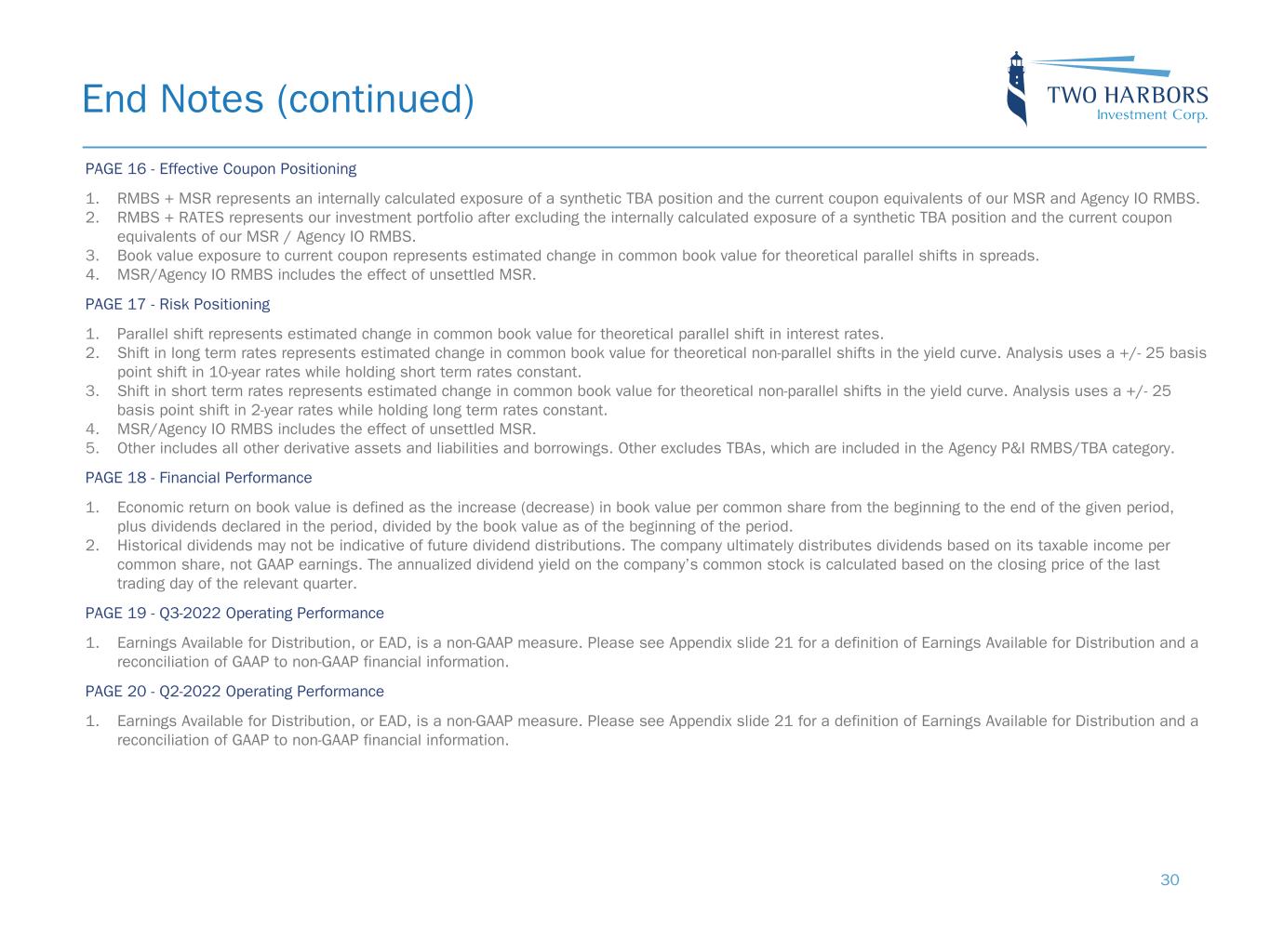 End Notes (continued) 29 PAGE 11 - Specified Pools 1. Specified pools include securities with implicit or explicit protection including lower loan balances (securities collateralized by loans less than or equal to $200K of initial principal balance), higher LTVs (securities collateralized by loans with greater than or equal to 80% LTV), certain geographic concentrations, loans secured by investor-owned properties, and lower FICO scores, as well as securities without such protection, including large bank-serviced and others. 2. Represents generic TBA performance during the quarter. 3. Specified pool performance excludes certain coupons in which we were not invested for the full duration of the quarter. 4. Specified pool market value by coupon as of September 30, 2022. 5. Three month prepayment speeds of delivered TBA contracts; average of J.P. Morgan, Credit Suisse, and Citi data. PAGE 12 - Mortgage Servicing Rights 1. MSR portfolio based on the loans underlying the MSR reported by subservicers on a month lag, adjusted for current month purchases. Portfolio metrics, other than fair value and UPB, represent averages weighted by UPB. 2. FICO represents a mortgage industry accepted credit score of a borrower. 3. MSR portfolio based on the loans underlying the MSR reported by subservicers on a month lag, adjusted for current month purchases and excluding unsettled MSR on loans for which the company is the named servicer. 4. Three month prepayment speeds of delivered TBA contracts; average of J.P. Morgan, Credit Suisse, and Citi data. PAGE 13 - Special Topic: Low Coupon MSR + Higher Coupon RMBS 1. Represents generic TBA returns based on internal assumptions of leverage, prepayments and financing. 2. MSR portfolio based on the loans underlying the MSR reported by subservicers on a month lag, adjusted for current month purchases and excluding unsettled MSR on loans for which the company is the named servicer. Refinance incentive is based on “current” mortgage rate as of October 31, 2022. 3. MSR portfolio based on the loans underlying the MSR reported by subservicers on a month lag, adjusted for current month purchases and excluding unsettled MSR on loans for which the company is the named servicer. Returns based on internal assumptions of leverage, prepayments and financing. PAGE 14 - Return Potential and Outlook 1. Capital allocated represents management’s internal allocation. Certain financing balances and associated interest expenses are allocated between investments based on management’s assessment of leverage ratios and required capital or liquidity to support the investment. 2. Market return estimates reflect static assumptions using quarter-end spreads and market data. 3. Net TBA position represents the bond equivalent value of the company’s TBA position. Bond equivalent value is defined as notional amount multiplied by market price. Accounted for as derivative instruments in accordance with GAAP. 4. Estimated return on invested capital reflects static return assumptions using quarter end portfolio valuations. 5. Total expenses includes operating expenses and tax expense within the company’s taxable REIT subsidiaries. 6. Prospective quarterly return estimate per basic common share reflects portfolio performance expectations given current market conditions and represents the comprehensive income attributable to common stockholders (net of dividends on preferred stock).