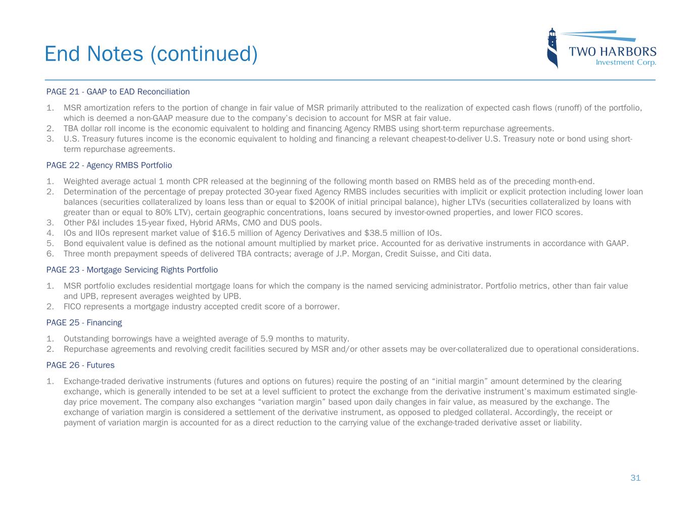 End Notes (continued) 30 PAGE 16 - Effective Coupon Positioning 1. RMBS + MSR represents an internally calculated exposure of a synthetic TBA position and the current coupon equivalents of our MSR and Agency IO RMBS. 2. RMBS + RATES represents our investment portfolio after excluding the internally calculated exposure of a synthetic TBA position and the current coupon equivalents of our MSR / Agency IO RMBS. 3. Book value exposure to current coupon represents estimated change in common book value for theoretical parallel shifts in spreads. 4. MSR/Agency IO RMBS includes the effect of unsettled MSR. PAGE 17 - Risk Positioning 1. Parallel shift represents estimated change in common book value for theoretical parallel shift in interest rates. 2. Shift in long term rates represents estimated change in common book value for theoretical non-parallel shifts in the yield curve. Analysis uses a +/- 25 basis point shift in 10-year rates while holding short term rates constant. 3. Shift in short term rates represents estimated change in common book value for theoretical non-parallel shifts in the yield curve. Analysis uses a +/- 25 basis point shift in 2-year rates while holding long term rates constant. 4. MSR/Agency IO RMBS includes the effect of unsettled MSR. 5. Other includes all other derivative assets and liabilities and borrowings. Other excludes TBAs, which are included in the Agency P&I RMBS/TBA category. PAGE 18 - Financial Performance 1. Economic return on book value is defined as the increase (decrease) in book value per common share from the beginning to the end of the given period, plus dividends declared in the period, divided by the book value as of the beginning of the period. 2. Historical dividends may not be indicative of future dividend distributions. The company ultimately distributes dividends based on its taxable income per common share, not GAAP earnings. The annualized dividend yield on the company’s common stock is calculated based on the closing price of the last trading day of the relevant quarter. PAGE 19 - Q3-2022 Operating Performance 1. Earnings Available for Distribution, or EAD, is a non-GAAP measure. Please see Appendix slide 21 for a definition of Earnings Available for Distribution and a reconciliation of GAAP to non-GAAP financial information. PAGE 20 - Q2-2022 Operating Performance 1. Earnings Available for Distribution, or EAD, is a non-GAAP measure. Please see Appendix slide 21 for a definition of Earnings Available for Distribution and a reconciliation of GAAP to non-GAAP financial information.