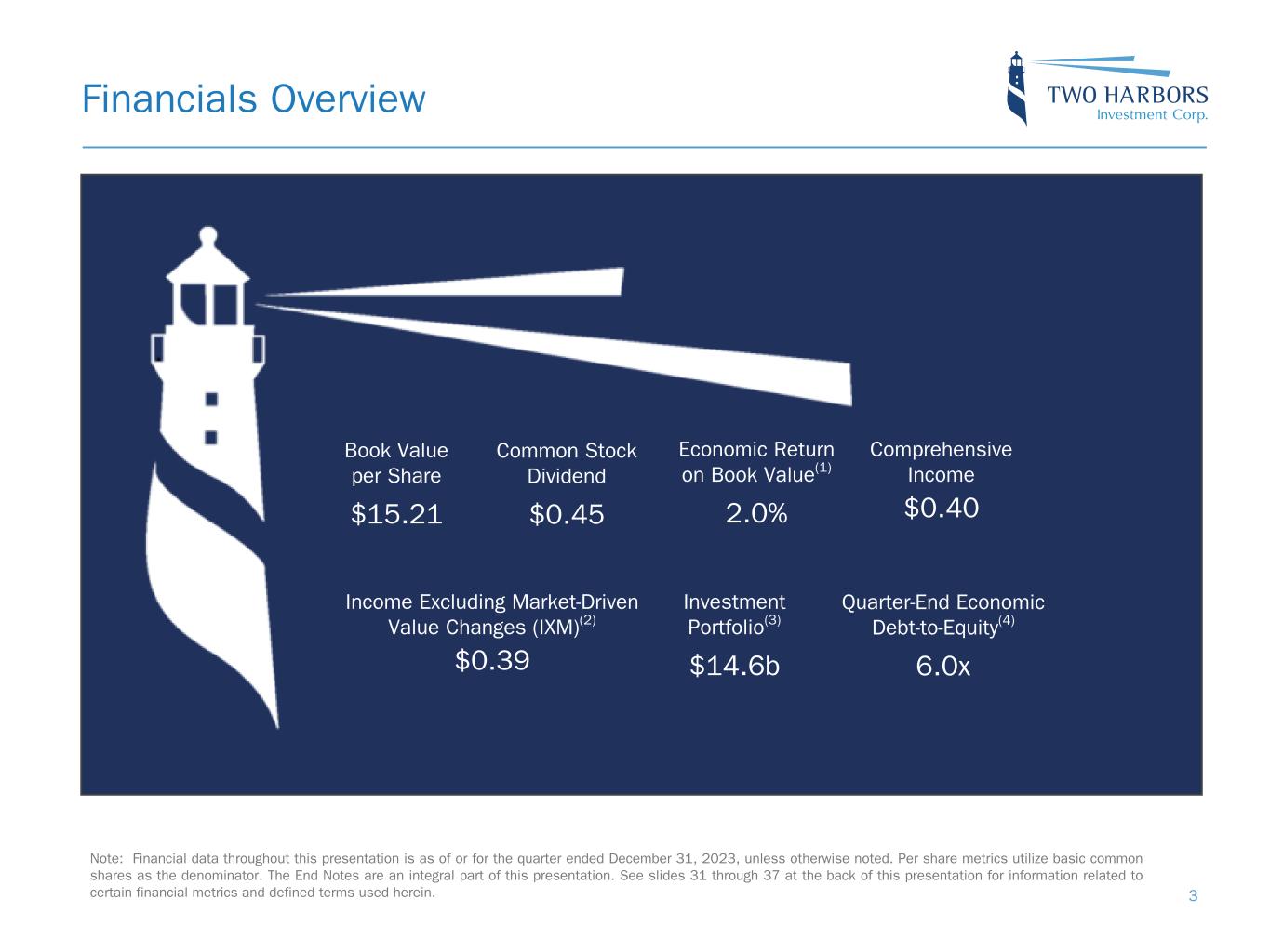Safe Harbor Statement 2 FORWARD-LOOKING STATEMENTS This presentation includes “forward-looking statements” within the meaning of the safe harbor provisions of the United States Private Securities Litigation Reform Act of 1995. Actual results may differ from expectations, estimates and projections and, consequently, readers should not rely on these forward-looking statements as predictions of future events. Words such as “expect,” “target,” “assume,” “estimate,” “project,” “budget,” “forecast,” “anticipate,” “intend,” “plan,” “may,” “will,” “could,” “should,” “believe,” “predicts,” “potential,” “continue,” and similar expressions are intended to identify such forward-looking statements. These forward-looking statements involve significant risks and uncertainties that could cause actual results to differ materially from expected results, including, among other things, those described in our Annual Report on Form 10-K for the year ended December 31, 2022, and any subsequent Quarterly Reports on Form 10-Q, under the caption “Risk Factors.” Factors that could cause actual results to differ include, but are not limited to: the state of credit markets and general economic conditions; changes in interest rates and the market value of our assets; changes in prepayment rates of mortgages underlying our target assets; the rates of default or decreased recovery on the mortgages underlying our target assets; declines in home prices; our ability to establish, adjust and maintain appropriate hedges for the risks in our portfolio; the availability and cost of our target assets; the availability and cost of financing; changes in the competitive landscape within our industry; our ability to effectively execute and to realize the benefits of strategic transactions and initiatives we have pursued or may in the future pursue; our ability to recognize the benefits of our acquisition of RoundPoint Mortgage Servicing LLC and to manage the risks associated with operating a mortgage loan servicer; our decision to terminate our management agreement with PRCM Advisers LLC and the ongoing litigation related to such termination; our ability to manage various operational risks and costs associated with our business; interruptions in or impairments to our communications and information technology systems; our ability to acquire mortgage servicing rights (MSR) and to maintain our MSR portfolio; the impact of any deficiencies in the servicing or foreclosure practices of third parties and related delays in the foreclosure process; our exposure to legal and regulatory claims; legislative and regulatory actions affecting our business; the impact of new or modified government mortgage refinance or principal reduction programs; our ability to maintain our REIT qualification; and limitations imposed on our business due to our REIT status and our exempt status under the Investment Company Act of 1940. Readers are cautioned not to place undue reliance upon any forward-looking statements, which speak only as of the date made. Two Harbors does not undertake or accept any obligation to release publicly any updates or revisions to any forward-looking statement to reflect any change in its expectations or any change in events, conditions or circumstances on which any such statement is based. Additional information concerning these and other risk factors is contained in Two Harbors’ most recent filings with the Securities and Exchange Commission (SEC). All subsequent written and oral forward-looking statements concerning Two Harbors or matters attributable to Two Harbors or any person acting on its behalf are expressly qualified in their entirety by the cautionary statements above. This presentation may include industry and market data obtained through research, surveys, and studies conducted by third parties and industry publications. We have not independently verified any such market and industry data from third-party sources. This presentation is provided for discussion purposes only and may not be relied upon as legal or investment advice, nor is it intended to be inclusive of all the risks and uncertainties that should be considered. This presentation does not constitute an offer to purchase or sell any securities, nor shall it be construed to be indicative of the terms of an offer that the parties or their respective affiliates would accept. Readers are advised that the financial information in this presentation is based on company data available at the time of this presentation and, in certain circumstances, may not have been audited by the company’s independent auditors.