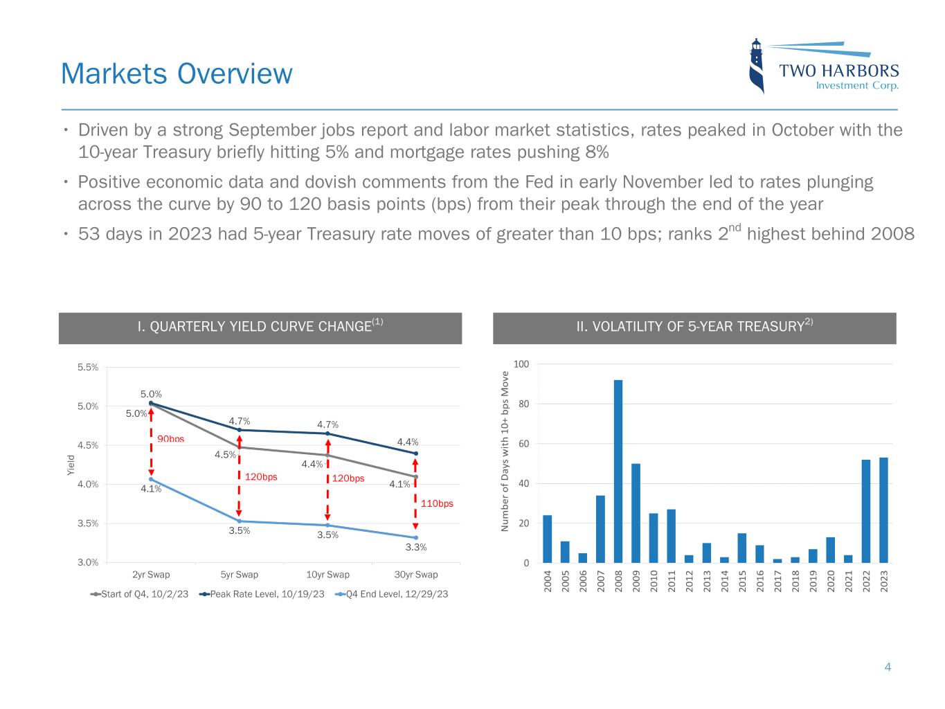 Financials Overview 3 Book Value per Share $15.21 Common Stock Dividend $0.45 Economic Return on Book Value(1) 2.0% Comprehensive Income $0.40 Investment Portfolio(3) $14.6b Quarter-End Economic Debt-to-Equity(4) 6.0x Note: Financial data throughout this presentation is as of or for the quarter ended December 31, 2023, unless otherwise noted. Per share metrics utilize basic common shares as the denominator. The End Notes are an integral part of this presentation. See slides 31 through 37 at the back of this presentation for information related to certain financial metrics and defined terms used herein. Income Excluding Market-Driven Value Changes (IXM)(2) $0.39