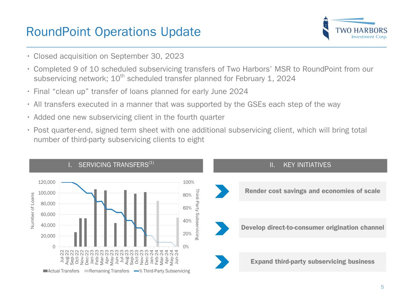 RoundPoint Operations Update 5 • Closed acquisition on September 30, 2023 • Completed 9 of 10 scheduled subservicing transfers of Two Harbors’ MSR to RoundPoint from our subservicing network; 10th scheduled transfer planned for February 1, 2024 • Final “clean up” transfer of loans planned for early June 2024 • All transfers executed in a manner that was supported by the GSEs each step of the way • Added one new subservicing client in the fourth quarter • Post quarter-end, signed term sheet with one additional subservicing client, which will bring total number of third-party subservicing clients to eight II. KEY INITIATIVES Expand third-party subservicing business Render cost savings and economies of scale Develop direct-to-consumer origination channel I. SERVICING TRANSFERS(1)