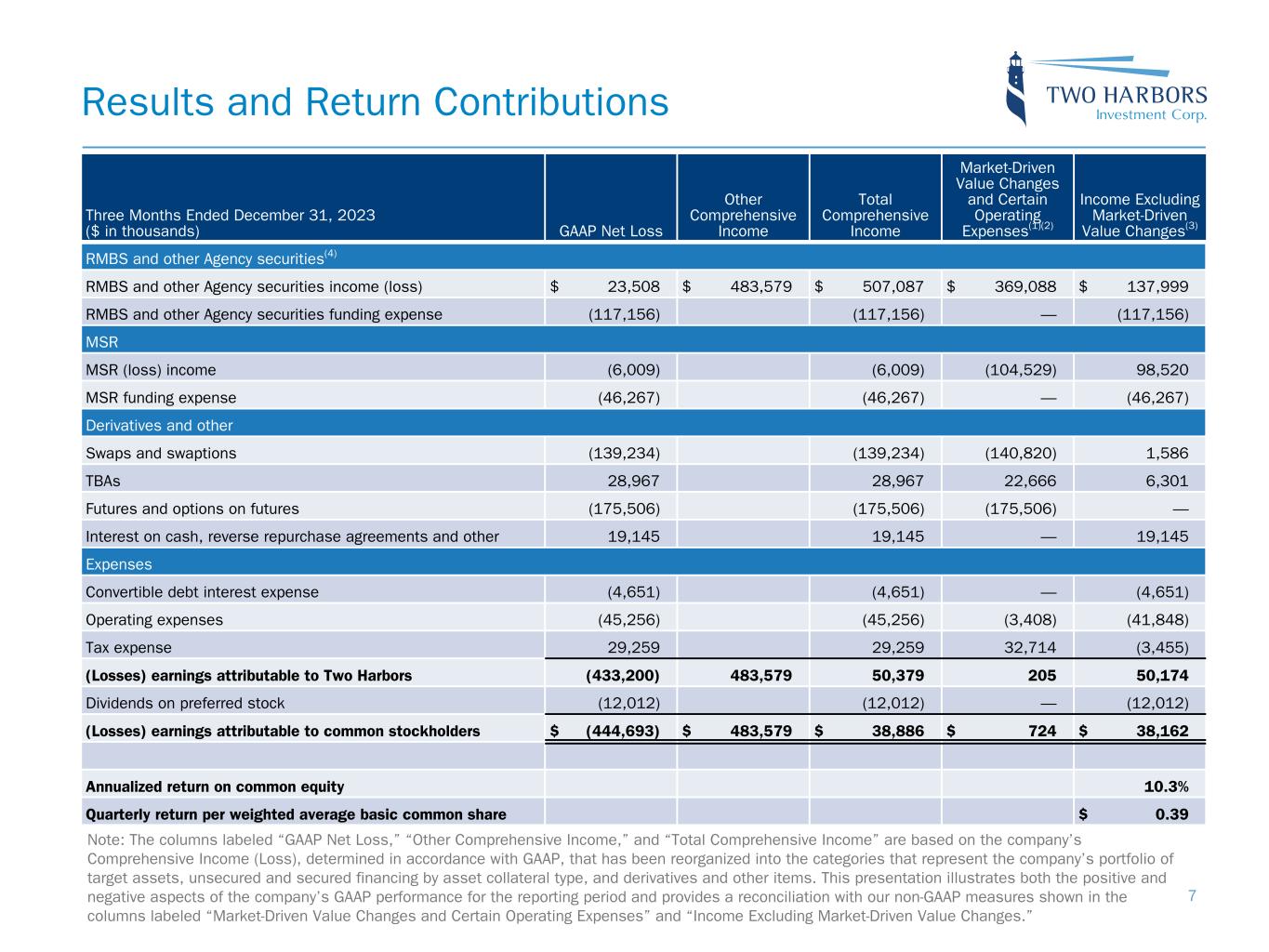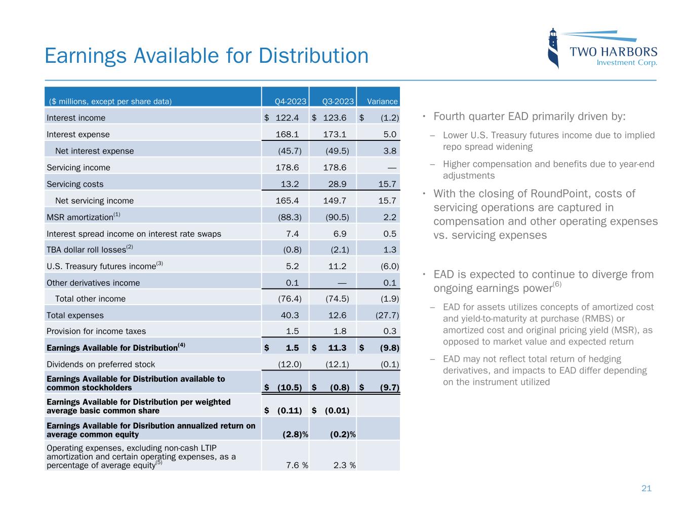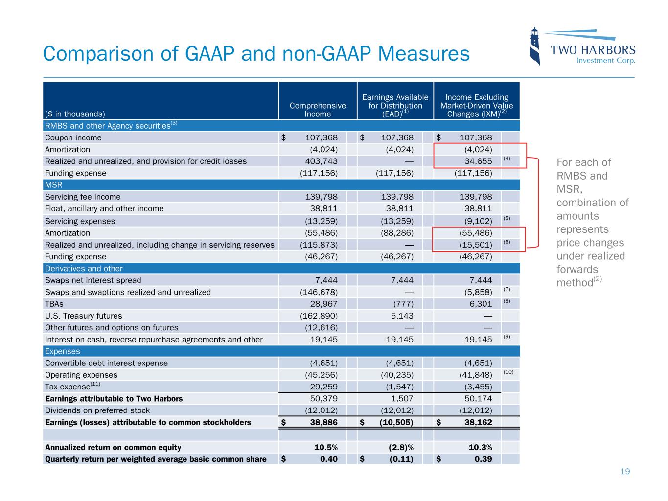 Comparison of GAAP and non-GAAP Measures ($ in thousands) Comprehensive Income Earnings Available for Distribution (EAD)(1) Income Excluding Market-Driven Value Changes (IXM)(2) RMBS and other Agency securities(3) Coupon income $ 107,368 $ 107,368 $ 107,368 Amortization (4,024) (4,024) (4,024) Realized and unrealized, and provision for credit losses 403,743 — 34,655 (4) Funding expense (117,156) (117,156) (117,156) MSR Servicing fee income 139,798 139,798 139,798 Float, ancillary and other income 38,811 38,811 38,811 Servicing expenses (13,259) (13,259) (9,102) (5) Amortization (55,486) (88,286) (55,486) Realized and unrealized, including change in servicing reserves (115,873) — (15,501) (6) Funding expense (46,267) (46,267) (46,267) Derivatives and other Swaps net interest spread 7,444 7,444 7,444 Swaps and swaptions realized and unrealized (146,678) — (5,858) (7) TBAs 28,967 (777) 6,301 (8) U.S. Treasury futures (162,890) 5,143 — Other futures and options on futures (12,616) — — Interest on cash, reverse repurchase agreements and other 19,145 19,145 19,145 (9) Expenses Convertible debt interest expense (4,651) (4,651) (4,651) Operating expenses (45,256) (40,235) (41,848) (10) Tax expense(11) 29,259 (1,547) (3,455) Earnings attributable to Two Harbors 50,379 1,507 50,174 Dividends on preferred stock (12,012) (12,012) (12,012) Earnings (losses) attributable to common stockholders $ 38,886 $ (10,505) $ 38,162 Annualized return on common equity 10.5 % (2.8) % 10.3 % Quarterly return per weighted average basic common share $ 0.40 $ (0.11) $ 0.39 19 For each of RMBS and MSR, combination of amounts represents price changes under realized forwards method(2)