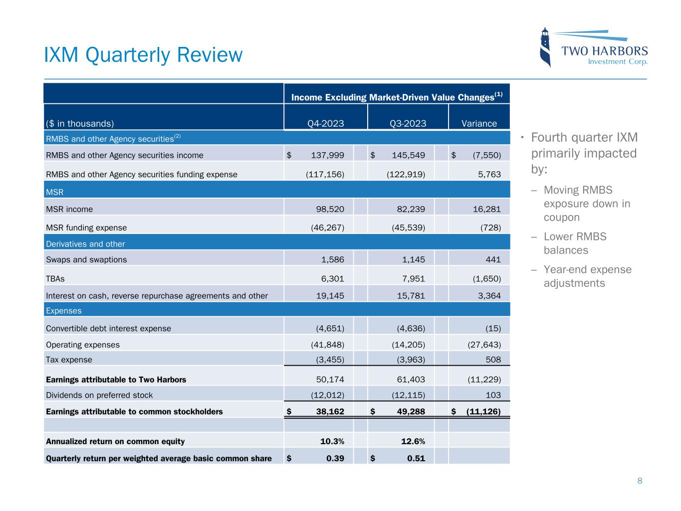 Results and Return Contributions Three Months Ended December 31, 2023 ($ in thousands) GAAP Net Loss Other Comprehensive Income Total Comprehensive Income Market-Driven Value Changes and Certain Operating Expenses(1)(2) Income Excluding Market-Driven Value Changes(3) RMBS and other Agency securities(4) RMBS and other Agency securities income (loss) $ 23,508 $ 483,579 $ 507,087 $ 369,088 $ 137,999 RMBS and other Agency securities funding expense (117,156) (117,156) — (117,156) MSR MSR (loss) income (6,009) (6,009) (104,529) 98,520 MSR funding expense (46,267) (46,267) — (46,267) Derivatives and other Swaps and swaptions (139,234) (139,234) (140,820) 1,586 TBAs 28,967 28,967 22,666 6,301 Futures and options on futures (175,506) (175,506) (175,506) — Interest on cash, reverse repurchase agreements and other 19,145 19,145 — 19,145 Expenses Convertible debt interest expense (4,651) (4,651) — (4,651) Operating expenses (45,256) (45,256) (3,408) (41,848) Tax expense 29,259 29,259 32,714 (3,455) (Losses) earnings attributable to Two Harbors (433,200) 483,579 50,379 205 50,174 Dividends on preferred stock (12,012) (12,012) — (12,012) (Losses) earnings attributable to common stockholders $ (444,693) $ 483,579 $ 38,886 $ 724 $ 38,162 Annualized return on common equity 10.3 % Quarterly return per weighted average basic common share $ 0.39 7 Note: The columns labeled “GAAP Net Loss,” “Other Comprehensive Income,” and “Total Comprehensive Income” are based on the company’s Comprehensive Income (Loss), determined in accordance with GAAP, that has been reorganized into the categories that represent the company’s portfolio of target assets, unsecured and secured financing by asset collateral type, and derivatives and other items. This presentation illustrates both the positive and negative aspects of the company’s GAAP performance for the reporting period and provides a reconciliation with our non-GAAP measures shown in the columns labeled “Market-Driven Value Changes and Certain Operating Expenses” and “Income Excluding Market-Driven Value Changes.”
