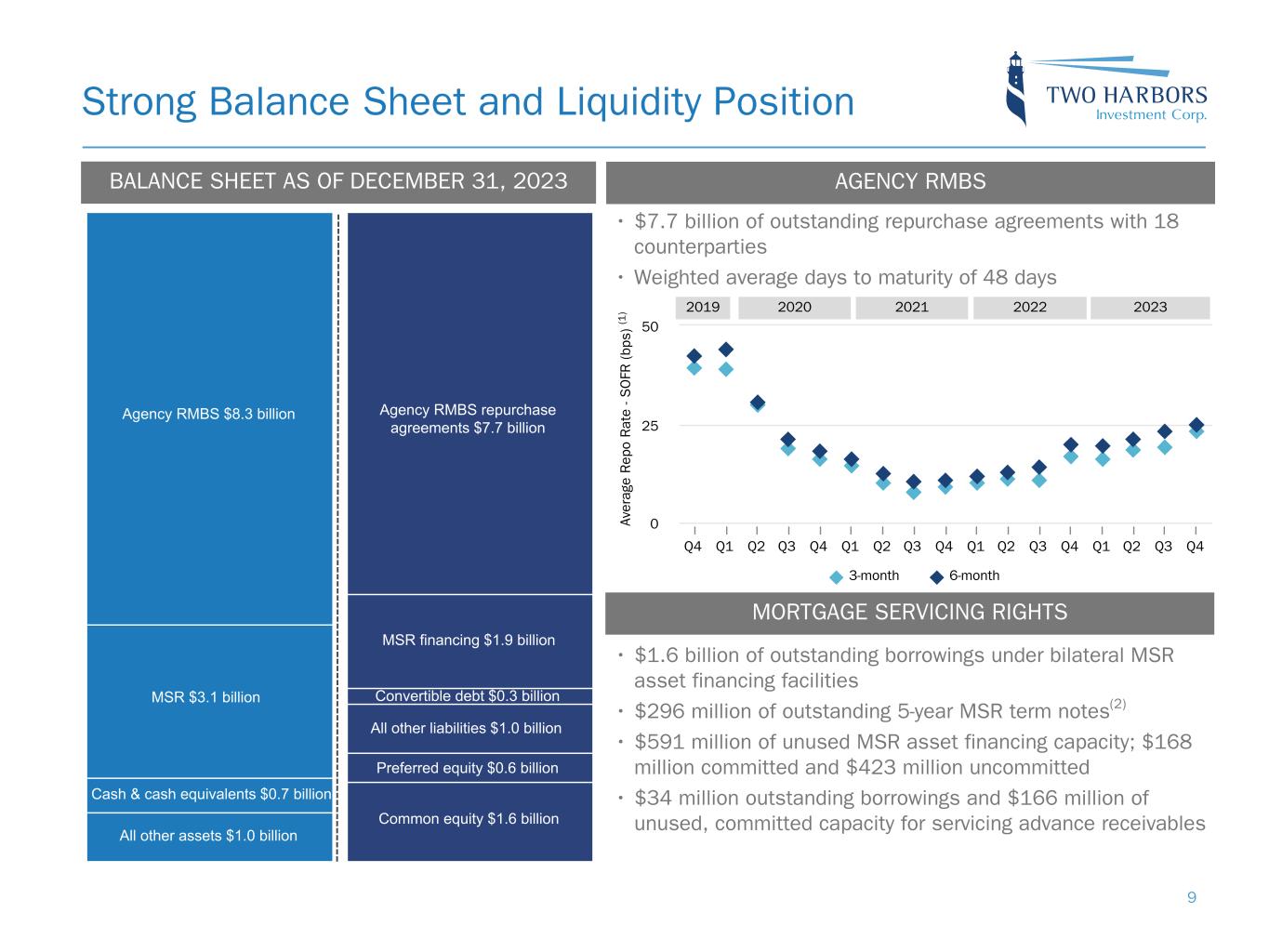 IXM Quarterly Review Income Excluding Market-Driven Value Changes(1) ($ in thousands) Q4-2023 Q3-2023 Variance RMBS and other Agency securities(2) RMBS and other Agency securities income $ 137,999 $ 145,549 $ (7,550) RMBS and other Agency securities funding expense (117,156) (122,919) 5,763 MSR MSR income 98,520 82,239 16,281 MSR funding expense (46,267) (45,539) (728) Derivatives and other Swaps and swaptions 1,586 1,145 441 TBAs 6,301 7,951 (1,650) Interest on cash, reverse repurchase agreements and other 19,145 15,781 3,364 Expenses Convertible debt interest expense (4,651) (4,636) (15) Operating expenses (41,848) (14,205) (27,643) Tax expense (3,455) (3,963) 508 Earnings attributable to Two Harbors 50,174 61,403 (11,229) Dividends on preferred stock (12,012) (12,115) 103 Earnings attributable to common stockholders $ 38,162 $ 49,288 $ (11,126) Annualized return on common equity 10.3 % 12.6 % Quarterly return per weighted average basic common share $ 0.39 $ 0.51 8 • Fourth quarter IXM primarily impacted by: – Moving RMBS exposure down in coupon – Lower RMBS balances – Year-end expense adjustments