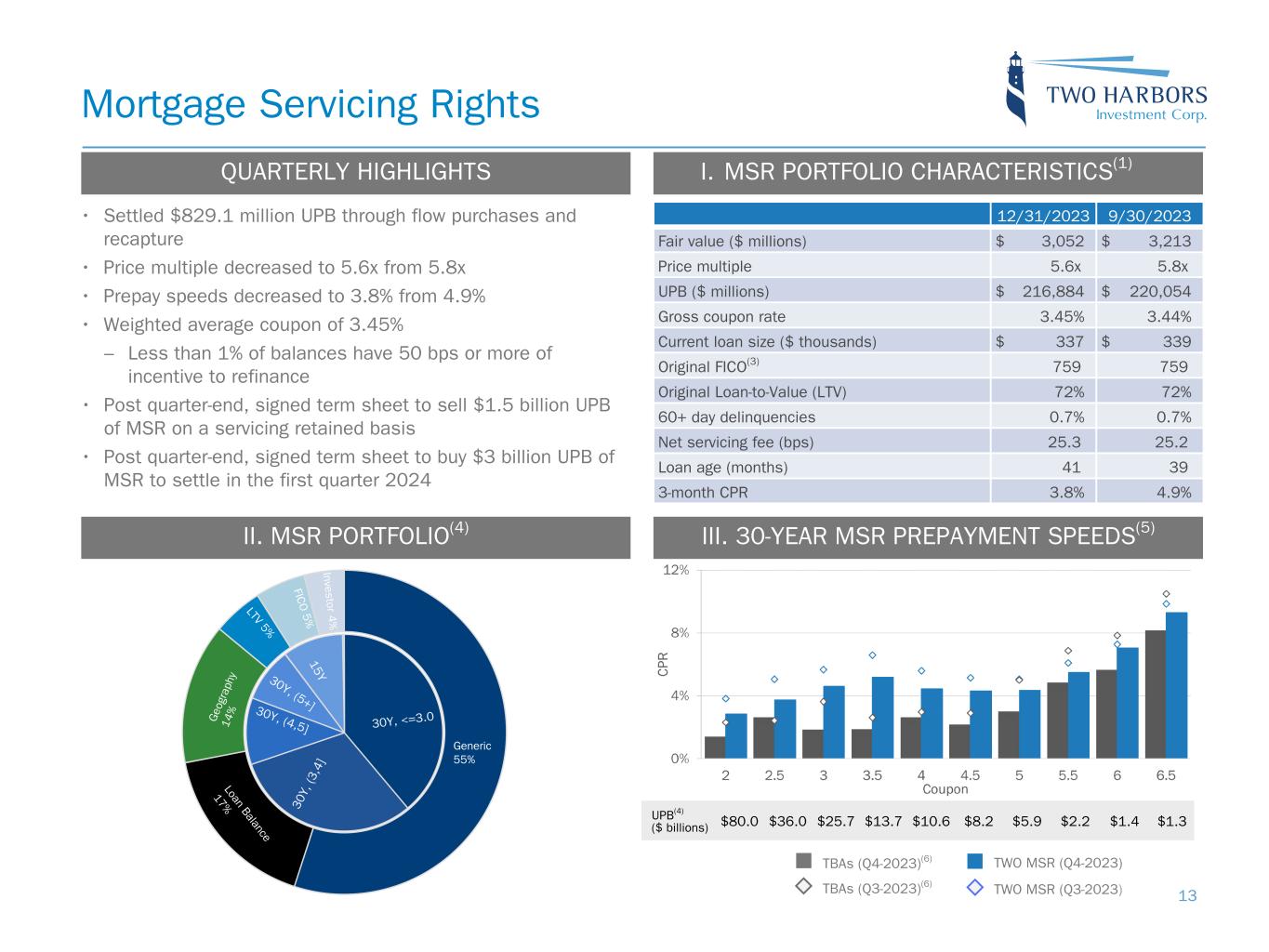 UPB(4) ($ billions) $80.0 $36.0 $25.7 $13.7 $10.6 $8.2 $5.9 $2.2 $1.4 $1.3 • Settled $829.1 million UPB through flow purchases and recapture • Price multiple decreased to 5.6x from 5.8x • Prepay speeds decreased to 3.8% from 4.9% • Weighted average coupon of 3.45% – Less than 1% of balances have 50 bps or more of incentive to refinance • Post quarter-end, signed term sheet to sell $1.5 billion UPB of MSR on a servicing retained basis • Post quarter-end, signed term sheet to buy $3 billion UPB of MSR to settle in the first quarter 2024 Mortgage Servicing Rights III. 30-YEAR MSR PREPAYMENT SPEEDS(5) 12/31/2023 9/30/2023 Fair value ($ millions) $ 3,052 $ 3,213 Price multiple 5.6x 5.8x UPB ($ millions) $ 216,884 $ 220,054 Gross coupon rate 3.45 % 3.44 % Current loan size ($ thousands) $ 337 $ 339 Original FICO(3) 759 759 Original Loan-to-Value (LTV) 72 % 72 % 60+ day delinquencies 0.7 % 0.7 % Net servicing fee (bps) 25.3 25.2 Loan age (months) 41 39 3-month CPR 3.8 % 4.9 % I. MSR PORTFOLIO CHARACTERISTICS(1) TWO MSR (Q4-2023)TBAs (Q4-2023)(6) TBAs (Q3-2023)(6) TWO MSR (Q3-2023) QUARTERLY HIGHLIGHTS II. MSR PORTFOLIO(4) LTV 5% FIC O 5% Investor 4 % G eo gr ap hy 14 % Generic 55% 30 Y, (3 ,4 ] 30Y, (4,5] 15Y 30Y, <=3.0 30Y, (5+] Loan Balance 17% 13