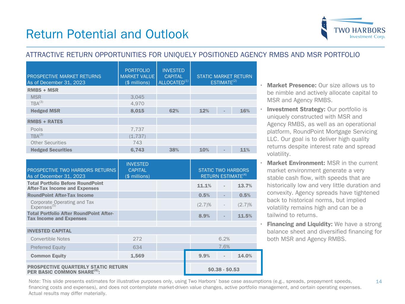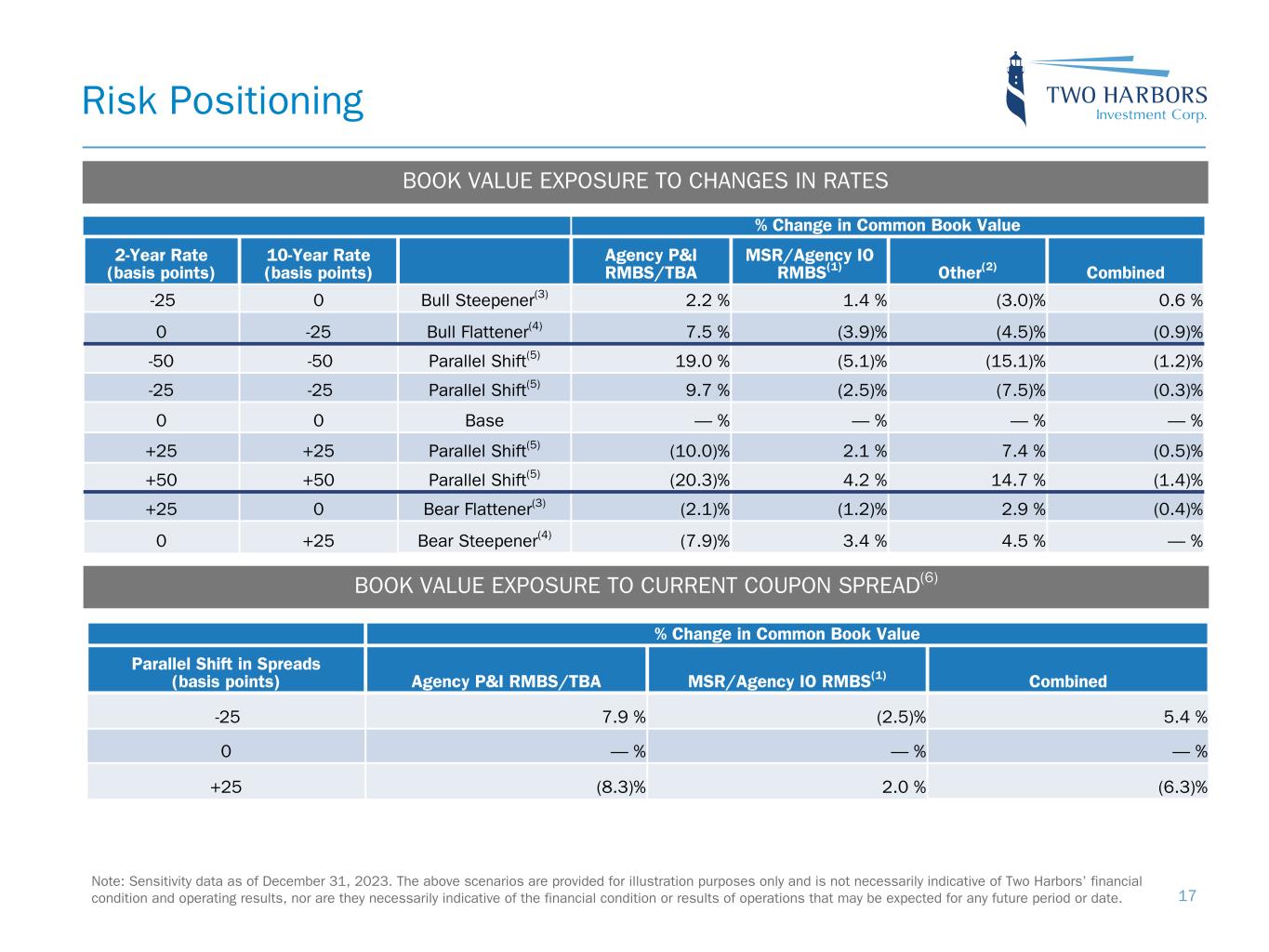 Note: Sensitivity data as of December 31, 2023. The above scenarios are provided for illustration purposes only and is not necessarily indicative of Two Harbors’ financial condition and operating results, nor are they necessarily indicative of the financial condition or results of operations that may be expected for any future period or date. Risk Positioning BOOK VALUE EXPOSURE TO CHANGES IN RATES % Change in Common Book Value 2-Year Rate (basis points) 10-Year Rate (basis points) Agency P&I RMBS/TBA MSR/Agency IO RMBS(1) Other(2) Combined -25 0 Bull Steepener(3) 2.2 % 1.4 % (3.0) % 0.6 % 0 -25 Bull Flattener(4) 7.5 % (3.9) % (4.5) % (0.9) % -50 -50 Parallel Shift(5) 19.0 % (5.1) % (15.1) % (1.2) % -25 -25 Parallel Shift(5) 9.7 % (2.5) % (7.5) % (0.3) % 0 0 Base — % — % — % — % +25 +25 Parallel Shift(5) (10.0) % 2.1 % 7.4 % (0.5) % +50 +50 Parallel Shift(5) (20.3) % 4.2 % 14.7 % (1.4) % +25 0 Bear Flattener(3) (2.1) % (1.2) % 2.9 % (0.4) % 0 +25 Bear Steepener(4) (7.9) % 3.4 % 4.5 % — % BOOK VALUE EXPOSURE TO CURRENT COUPON SPREAD(6) % Change in Common Book Value Parallel Shift in Spreads (basis points) Agency P&I RMBS/TBA MSR/Agency IO RMBS(1) Combined -25 7.9 % (2.5) % 5.4 % 0 — % — % — % +25 (8.3) % 2.0 % (6.3) % 17