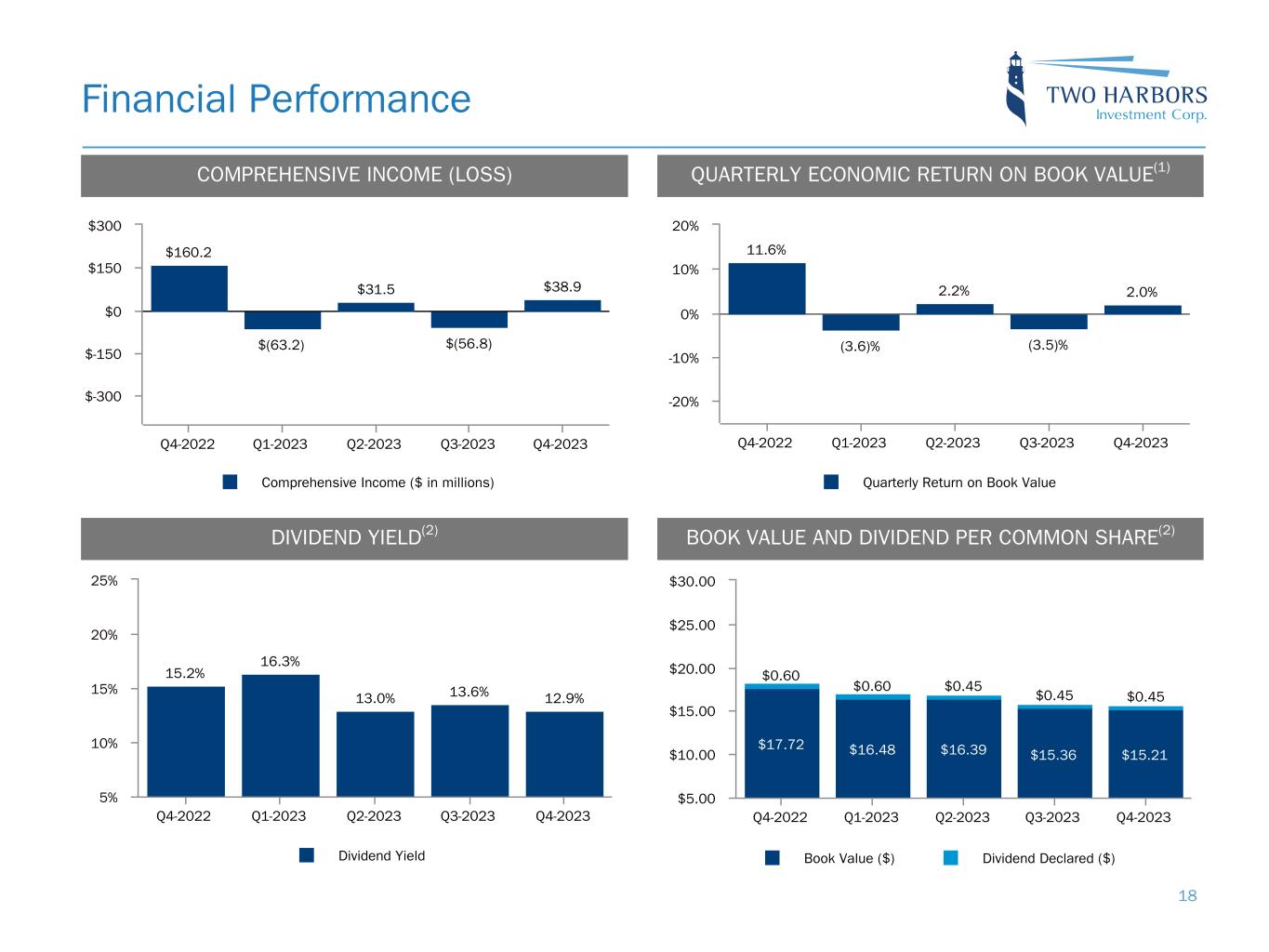 $160.2 $(63.2) $31.5 $(56.8) $38.9 Comprehensive Income ($ in millions) Q4-2022 Q1-2023 Q2-2023 Q3-2023 Q4-2023 $-300 $-150 $0 $150 $300 $17.72 $16.48 $16.39 $15.36 $15.21 $0.60 $0.60 $0.45 $0.45 $0.45 Book Value ($) Dividend Declared ($) Q4-2022 Q1-2023 Q2-2023 Q3-2023 Q4-2023 $5.00 $10.00 $15.00 $20.00 $25.00 $30.00 DIVIDEND YIELD(2) Financial Performance COMPREHENSIVE INCOME (LOSS) QUARTERLY ECONOMIC RETURN ON BOOK VALUE(1) BOOK VALUE AND DIVIDEND PER COMMON SHARE(2) 11.6% (3.6)% 2.2% (3.5)% 2.0% Quarterly Return on Book Value Q4-2022 Q1-2023 Q2-2023 Q3-2023 Q4-2023 -20% -10% 0% 10% 20% 15.2% 16.3% 13.0% 13.6% 12.9% Dividend Yield Q4-2022 Q1-2023 Q2-2023 Q3-2023 Q4-2023 5% 10% 15% 20% 25% 18