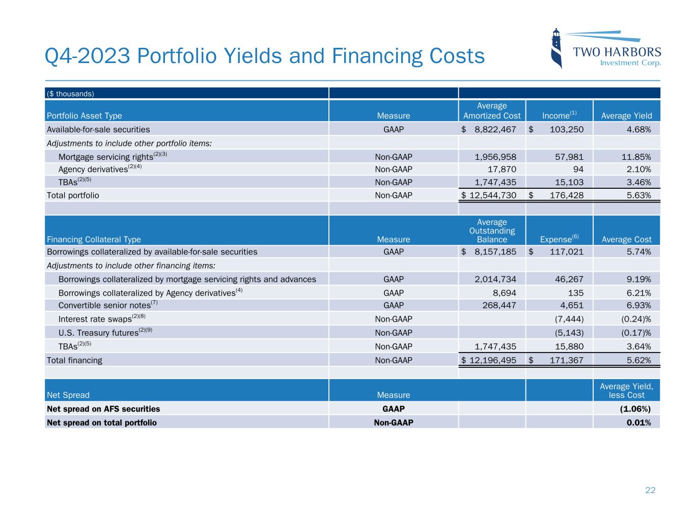 Q4-2023 Portfolio Yields and Financing Costs ($ thousands) Portfolio Asset Type Measure Average Amortized Cost Income(1) Average Yield Available-for-sale securities GAAP $ 8,822,467 $ 103,250 4.68% Adjustments to include other portfolio items: Mortgage servicing rights(2)(3) Non-GAAP 1,956,958 57,981 11.85% Agency derivatives(2)(4) Non-GAAP 17,870 94 2.10 % TBAs(2)(5) Non-GAAP 1,747,435 15,103 3.46 % Total portfolio Non-GAAP $ 12,544,730 $ 176,428 5.63% Financing Collateral Type Measure Average Outstanding Balance Expense(6) Average Cost Borrowings collateralized by available-for-sale securities GAAP $ 8,157,185 $ 117,021 5.74% Adjustments to include other financing items: Borrowings collateralized by mortgage servicing rights and advances GAAP 2,014,734 46,267 9.19 % Borrowings collateralized by Agency derivatives(4) GAAP 8,694 135 6.21 % Convertible senior notes(7) GAAP 268,447 4,651 6.93 % Interest rate swaps(2)(8) Non-GAAP (7,444) (0.24) % U.S. Treasury futures(2)(9) Non-GAAP (5,143) (0.17) % TBAs(2)(5) Non-GAAP 1,747,435 15,880 3.64 % Total financing Non-GAAP $ 12,196,495 $ 171,367 5.62 % Net Spread Measure Average Yield, less Cost Net spread on AFS securities GAAP (1.06%) Net spread on total portfolio Non-GAAP 0.01% 22