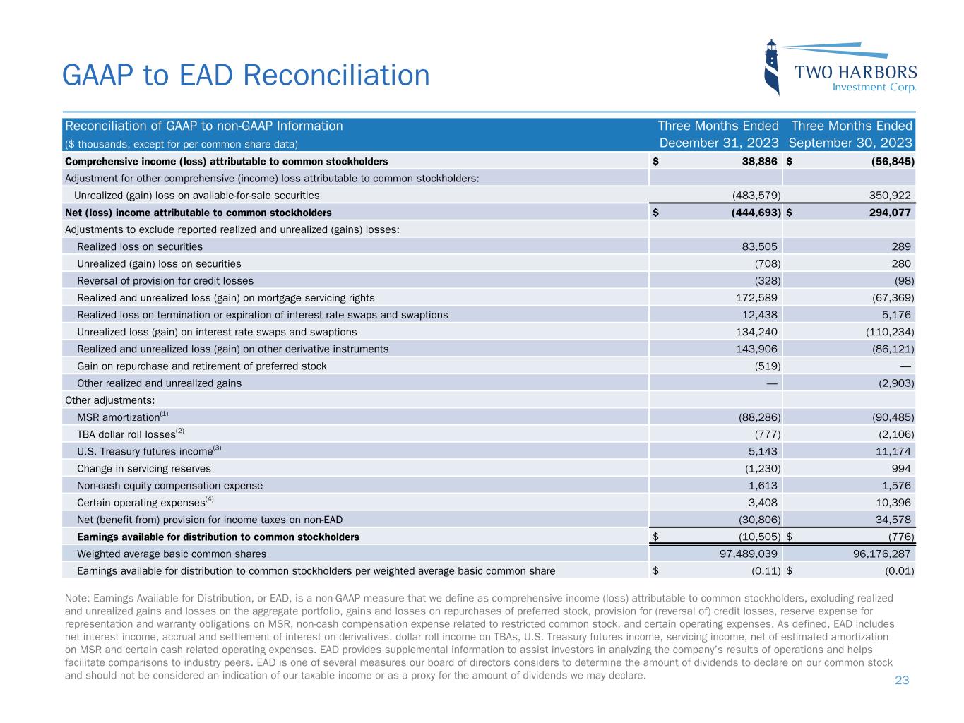 GAAP to EAD Reconciliation Reconciliation of GAAP to non-GAAP Information Three Months Ended Three Months Ended ($ thousands, except for per common share data) December 31, 2023 September 30, 2023 Comprehensive income (loss) attributable to common stockholders $ 38,886 $ (56,845) Adjustment for other comprehensive (income) loss attributable to common stockholders: Unrealized (gain) loss on available-for-sale securities (483,579) 350,922 Net (loss) income attributable to common stockholders $ (444,693) $ 294,077 Adjustments to exclude reported realized and unrealized (gains) losses: Realized loss on securities 83,505 289 Unrealized (gain) loss on securities (708) 280 Reversal of provision for credit losses (328) (98) Realized and unrealized loss (gain) on mortgage servicing rights 172,589 (67,369) Realized loss on termination or expiration of interest rate swaps and swaptions 12,438 5,176 Unrealized loss (gain) on interest rate swaps and swaptions 134,240 (110,234) Realized and unrealized loss (gain) on other derivative instruments 143,906 (86,121) Gain on repurchase and retirement of preferred stock (519) — Other realized and unrealized gains — (2,903) Other adjustments: MSR amortization(1) (88,286) (90,485) TBA dollar roll losses(2) (777) (2,106) U.S. Treasury futures income(3) 5,143 11,174 Change in servicing reserves (1,230) 994 Non-cash equity compensation expense 1,613 1,576 Certain operating expenses(4) 3,408 10,396 Net (benefit from) provision for income taxes on non-EAD (30,806) 34,578 Earnings available for distribution to common stockholders $ (10,505) $ (776) Weighted average basic common shares 97,489,039 96,176,287 Earnings available for distribution to common stockholders per weighted average basic common share $ (0.11) $ (0.01) Note: Earnings Available for Distribution, or EAD, is a non-GAAP measure that we define as comprehensive income (loss) attributable to common stockholders, excluding realized and unrealized gains and losses on the aggregate portfolio, gains and losses on repurchases of preferred stock, provision for (reversal of) credit losses, reserve expense for representation and warranty obligations on MSR, non-cash compensation expense related to restricted common stock, and certain operating expenses. As defined, EAD includes net interest income, accrual and settlement of interest on derivatives, dollar roll income on TBAs, U.S. Treasury futures income, servicing income, net of estimated amortization on MSR and certain cash related operating expenses. EAD provides supplemental information to assist investors in analyzing the company’s results of operations and helps facilitate comparisons to industry peers. EAD is one of several measures our board of directors considers to determine the amount of dividends to declare on our common stock and should not be considered an indication of our taxable income or as a proxy for the amount of dividends we may declare. 23