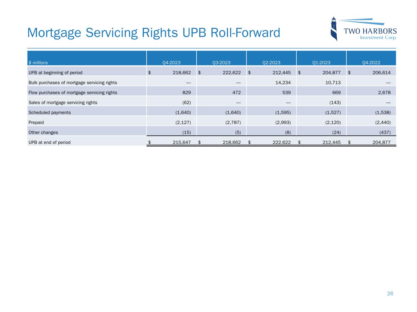 Mortgage Servicing Rights UPB Roll-Forward $ millions Q4-2023 Q3-2023 Q2-2023 Q1-2023 Q4-2022 UPB at beginning of period $ 218,662 $ 222,622 $ 212,445 $ 204,877 $ 206,614 Bulk purchases of mortgage servicing rights — — 14,234 10,713 — Flow purchases of mortgage servicing rights 829 472 539 669 2,678 Sales of mortgage servicing rights (62) — — (143) — Scheduled payments (1,640) (1,640) (1,595) (1,527) (1,538) Prepaid (2,127) (2,787) (2,993) (2,120) (2,440) Other changes (15) (5) (8) (24) (437) UPB at end of period $ 215,647 $ 218,662 $ 222,622 $ 212,445 $ 204,877 26
