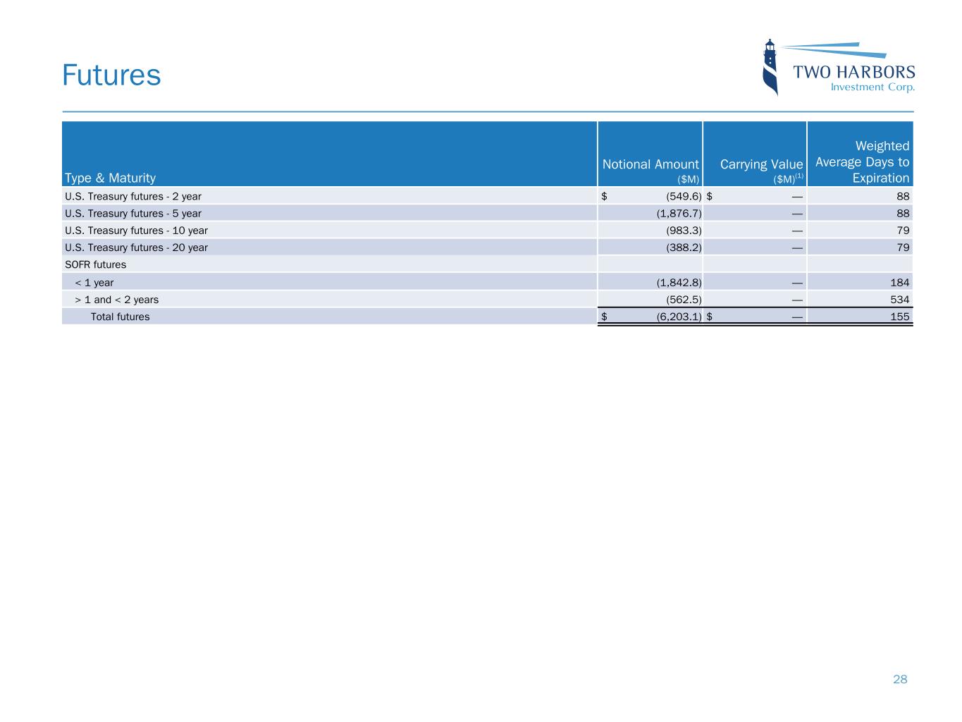Type & Maturity Notional Amount ($M) Carrying Value ($M)(1) Weighted Average Days to Expiration U.S. Treasury futures - 2 year $ (549.6) $ — 88 U.S. Treasury futures - 5 year (1,876.7) — 88 U.S. Treasury futures - 10 year (983.3) — 79 U.S. Treasury futures - 20 year (388.2) — 79 SOFR futures < 1 year (1,842.8) — 184 > 1 and < 2 years (562.5) — 534 Total futures $ (6,203.1) $ — 155 Futures 28
