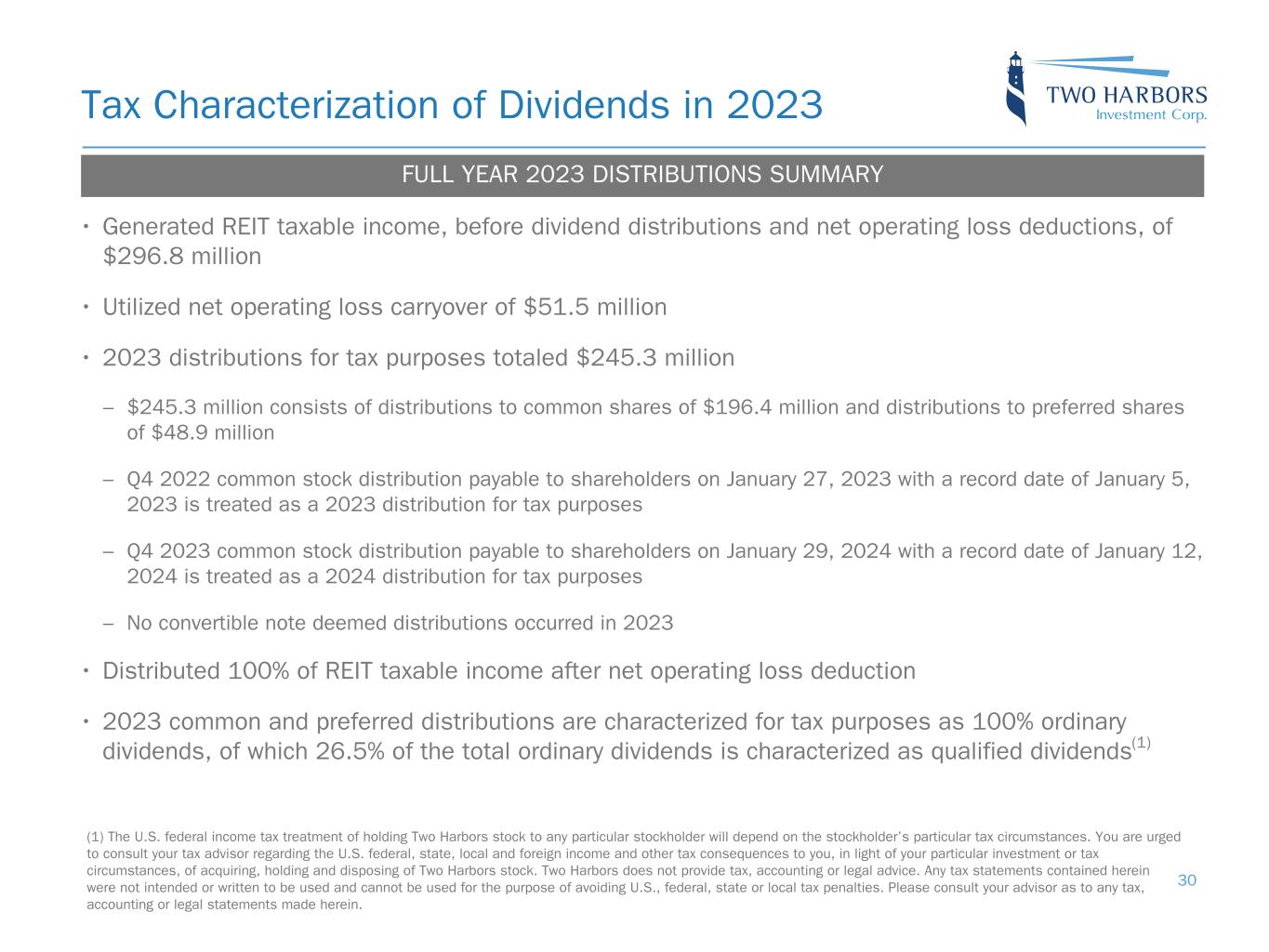 Tax Characterization of Dividends in 2023 30 FULL YEAR 2023 DISTRIBUTIONS SUMMARY • Generated REIT taxable income, before dividend distributions and net operating loss deductions, of $296.8 million • Utilized net operating loss carryover of $51.5 million • 2023 distributions for tax purposes totaled $245.3 million – $245.3 million consists of distributions to common shares of $196.4 million and distributions to preferred shares of $48.9 million – Q4 2022 common stock distribution payable to shareholders on January 27, 2023 with a record date of January 5, 2023 is treated as a 2023 distribution for tax purposes – Q4 2023 common stock distribution payable to shareholders on January 29, 2024 with a record date of January 12, 2024 is treated as a 2024 distribution for tax purposes – No convertible note deemed distributions occurred in 2023 • Distributed 100% of REIT taxable income after net operating loss deduction • 2023 common and preferred distributions are characterized for tax purposes as 100% ordinary dividends, of which 26.5% of the total ordinary dividends is characterized as qualified dividends(1) (1) The U.S. federal income tax treatment of holding Two Harbors stock to any particular stockholder will depend on the stockholder’s particular tax circumstances. You are urged to consult your tax advisor regarding the U.S. federal, state, local and foreign income and other tax consequences to you, in light of your particular investment or tax circumstances, of acquiring, holding and disposing of Two Harbors stock. Two Harbors does not provide tax, accounting or legal advice. Any tax statements contained herein were not intended or written to be used and cannot be used for the purpose of avoiding U.S., federal, state or local tax penalties. Please consult your advisor as to any tax, accounting or legal statements made herein.