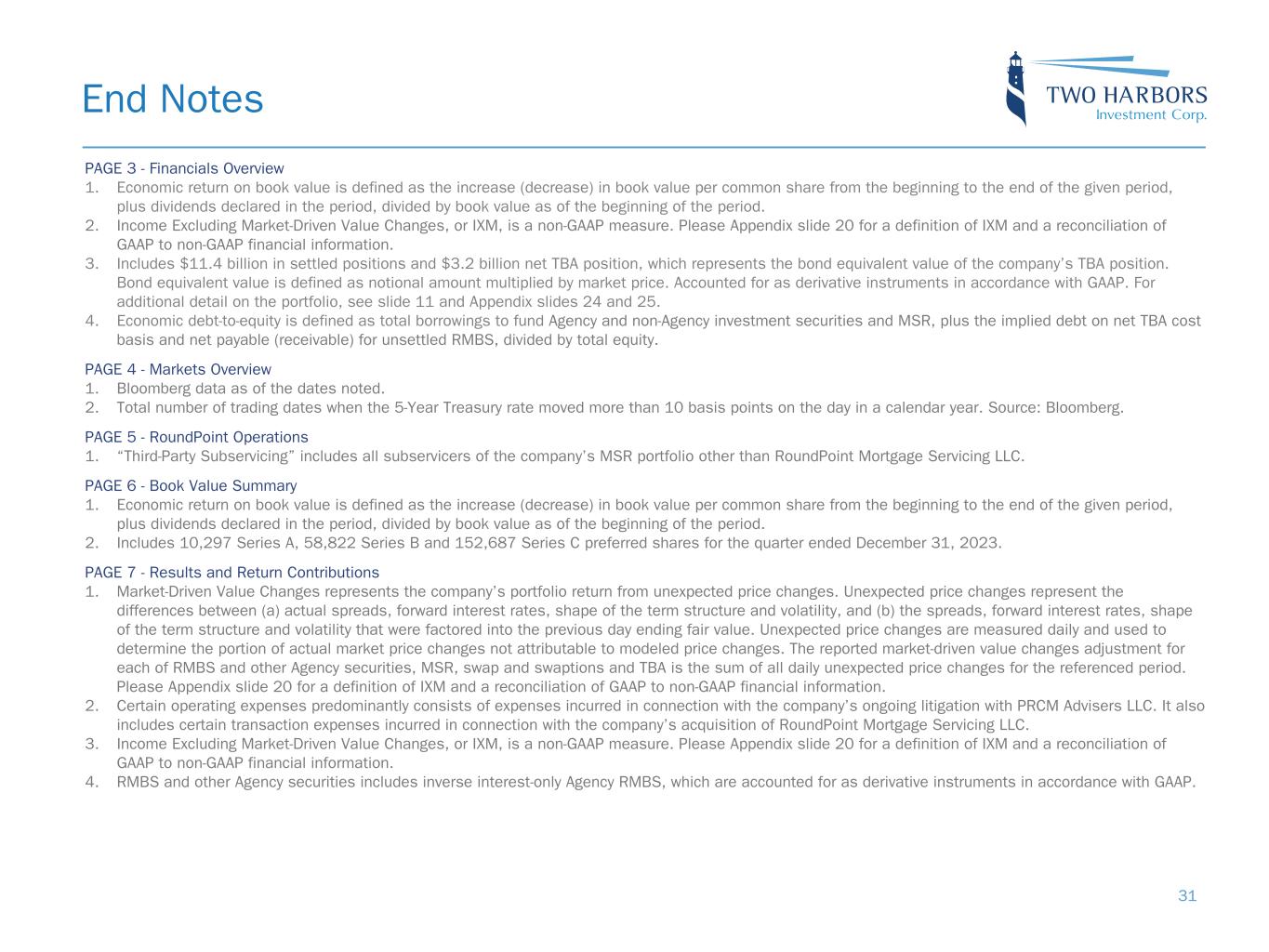 PAGE 3 - Financials Overview 1. Economic return on book value is defined as the increase (decrease) in book value per common share from the beginning to the end of the given period, plus dividends declared in the period, divided by book value as of the beginning of the period. 2. Income Excluding Market-Driven Value Changes, or IXM, is a non-GAAP measure. Please Appendix slide 20 for a definition of IXM and a reconciliation of GAAP to non-GAAP financial information. 3. Includes $11.4 billion in settled positions and $3.2 billion net TBA position, which represents the bond equivalent value of the company’s TBA position. Bond equivalent value is defined as notional amount multiplied by market price. Accounted for as derivative instruments in accordance with GAAP. For additional detail on the portfolio, see slide 11 and Appendix slides 24 and 25. 4. Economic debt-to-equity is defined as total borrowings to fund Agency and non-Agency investment securities and MSR, plus the implied debt on net TBA cost basis and net payable (receivable) for unsettled RMBS, divided by total equity. PAGE 4 - Markets Overview 1. Bloomberg data as of the dates noted. 2. Total number of trading dates when the 5-Year Treasury rate moved more than 10 basis points on the day in a calendar year. Source: Bloomberg. PAGE 5 - RoundPoint Operations 1. “Third-Party Subservicing” includes all subservicers of the company’s MSR portfolio other than RoundPoint Mortgage Servicing LLC. PAGE 6 - Book Value Summary 1. Economic return on book value is defined as the increase (decrease) in book value per common share from the beginning to the end of the given period, plus dividends declared in the period, divided by book value as of the beginning of the period. 2. Includes 10,297 Series A, 58,822 Series B and 152,687 Series C preferred shares for the quarter ended December 31, 2023. PAGE 7 - Results and Return Contributions 1. Market-Driven Value Changes represents the company’s portfolio return from unexpected price changes. Unexpected price changes represent the differences between (a) actual spreads, forward interest rates, shape of the term structure and volatility, and (b) the spreads, forward interest rates, shape of the term structure and volatility that were factored into the previous day ending fair value. Unexpected price changes are measured daily and used to determine the portion of actual market price changes not attributable to modeled price changes. The reported market-driven value changes adjustment for each of RMBS and other Agency securities, MSR, swap and swaptions and TBA is the sum of all daily unexpected price changes for the referenced period. Please Appendix slide 20 for a definition of IXM and a reconciliation of GAAP to non-GAAP financial information. 2. Certain operating expenses predominantly consists of expenses incurred in connection with the company’s ongoing litigation with PRCM Advisers LLC. It also includes certain transaction expenses incurred in connection with the company’s acquisition of RoundPoint Mortgage Servicing LLC. 3. Income Excluding Market-Driven Value Changes, or IXM, is a non-GAAP measure. Please Appendix slide 20 for a definition of IXM and a reconciliation of GAAP to non-GAAP financial information. 4. RMBS and other Agency securities includes inverse interest-only Agency RMBS, which are accounted for as derivative instruments in accordance with GAAP. End Notes 31