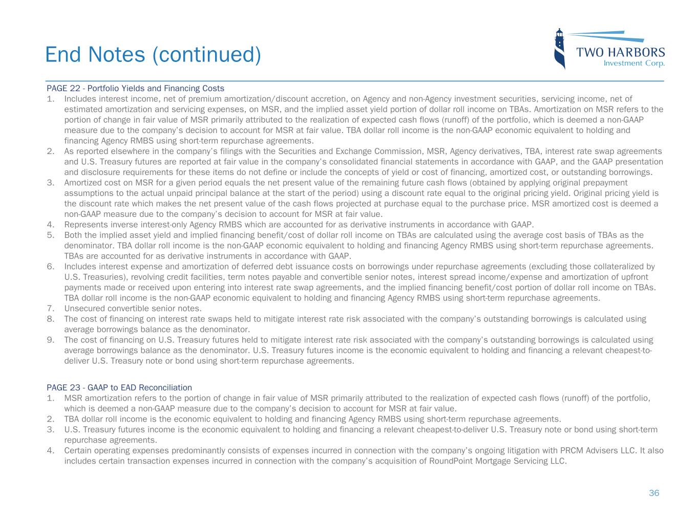 End Notes (continued) PAGE 20 - GAAP to IXM Reconciliation 1. The market-driven value changes adjustment for each of RMBS and other Agency securities, MSR, swap and swaptions and TBA represents unexpected price changes for the referenced period. As defined, the calculation of IXM includes modeled price changes that are measured daily based on a “Realized Forwards” methodology, which includes the assumption that spreads, forward interest rates, shape of the term structure and volatility factored into the previous day ending fair value are unchanged. Unexpected price changes represent the differences between (a) actual spreads, forward interest rates, shape of the term structure and volatility, and (b) the spreads, forward interest rates, shape of the term structure and volatility that were factored into the previous day ending fair value. Unexpected price changes are measured daily and used to determine the portion of actual market price changes not attributable to modeled price changes. The reported market-driven value changes adjustment for each of RMBS and other Agency securities, MSR, swap and swaptions and TBA is the sum of all daily unexpected price changes for the referenced period. Please refer to end notes (2) through (5) for this slide for further information. 2. RMBS and other Agency securities market-driven value changes refers to the sum of interest income, realized and unrealized gains and losses on RMBS and other Agency securities, less the sum of the realization of RMBS and other Agency securities cash flows which incorporates actual prepayments, changes in RMBS and other Agency securities accrued interest, and modeled price changes. Modeled price changes are measured daily based on a “Realized Forwards” methodology, which includes the assumption that spreads, forward interest rates, shape of the term structure and volatility factored into the previous day ending fair value are unchanged. RMBS and other Agency securities includes inverse interest-only Agency RMBS which are accounted for as derivative instruments in accordance with GAAP. 3. MSR market-driven value changes refers to the sum of servicing income, servicing expenses, realized and unrealized gains and losses on MSR, less the sum of the realization of MSR cash flows which incorporates actual prepayments, servicing income and servicing expenses, and modeled price changes. Modeled price changes are measured daily based on a “Realized Forwards” methodology, which includes the assumption that spreads, forward interest rates, shape of the term structure and volatility factored into the previous day ending fair value are unchanged. 4. Swap and swaption market-driven value changes refers to the net interest spread and realized and unrealized gains and losses on interest rate swap and swaption agreements, less the swaps daily IXM that is equal to the previous day ending fair value, multiplied by the overnight SOFR and swaptions daily IXM that is equal to the previous day ending fair value, multiplied by the realized forward rate. 5. TBA market-driven value changes refers to the total realized and unrealized gains and losses, less the daily zero-volatility OAS less the implied repo spread, multiplied by the previous day ending fair value. 6. Certain operating expenses predominantly consists of expenses incurred in connection with the company’s ongoing litigation with PRCM Advisers LLC. It also includes certain transaction expenses incurred in connection with the company’s acquisition of RoundPoint Mortgage Servicing LLC. PAGE 21 - Earnings Available for Distribution 1. MSR amortization refers to the portion of change in fair value of MSR primarily attributed to the realization of expected cash flows (runoff) of the portfolio, which is deemed a non-GAAP measure due to the company’s decision to account for MSR at fair value. 2. TBA dollar roll income is the economic equivalent to holding and financing Agency RMBS using short-term repurchase agreements. 3. U.S. Treasury futures income is the economic equivalent to holding and financing a relevant cheapest-to-deliver U.S. Treasury note or bond using short- term repurchase agreements. 4. Earnings Available for Distribution, or EAD, is a non-GAAP measure. Please see Appendix slide 23 for a definition of EAD and a reconciliation of GAAP to non-GAAP financial information. 5. Certain operating expenses predominantly consists of expenses incurred in connection with the company’s ongoing litigation with PRCM Advisers LLC. It also includes certain transaction expenses incurred in connection with the company’s acquisition of RoundPoint Mortgage Servicing LLC. 6. Agency fixed-rate RMBS use the GAAP concept of amortized cost and yield-to-maturity determined at time of purchase. Net servicing income and MSR amortization is based on original pricing yield and does not include the benefit of increased float income and lower compensating interest. Financing costs are largely variable and short-term, responding more quickly to rising rates than our longer-term assets. U.S. Treasury futures income represents the sum of the implied net cash and expected change in price of a financed U.S. Treasury security, but excludes unexpected price change. 35