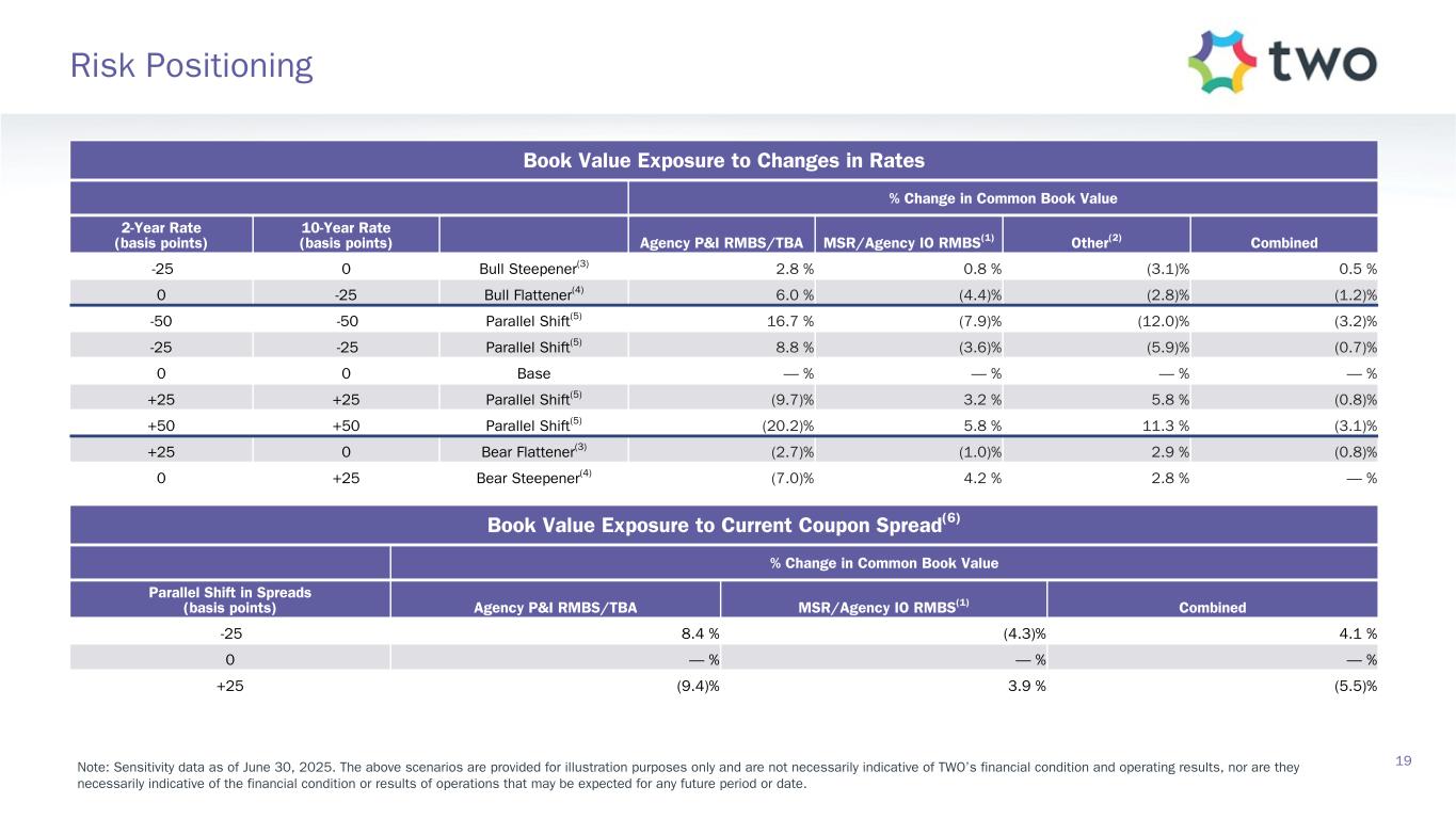 Note: Sensitivity data as of June 30, 2025. The above scenarios are provided for illustration purposes only and are not necessarily indicative of TWO’s financial condition and operating results, nor are they necessarily indicative of the financial condition or results of operations that may be expected for any future period or date. Book Value Exposure to Changes in Rates % Change in Common Book Value 2-Year Rate (basis points) 10-Year Rate (basis points) Agency P&I RMBS/TBA MSR/Agency IO RMBS(1) Other(2) Combined -25 0 Bull Steepener(3) 2.8 % 0.8 % (3.1) % 0.5 % 0 -25 Bull Flattener(4) 6.0 % (4.4) % (2.8) % (1.2) % -50 -50 Parallel Shift(5) 16.7 % (7.9) % (12.0) % (3.2) % -25 -25 Parallel Shift(5) 8.8 % (3.6) % (5.9) % (0.7) % 0 0 Base — % — % — % — % +25 +25 Parallel Shift(5) (9.7) % 3.2 % 5.8 % (0.8) % +50 +50 Parallel Shift(5) (20.2) % 5.8 % 11.3 % (3.1) % +25 0 Bear Flattener(3) (2.7) % (1.0) % 2.9 % (0.8) % 0 +25 Bear Steepener(4) (7.0) % 4.2 % 2.8 % — % Book Value Exposure to Current Coupon Spread(6) % Change in Common Book Value Parallel Shift in Spreads (basis points) Agency P&I RMBS/TBA MSR/Agency IO RMBS(1) Combined -25 8.4 % (4.3) % 4.1 % 0 — % — % — % +25 (9.4) % 3.9 % (5.5) % 19 Risk Positioning