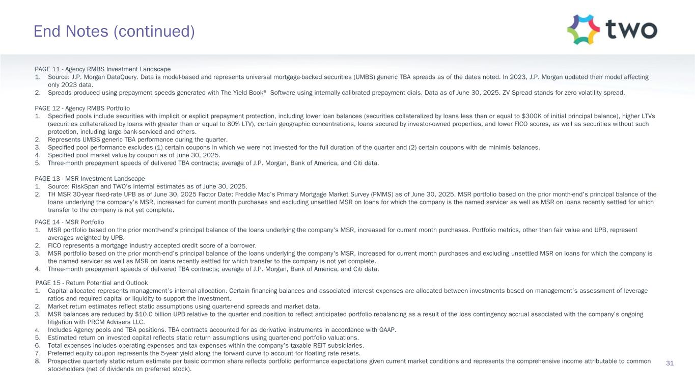 PAGE 11 - Agency RMBS Investment Landscape 1. Source: J.P. Morgan DataQuery. Data is model-based and represents universal mortgage-backed securities (UMBS) generic TBA spreads as of the dates noted. In 2023, J.P. Morgan updated their model affecting only 2023 data. 2. Spreads produced using prepayment speeds generated with The Yield Book® Software using internally calibrated prepayment dials. Data as of June 30, 2025. ZV Spread stands for zero volatility spread. PAGE 12 - Agency RMBS Portfolio 1. Specified pools include securities with implicit or explicit prepayment protection, including lower loan balances (securities collateralized by loans less than or equal to $300K of initial principal balance), higher LTVs (securities collateralized by loans with greater than or equal to 80% LTV), certain geographic concentrations, loans secured by investor-owned properties, and lower FICO scores, as well as securities without such protection, including large bank-serviced and others. 2. Represents UMBS generic TBA performance during the quarter. 3. Specified pool performance excludes (1) certain coupons in which we were not invested for the full duration of the quarter and (2) certain coupons with de minimis balances. 4. Specified pool market value by coupon as of June 30, 2025. 5. Three-month prepayment speeds of delivered TBA contracts; average of J.P. Morgan, Bank of America, and Citi data. PAGE 13 - MSR Investment Landscape 1. Source: RiskSpan and TWO’s internal estimates as of June 30, 2025. 2. TH MSR 30-year fixed-rate UPB as of June 30, 2025 Factor Date; Freddie Mac’s Primary Mortgage Market Survey (PMMS) as of June 30, 2025. MSR portfolio based on the prior month-end's principal balance of the loans underlying the company's MSR, increased for current month purchases and excluding unsettled MSR on loans for which the company is the named servicer as well as MSR on loans recently settled for which transfer to the company is not yet complete. PAGE 14 - MSR Portfolio 1. MSR portfolio based on the prior month-end's principal balance of the loans underlying the company's MSR, increased for current month purchases. Portfolio metrics, other than fair value and UPB, represent averages weighted by UPB. 2. FICO represents a mortgage industry accepted credit score of a borrower. 3. MSR portfolio based on the prior month-end's principal balance of the loans underlying the company's MSR, increased for current month purchases and excluding unsettled MSR on loans for which the company is the named servicer as well as MSR on loans recently settled for which transfer to the company is not yet complete. 4. Three-month prepayment speeds of delivered TBA contracts; average of J.P. Morgan, Bank of America, and Citi data. PAGE 15 - Return Potential and Outlook 1. Capital allocated represents management’s internal allocation. Certain financing balances and associated interest expenses are allocated between investments based on management’s assessment of leverage ratios and required capital or liquidity to support the investment. 2. Market return estimates reflect static assumptions using quarter-end spreads and market data. 3. MSR balances are reduced by $10.0 billion UPB relative to the quarter end position to reflect anticipated portfolio rebalancing as a result of the loss contingency accrual associated with the company’s ongoing litigation with PRCM Advisers LLC. 4. Includes Agency pools and TBA positions. TBA contracts accounted for as derivative instruments in accordance with GAAP. 5. Estimated return on invested capital reflects static return assumptions using quarter-end portfolio valuations. 6. Total expenses includes operating expenses and tax expenses within the company’s taxable REIT subsidiaries. 7. Preferred equity coupon represents the 5-year yield along the forward curve to account for floating rate resets. 8. Prospective quarterly static return estimate per basic common share reflects portfolio performance expectations given current market conditions and represents the comprehensive income attributable to common stockholders (net of dividends on preferred stock). 31 End Notes (continued)