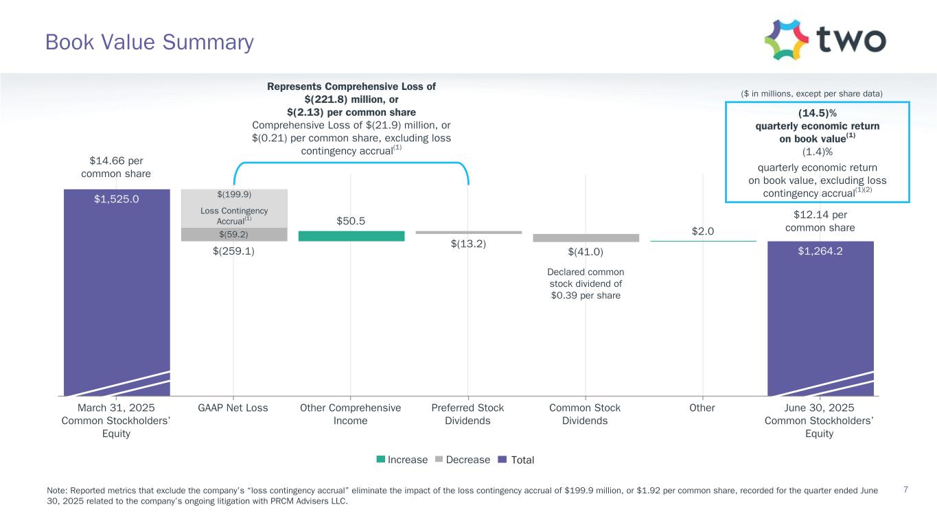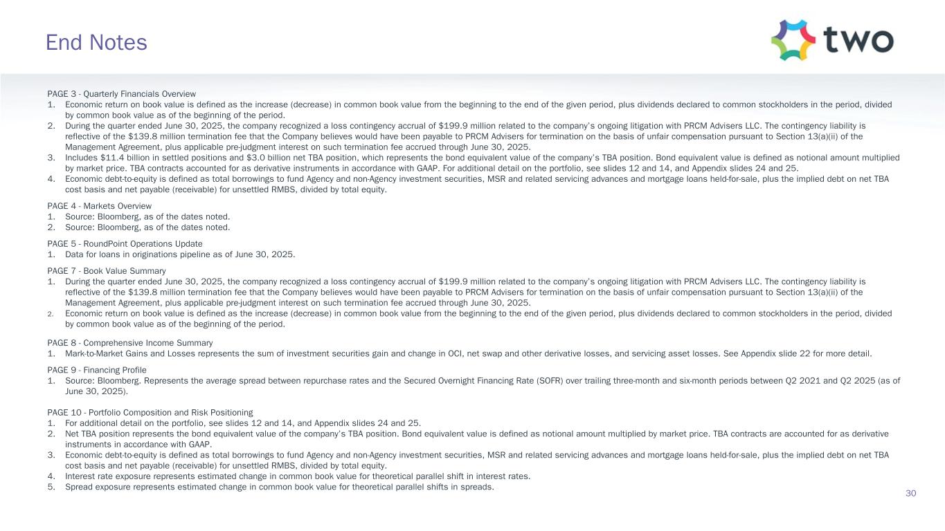 PAGE 11 - Agency RMBS Investment Landscape 1. Source: J.P. Morgan DataQuery. Data is model-based and represents universal mortgage-backed securities (UMBS) generic TBA spreads as of the dates noted. In 2023, J.P. Morgan updated their model affecting only 2023 data. 2. Spreads produced using prepayment speeds generated with The Yield Book® Software using internally calibrated prepayment dials. Data as of June 30, 2025. ZV Spread stands for zero volatility spread. PAGE 12 - Agency RMBS Portfolio 1. Specified pools include securities with implicit or explicit prepayment protection, including lower loan balances (securities collateralized by loans less than or equal to $300K of initial principal balance), higher LTVs (securities collateralized by loans with greater than or equal to 80% LTV), certain geographic concentrations, loans secured by investor-owned properties, and lower FICO scores, as well as securities without such protection, including large bank-serviced and others. 2. Represents UMBS generic TBA performance during the quarter. 3. Specified pool performance excludes (1) certain coupons in which we were not invested for the full duration of the quarter and (2) certain coupons with de minimis balances. 4. Specified pool market value by coupon as of June 30, 2025. 5. Three-month prepayment speeds of delivered TBA contracts; average of J.P. Morgan, Bank of America, and Citi data. PAGE 13 - MSR Investment Landscape 1. Source: RiskSpan and TWO’s internal estimates as of June 30, 2025. 2. TH MSR 30-year fixed-rate UPB as of June 30, 2025 Factor Date; Freddie Mac’s Primary Mortgage Market Survey (PMMS) as of June 30, 2025. MSR portfolio based on the prior month-end's principal balance of the loans underlying the company's MSR, increased for current month purchases and excluding unsettled MSR on loans for which the company is the named servicer as well as MSR on loans recently settled for which transfer to the company is not yet complete. PAGE 14 - MSR Portfolio 1. MSR portfolio based on the prior month-end's principal balance of the loans underlying the company's MSR, increased for current month purchases. Portfolio metrics, other than fair value and UPB, represent averages weighted by UPB. 2. FICO represents a mortgage industry accepted credit score of a borrower. 3. MSR portfolio based on the prior month-end's principal balance of the loans underlying the company's MSR, increased for current month purchases and excluding unsettled MSR on loans for which the company is the named servicer as well as MSR on loans recently settled for which transfer to the company is not yet complete. 4. Three-month prepayment speeds of delivered TBA contracts; average of J.P. Morgan, Bank of America, and Citi data. PAGE 15 - Return Potential and Outlook 1. Capital allocated represents management’s internal allocation. Certain financing balances and associated interest expenses are allocated between investments based on management’s assessment of leverage ratios and required capital or liquidity to support the investment. 2. Market return estimates reflect static assumptions using quarter-end spreads and market data. 3. MSR balances are reduced by $10.0 billion UPB relative to the quarter end position to reflect anticipated portfolio rebalancing as a result of the loss contingency accrual associated with the company’s ongoing litigation with PRCM Advisers LLC. 4. Includes Agency pools and TBA positions. TBA contracts accounted for as derivative instruments in accordance with GAAP. 5. Estimated return on invested capital reflects static return assumptions using quarter-end portfolio valuations. 6. Total expenses includes operating expenses and tax expenses within the company’s taxable REIT subsidiaries. 7. Preferred equity coupon represents the 5-year yield along the forward curve to account for floating rate resets. 8. Prospective quarterly static return estimate per basic common share reflects portfolio performance expectations given current market conditions and represents the comprehensive income attributable to common stockholders (net of dividends on preferred stock). 31 End Notes (continued)