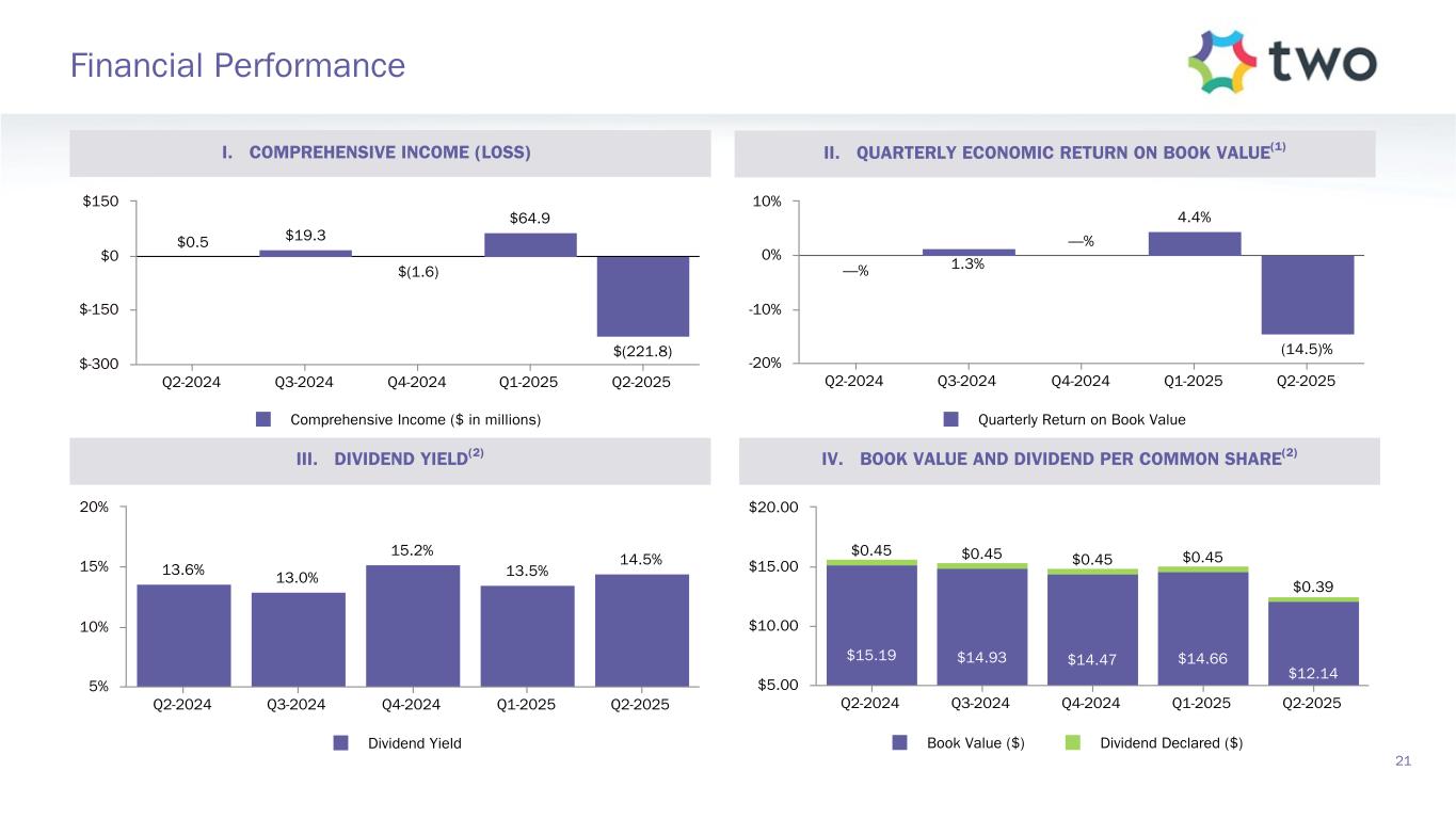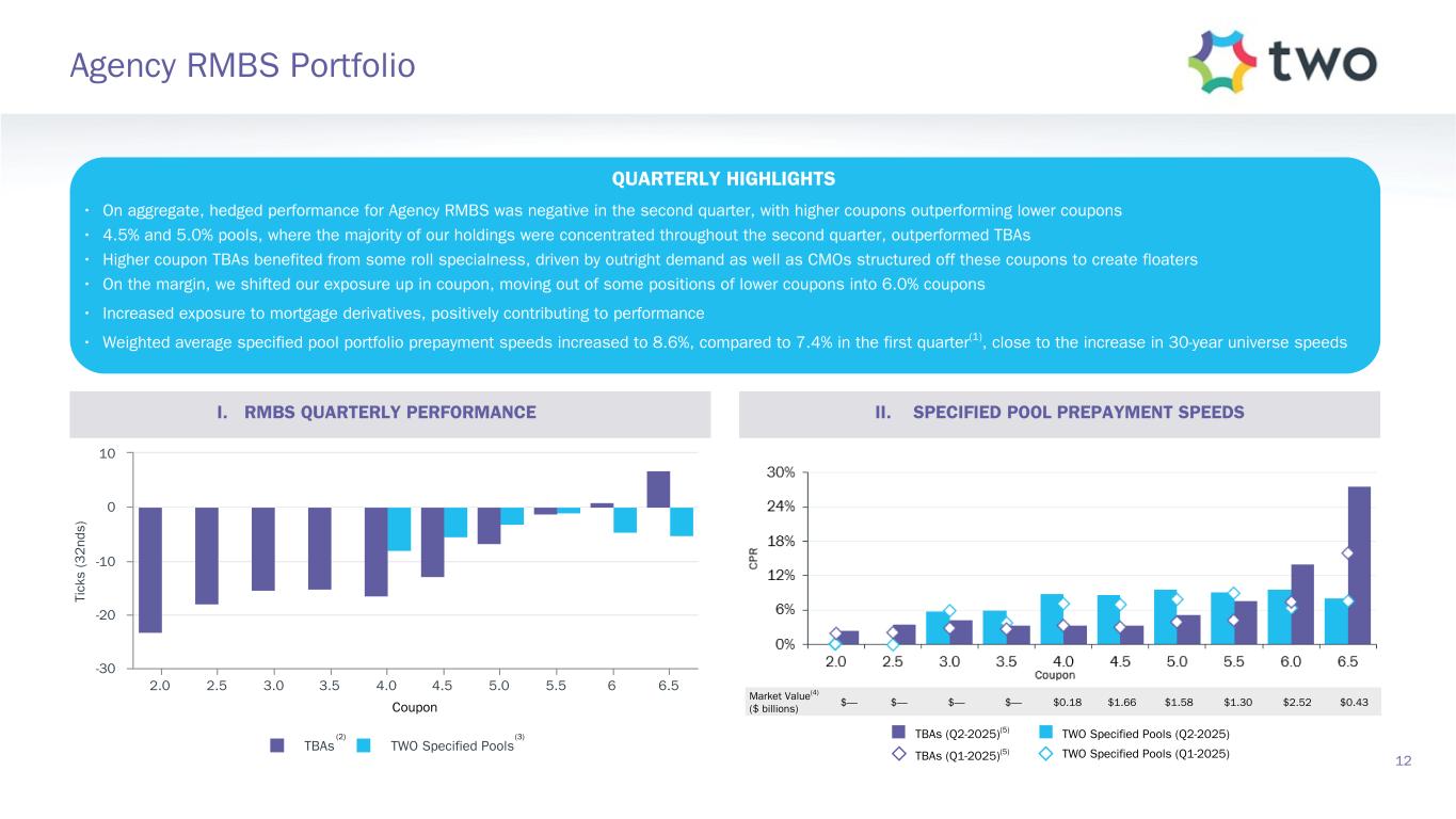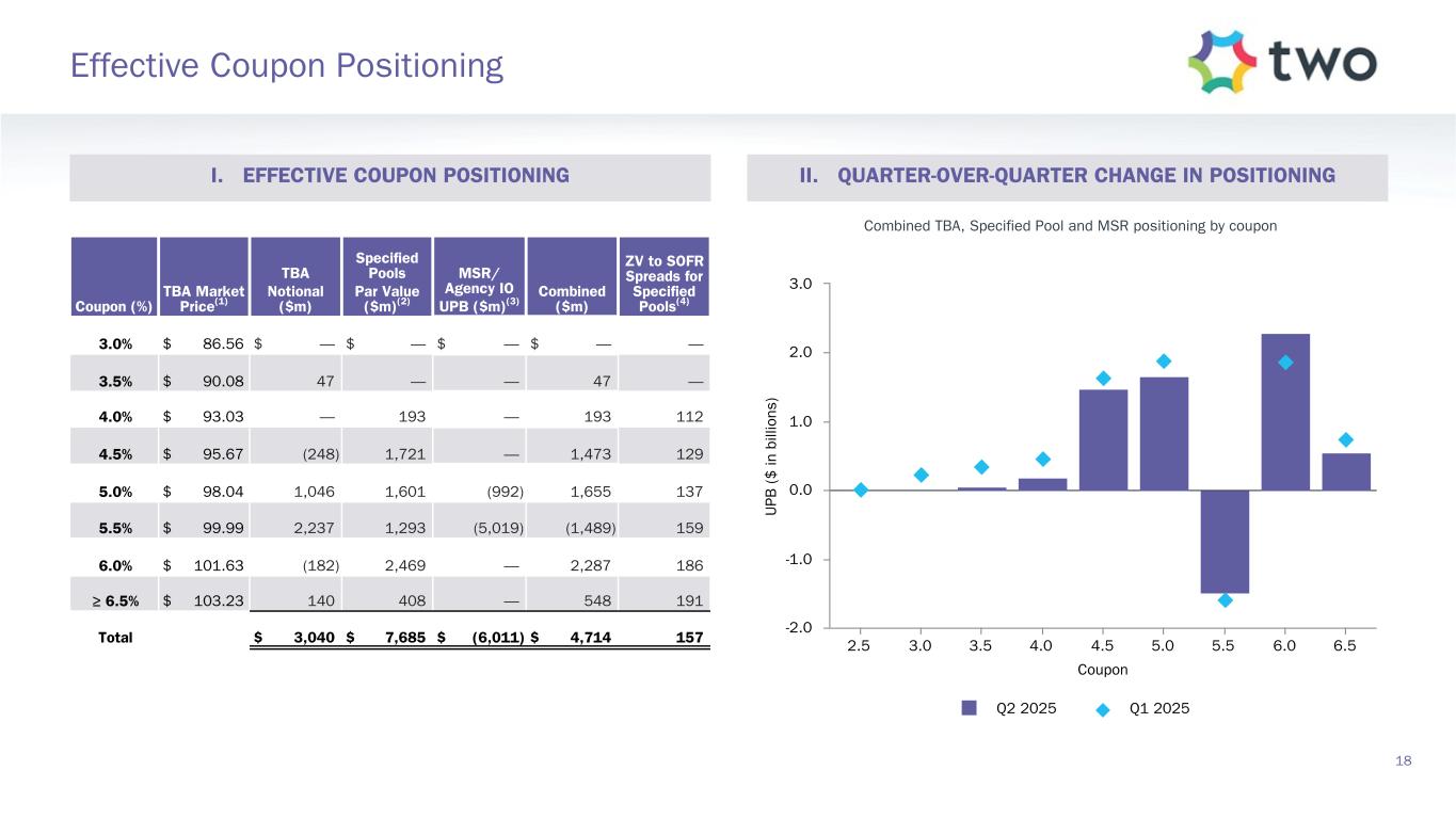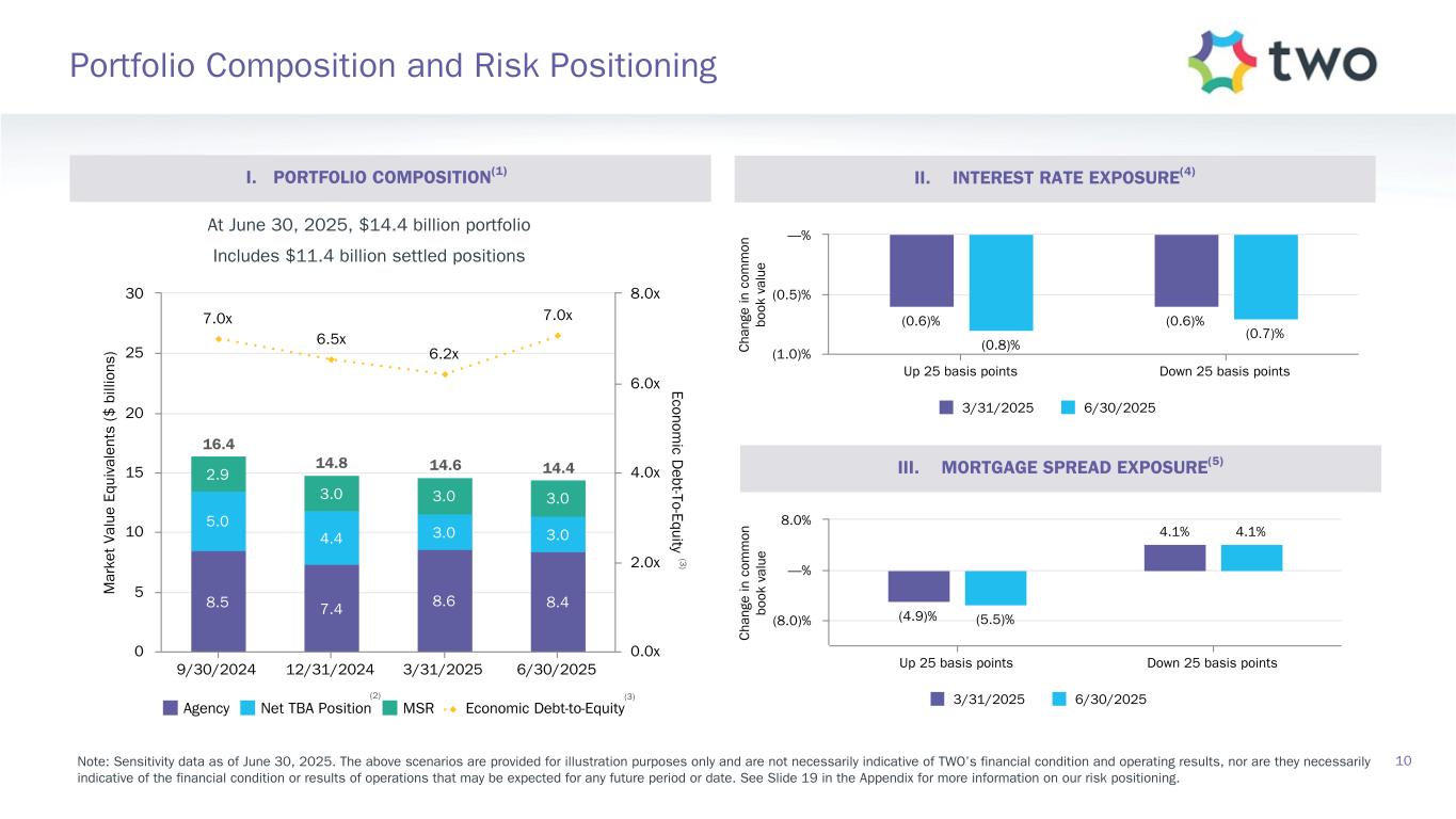 Note: Sensitivity data as of June 30, 2025. The above scenarios are provided for illustration purposes only and are not necessarily indicative of TWO’s financial condition and operating results, nor are they necessarily indicative of the financial condition or results of operations that may be expected for any future period or date. Book Value Exposure to Changes in Rates % Change in Common Book Value 2-Year Rate (basis points) 10-Year Rate (basis points) Agency P&I RMBS/TBA MSR/Agency IO RMBS(1) Other(2) Combined -25 0 Bull Steepener(3) 2.8 % 0.8 % (3.1) % 0.5 % 0 -25 Bull Flattener(4) 6.0 % (4.4) % (2.8) % (1.2) % -50 -50 Parallel Shift(5) 16.7 % (7.9) % (12.0) % (3.2) % -25 -25 Parallel Shift(5) 8.8 % (3.6) % (5.9) % (0.7) % 0 0 Base — % — % — % — % +25 +25 Parallel Shift(5) (9.7) % 3.2 % 5.8 % (0.8) % +50 +50 Parallel Shift(5) (20.2) % 5.8 % 11.3 % (3.1) % +25 0 Bear Flattener(3) (2.7) % (1.0) % 2.9 % (0.8) % 0 +25 Bear Steepener(4) (7.0) % 4.2 % 2.8 % — % Book Value Exposure to Current Coupon Spread(6) % Change in Common Book Value Parallel Shift in Spreads (basis points) Agency P&I RMBS/TBA MSR/Agency IO RMBS(1) Combined -25 8.4 % (4.3) % 4.1 % 0 — % — % — % +25 (9.4) % 3.9 % (5.5) % 19 Risk Positioning