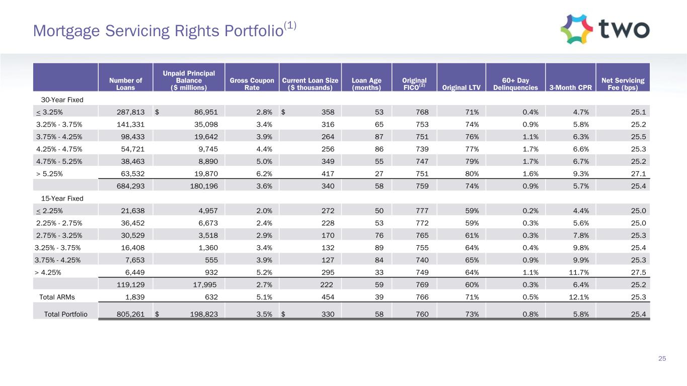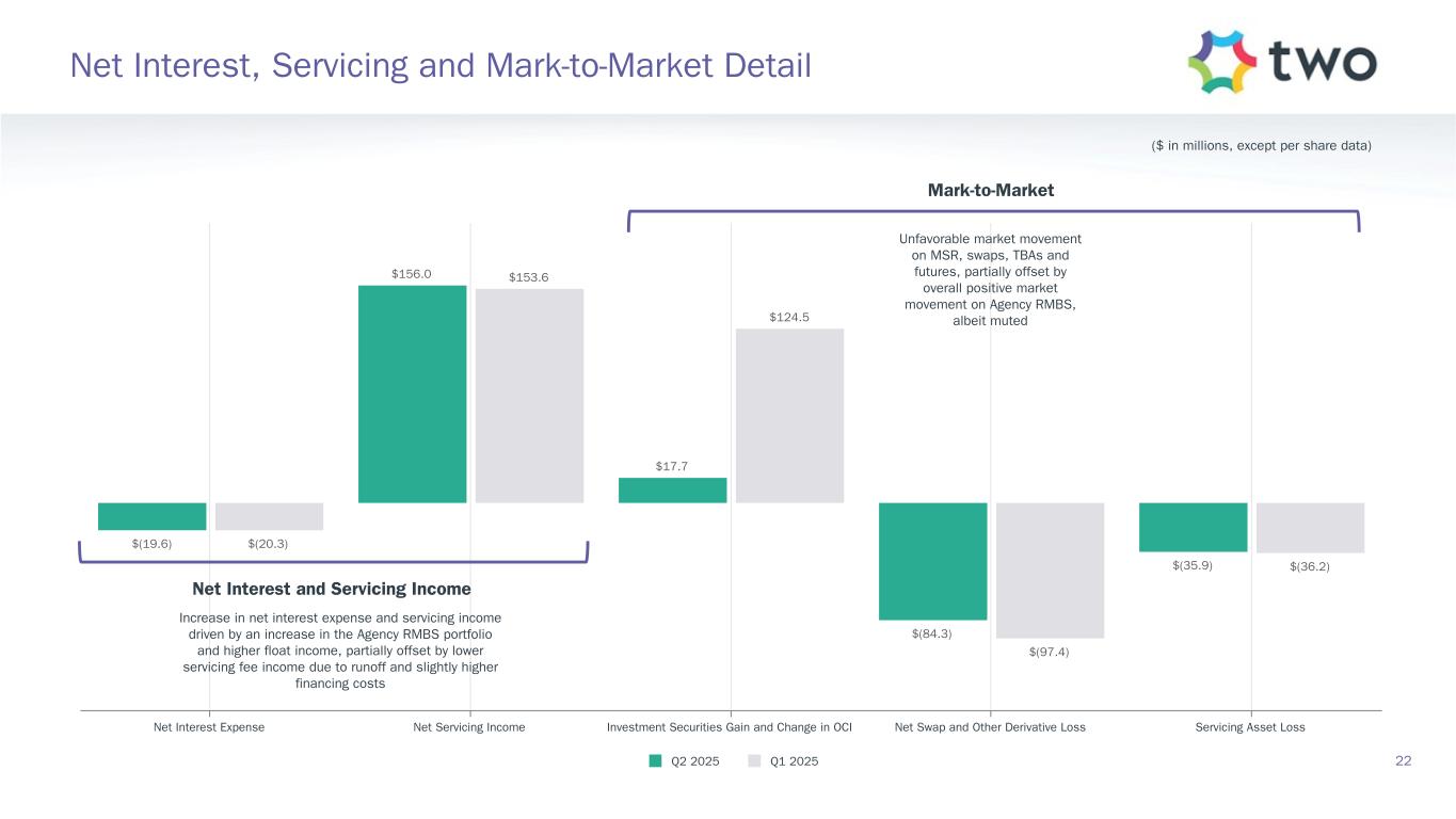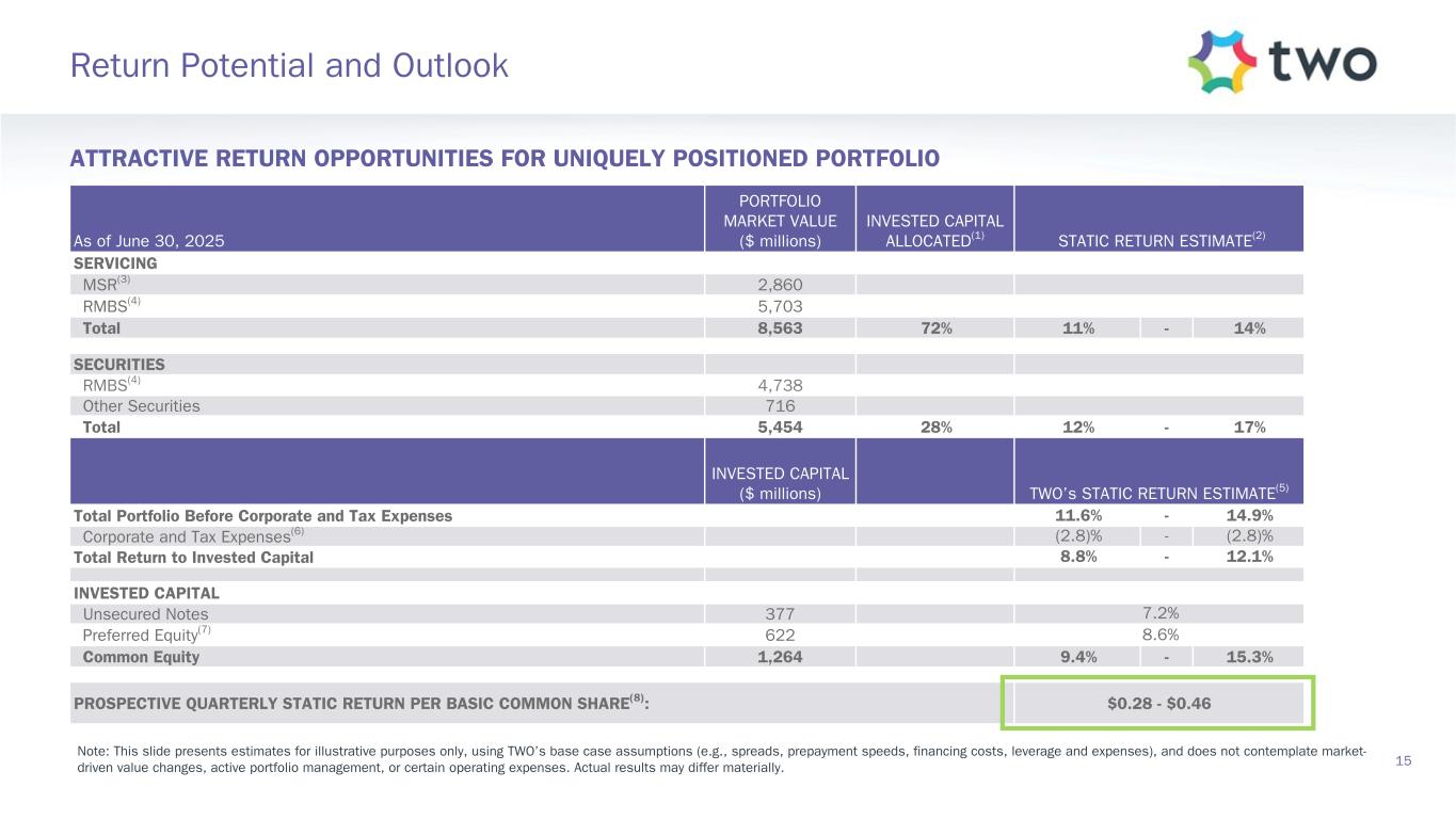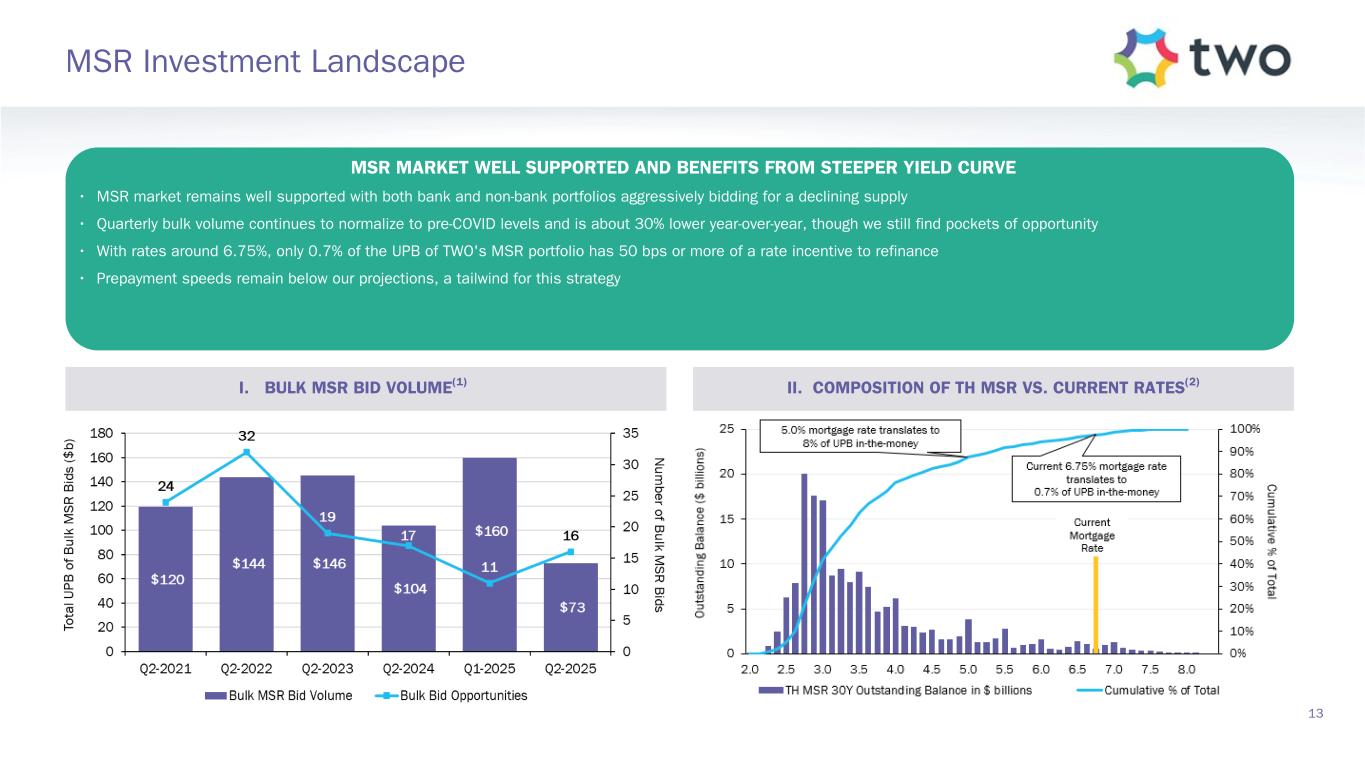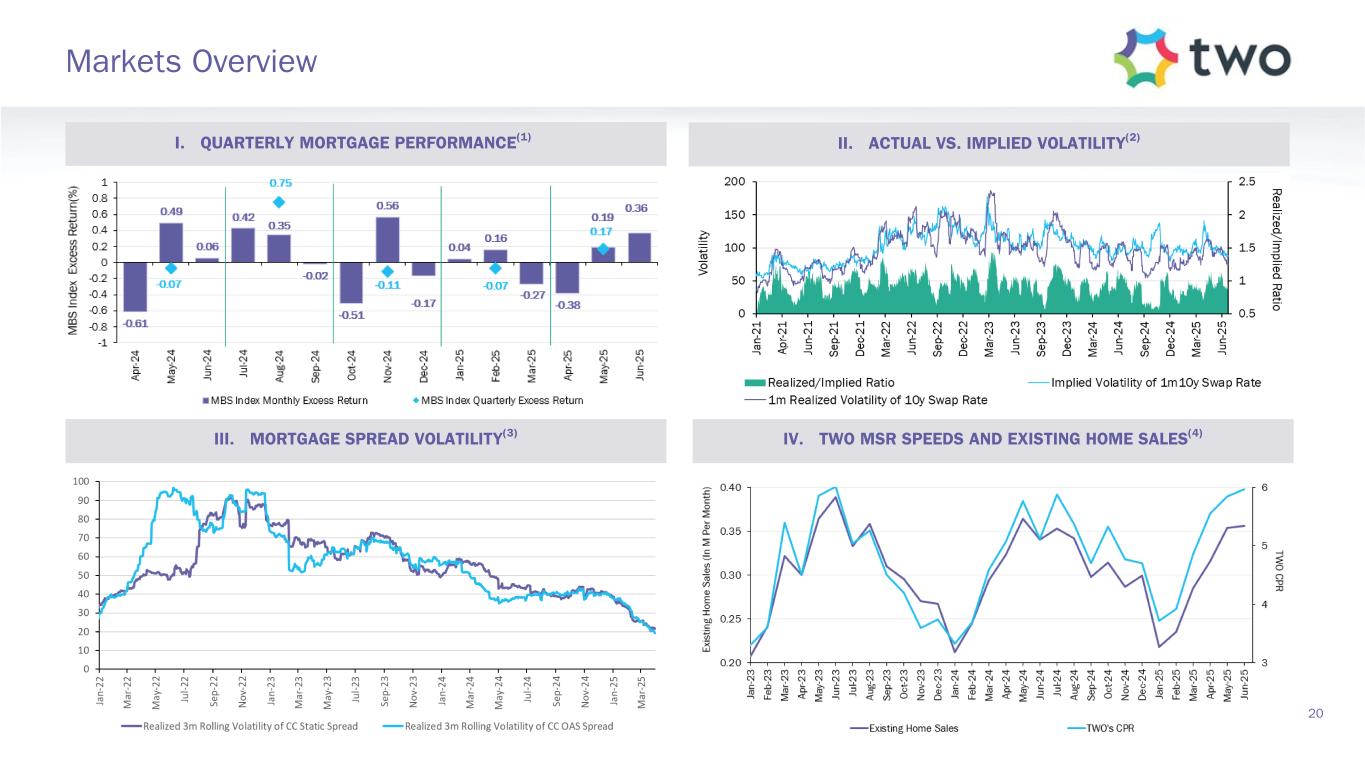Note: Sensitivity data as of June 30, 2025. The above scenarios are provided for illustration purposes only and are not necessarily indicative of TWO’s financial condition and operating results, nor are they necessarily indicative of the financial condition or results of operations that may be expected for any future period or date. Book Value Exposure to Changes in Rates % Change in Common Book Value 2-Year Rate (basis points) 10-Year Rate (basis points) Agency P&I RMBS/TBA MSR/Agency IO RMBS(1) Other(2) Combined -25 0 Bull Steepener(3) 2.8 % 0.8 % (3.1) % 0.5 % 0 -25 Bull Flattener(4) 6.0 % (4.4) % (2.8) % (1.2) % -50 -50 Parallel Shift(5) 16.7 % (7.9) % (12.0) % (3.2) % -25 -25 Parallel Shift(5) 8.8 % (3.6) % (5.9) % (0.7) % 0 0 Base — % — % — % — % +25 +25 Parallel Shift(5) (9.7) % 3.2 % 5.8 % (0.8) % +50 +50 Parallel Shift(5) (20.2) % 5.8 % 11.3 % (3.1) % +25 0 Bear Flattener(3) (2.7) % (1.0) % 2.9 % (0.8) % 0 +25 Bear Steepener(4) (7.0) % 4.2 % 2.8 % — % Book Value Exposure to Current Coupon Spread(6) % Change in Common Book Value Parallel Shift in Spreads (basis points) Agency P&I RMBS/TBA MSR/Agency IO RMBS(1) Combined -25 8.4 % (4.3) % 4.1 % 0 — % — % — % +25 (9.4) % 3.9 % (5.5) % 19 Risk Positioning
