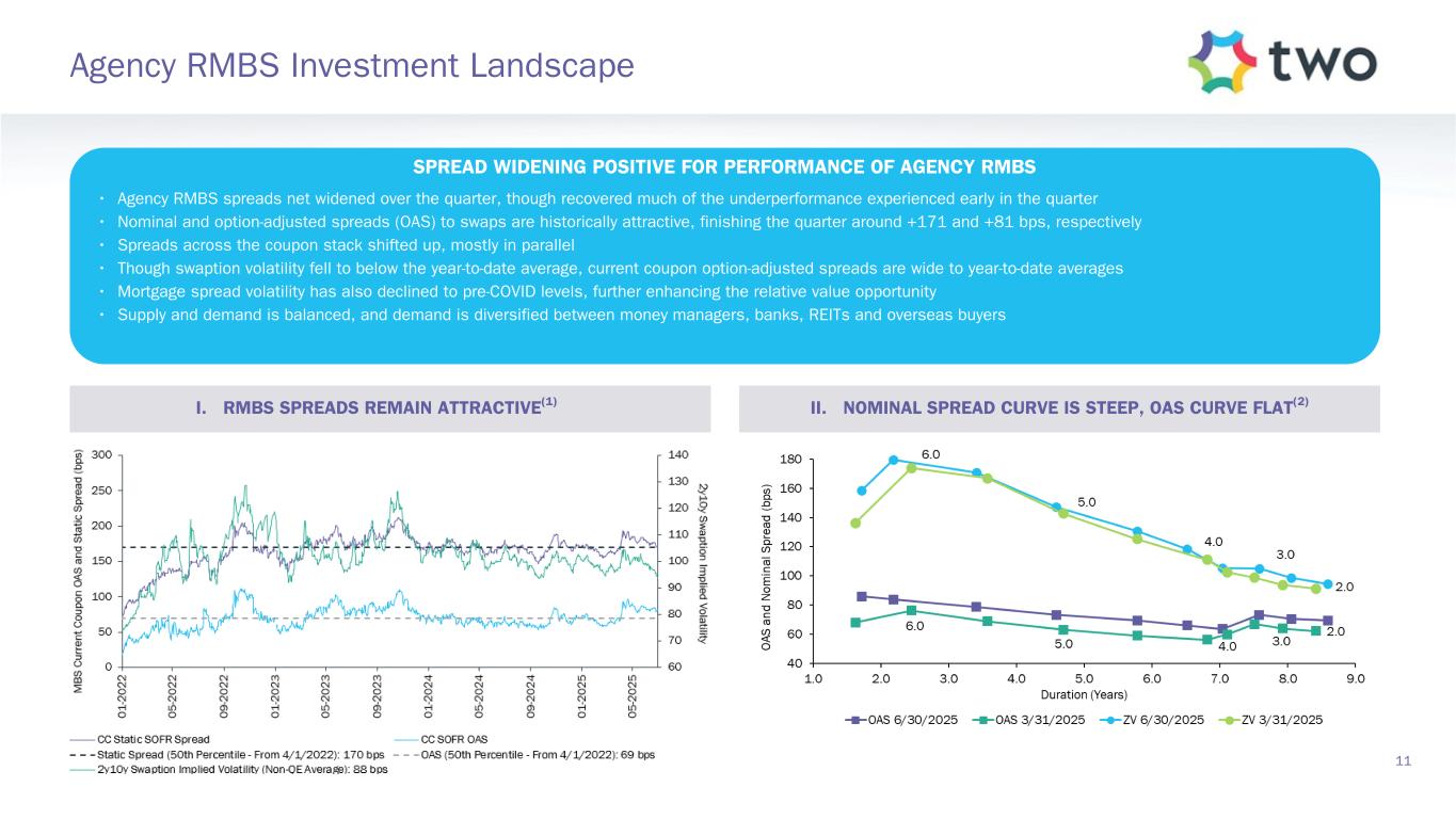 At June 30, 2025, $14.4 billion portfolio Includes $11.4 billion settled positions M ar ke t Va lu e Eq ui va le nt s ($ b ill io ns ) Econom ic D ebt-To-Equity 8.5 7.4 8.6 8.4 5.0 4.4 3.0 3.0 2.9 3.0 3.0 3.0 7.0x 6.5x 6.2x 7.0x Agency Net TBA Position MSR Economic Debt-to-Equity 9/30/2024 12/31/2024 3/31/2025 6/30/2025 0 5 10 15 20 25 30 0.0x 2.0x 4.0x 6.0x 8.0x (3) (3 ) (2) 14.414.6 16.4 14.8 Note: Sensitivity data as of June 30, 2025. The above scenarios are provided for illustration purposes only and are not necessarily indicative of TWO’s financial condition and operating results, nor are they necessarily indicative of the financial condition or results of operations that may be expected for any future period or date. See Slide 19 in the Appendix for more information on our risk positioning. C ha ng e in c om m on bo ok v al ue (0.6)% (0.6)% (0.8)% (0.7)% 3/31/2025 6/30/2025 Up 25 basis points Down 25 basis points (1.0)% (0.5)% —% C ha ng e in c om m on bo ok v al ue (4.9)% 4.1% (5.5)% 4.1% 3/31/2025 6/30/2025 Up 25 basis points Down 25 basis points (8.0)% —% 8.0% 10 Portfolio Composition and Risk Positioning I. PORTFOLIO COMPOSITION(1) II. INTEREST RATE EXPOSURE(4) III. MORTGAGE SPREAD EXPOSURE(5)