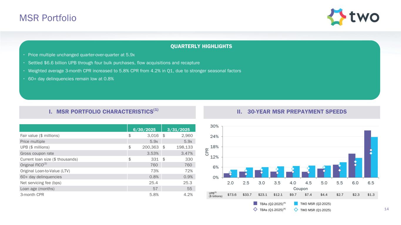 UPB(3) ($ billions) $73.6 $33.7 $23.1 $12.1 $9.7 $7.4 $4.4 $2.7 $2.3 $1.3 QUARTERLY HIGHLIGHTS • Price multiple unchanged quarter-over-quarter at 5.9x • Settled $6.6 billion UPB through four bulk purchases, flow acquisitions and recapture • Weighted average 3-month CPR increased to 5.8% CPR from 4.2% in Q1, due to stronger seasonal factors • 60+ day delinquencies remain low at 0.8% 6/30/2025 3/31/2025 Fair value ($ millions) $ 3,016 $ 2,960 Price multiple 5.9x 5.9x UPB ($ millions) $ 200,363 $ 198,133 Gross coupon rate 3.53 % 3.47 % Current loan size ($ thousands) $ 331 $ 330 Original FICO(2) 760 760 Original Loan-to-Value (LTV) 73 % 72 % 60+ day delinquencies 0.8 % 0.9 % Net servicing fee (bps) 25.4 25.3 Loan age (months) 57 55 3-month CPR 5.8 % 4.2 % TWO MSR (Q2-2025)TBAs (Q2-2025)(4) TBAs (Q1-2025)(4) TWO MSR (Q1-2025) 14 MSR Portfolio I. MSR PORTFOLIO CHARACTERISTICS(1) II. 30-YEAR MSR PREPAYMENT SPEEDS