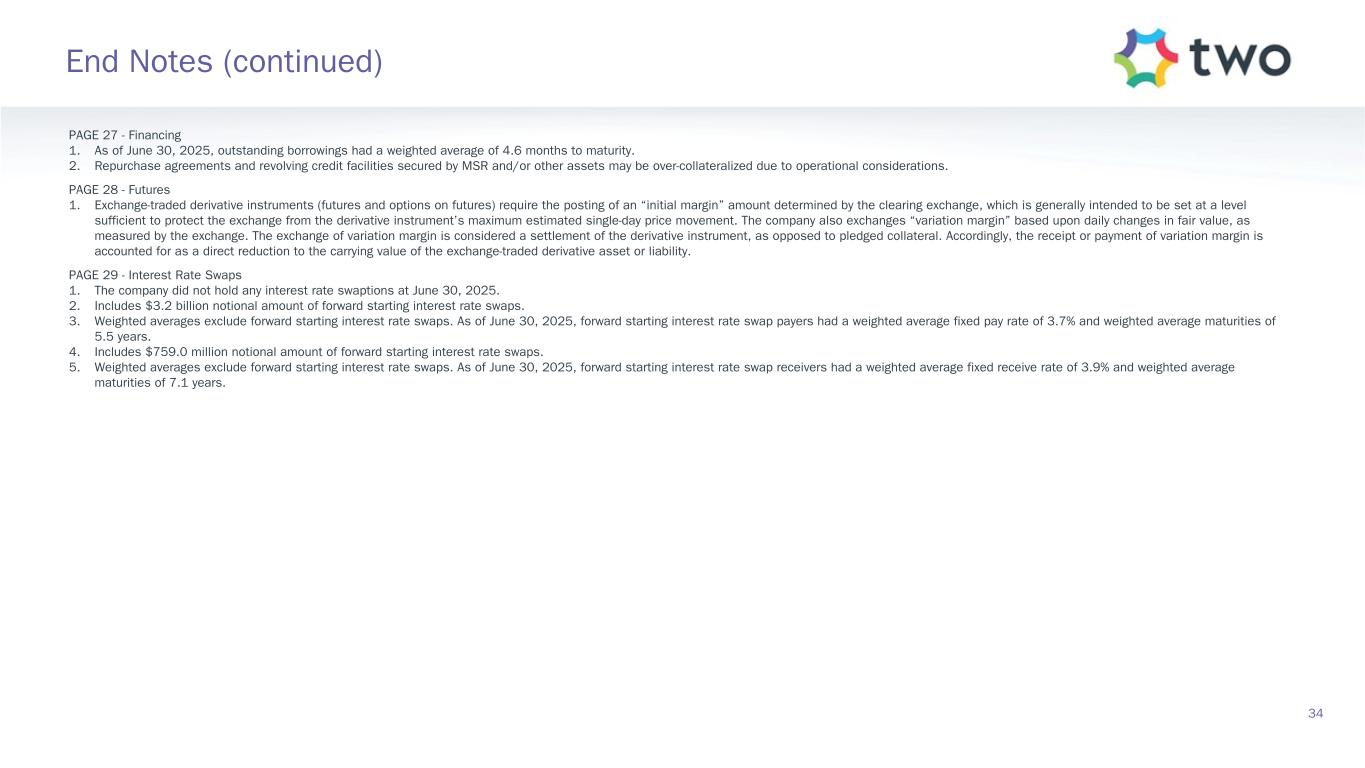PAGE 27 - Financing 1. As of June 30, 2025, outstanding borrowings had a weighted average of 4.6 months to maturity. 2. Repurchase agreements and revolving credit facilities secured by MSR and/or other assets may be over-collateralized due to operational considerations. PAGE 28 - Futures 1. Exchange-traded derivative instruments (futures and options on futures) require the posting of an “initial margin” amount determined by the clearing exchange, which is generally intended to be set at a level sufficient to protect the exchange from the derivative instrument’s maximum estimated single-day price movement. The company also exchanges “variation margin” based upon daily changes in fair value, as measured by the exchange. The exchange of variation margin is considered a settlement of the derivative instrument, as opposed to pledged collateral. Accordingly, the receipt or payment of variation margin is accounted for as a direct reduction to the carrying value of the exchange-traded derivative asset or liability. PAGE 29 - Interest Rate Swaps 1. The company did not hold any interest rate swaptions at June 30, 2025. 2. Includes $3.2 billion notional amount of forward starting interest rate swaps. 3. Weighted averages exclude forward starting interest rate swaps. As of June 30, 2025, forward starting interest rate swap payers had a weighted average fixed pay rate of 3.7% and weighted average maturities of 5.5 years. 4. Includes $759.0 million notional amount of forward starting interest rate swaps. 5. Weighted averages exclude forward starting interest rate swaps. As of June 30, 2025, forward starting interest rate swap receivers had a weighted average fixed receive rate of 3.9% and weighted average maturities of 7.1 years. 34 End Notes (continued)
